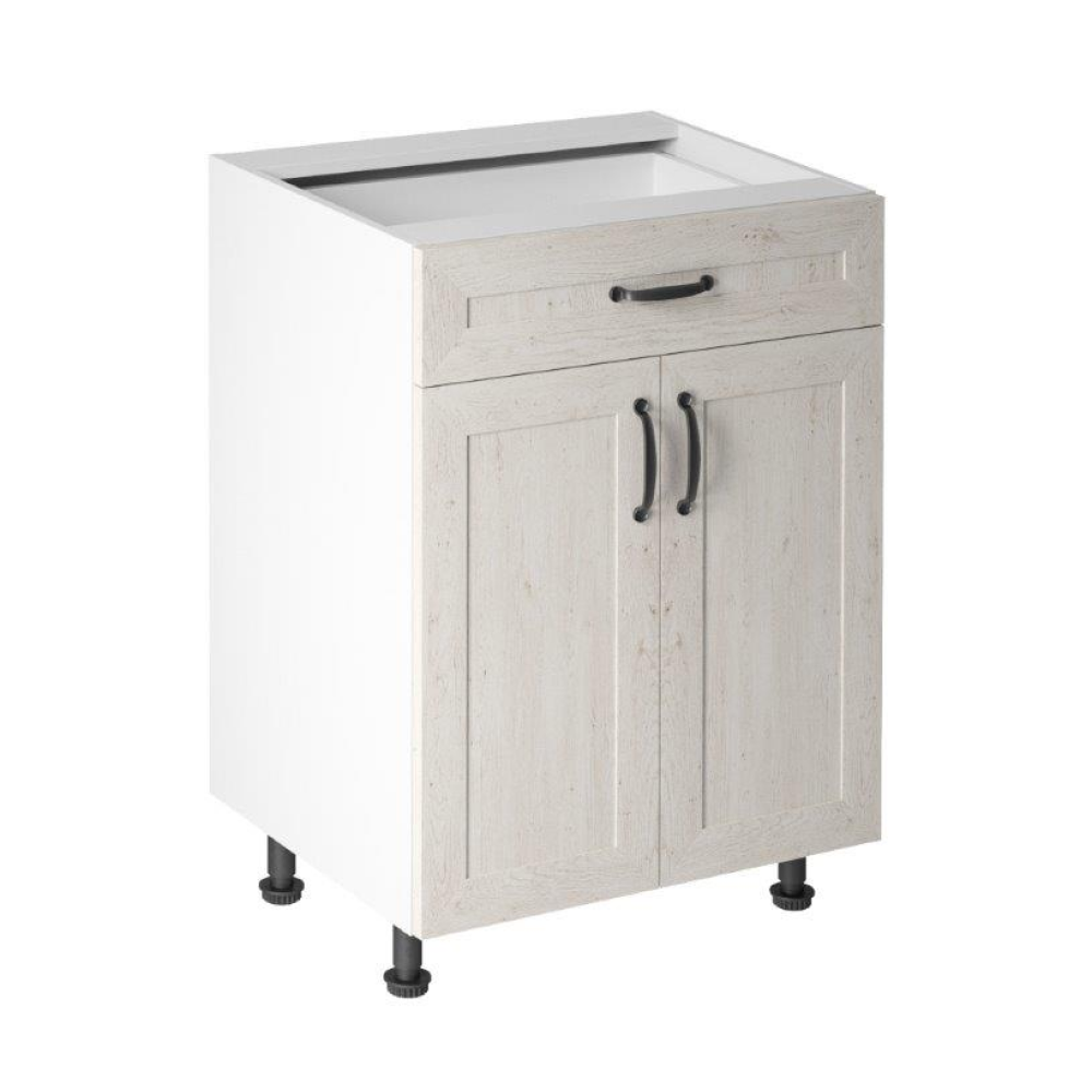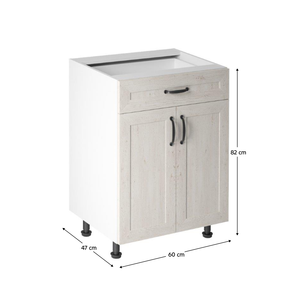 Spodná skrinka, ROYAL D60S1Materiál: DTD laminovanáFarba: biela/sosna nordickáRozmery (ŠxHxV): 60x47x82 cmHĺbka skrinky s pracovnou doskou: 60 cmHrúbka materiálu: 15 mmS jednou policouS dvierkami1 šuplíkSystém tichého zatvárania dvierokKovová úchytkaDodávané bez pracovnej dosky a bez soklaDodávané v demonteSpodné skrinky ku kuchyni ROYAL sú dodávané bez pracovnej dosky a bez sokla. Pracovnú dosku v prevedení Rockpile v hrúbke 3,8 cm je možné doobjednať v cene 59 Eur/1 bm (len do vypredania zásob) a Dub Porterhouse tmavý v hrúbke 3,8 cm v cene 59 Eur/1 bm. Ku každej dolnej skrinke, okrem rohových skriniek D25PZ, je potrebné doobjednať aj sokel v prevedení dub divoký v cene 10 ur/1 bm a 2 kusy úchytov na sokel v cene 1 Eur/2 ks. Objednávku vpíšte do poznámky v objednávkovom formulári.