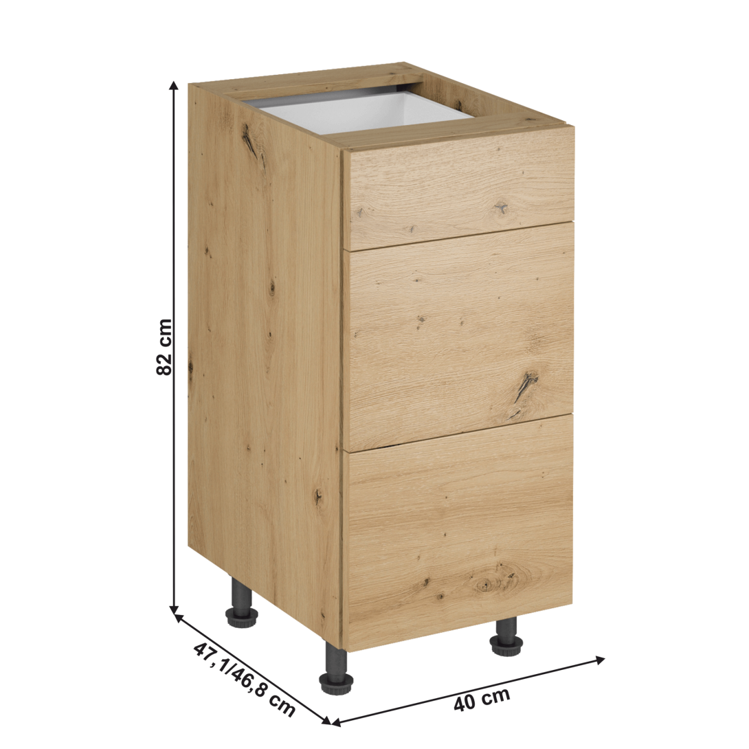 Materiál: DTD laminovanáFarba: dub artisanRozmery (ŠxHxV): 40x47,1/46,8x82 cmHrúbka materiálu dvierka (dub artisan): 1,5 cmHrúbka materiálu dvierka (sivá MDF): 1,8 cmBez pracovnej doskyBez spodnej lištyOtváranie PUSH OPENDodávané v demonteCena sektorových skriniek je uvádzaná bez pracovnej dosky a spodnej lišty. Cena za pracovnú dosku dub artisan je 56 Eur/bm - hrúbka 38 mm, cena za pracovnú dosku čierny vulkán je 59 Eur/bm - hrúbka 38 mm. Možnosť dokúpenia spodnej lišty dub artisan v rozmere 1 m za cenu 10 Eur alebo v rozmere 2 m za cenu 17 Eur. Ku každej dolnej skrinke je potrebné doobjednať 2 ks úchytov na sokel cena 1 Eur/2 ks.Pri skrinkách D60S3 a D40S3 je potrebné si vybrať skrinku s úchytkou alebo systémom Push Open.