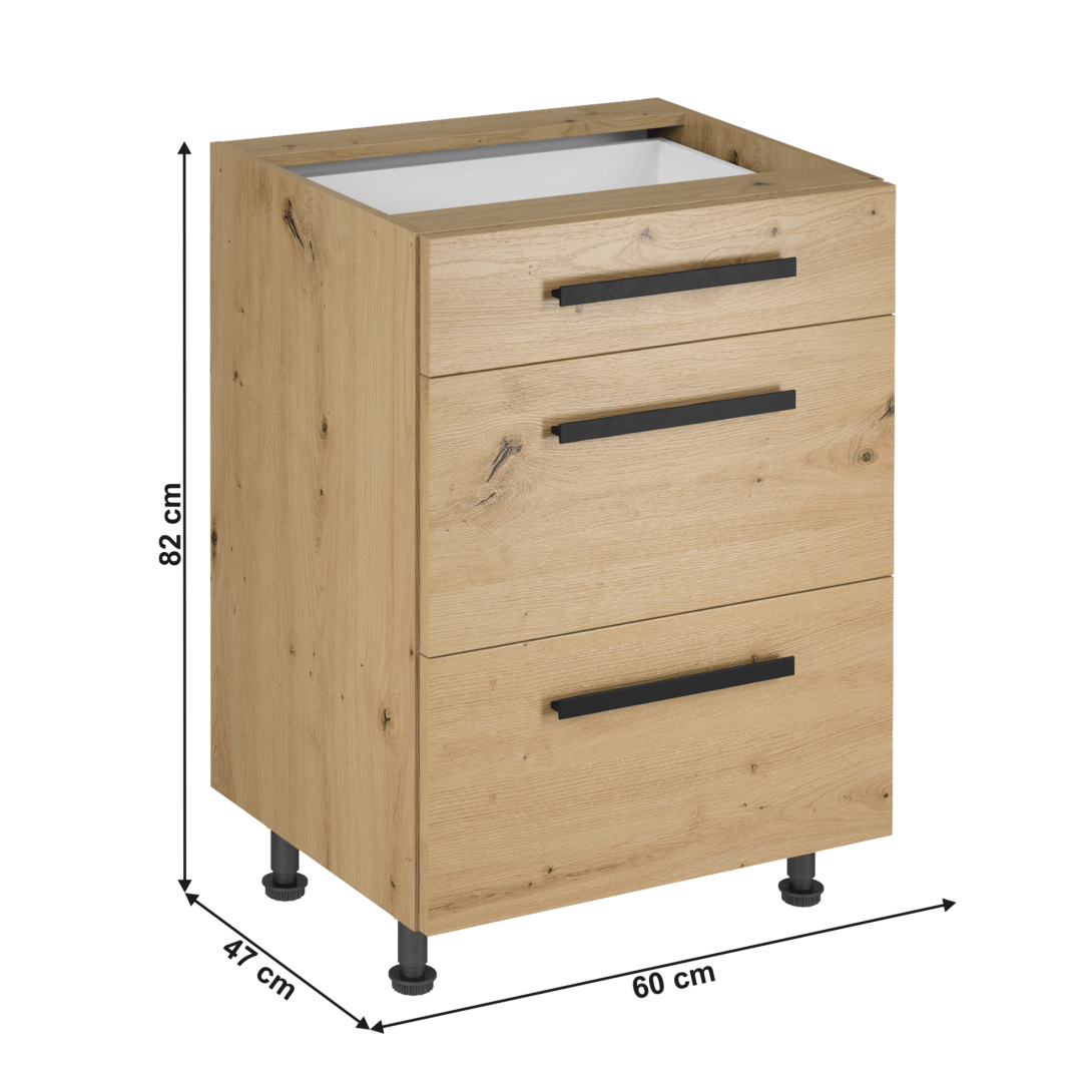 Materiál: DTD laminovanáFarba: dub artisanRozmery (ŠxHxV): 60x47x82 cmHrúbka materiálu dvierka (dub artisan): 1,5 cmHrúbka materiálu dvierka (sivá MDF): 1,8 cmOtváranie pomocou úchytiek3 šuplíkyBez pracovnej doskyBez spodnej lištyDodávané v demonteCena sektorových skriniek je uvádzaná bez pracovnej dosky a spodnej lišty. Cena za pracovnú dosku dub artisan je 56 Eur/bm - hrúbka 38 mm, cena za pracovnú dosku čierny vulkán je 59 Eur/bm - hrúbka 38 mm. Možnosť dokúpenia spodnej lišty dub artisan v rozmere 1 m za cenu 10 Eur alebo v rozmere 2 m za cenu 17 Eur. Ku každej dolnej skrinke je potrebné doobjednať 2 ks úchytov na sokel cena 1 Eur/2 ks. Pri skrinkách D60S3 a D40S3 je potrebné si vybrať skrinku s úchytkou alebo systémom Push Open.