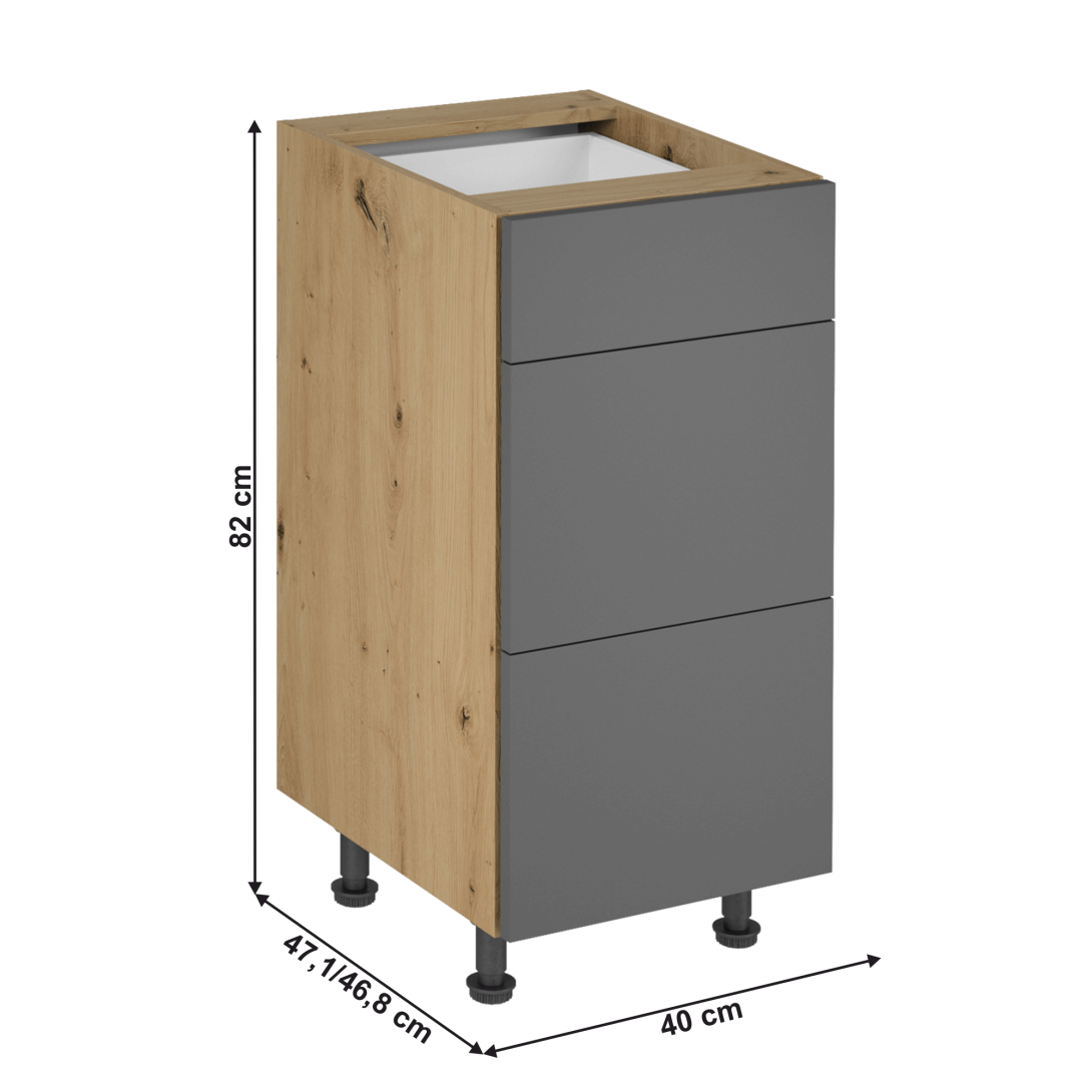 Materiál: DTD laminovanáFarba: dub artisan/sivý matRozmery (ŠxHxV): 40x47,1/46,8x82 cmHrúbka materiálu dvierka (dub artisan): 1,5 cmHrúbka materiálu dvierka (sivá MDF): 1,8 cmOtváranie PUSH OPENBez pracovnej doskyBez spodnej lištyFarba vnútornej strany: bielaDodávané v demonteCena sektorových skriniek je uvádzaná bez pracovnej dosky a spodnej lišty. Cena za pracovnú dosku dub artisan je 56 Eur/bm - hrúbka 38 mm, cena za pracovnú dosku čierny vulkán je 59 Eur/bm - hrúbka 38 mm. Možnosť dokúpenia spodnej lišty dub artisan v rozmere 1 m za cenu 10 Eur alebo v rozmere 2 m za cenu 17 Eur. Ku každej dolnej skrinke je potrebné doobjednať 2 ks úchytov na sokel cena 1 Eur/2 ks. Pri skrinkách D60S3 a D40S3 je potrebné si vybrať skrinku s úchytkou alebo systémom Push Open.