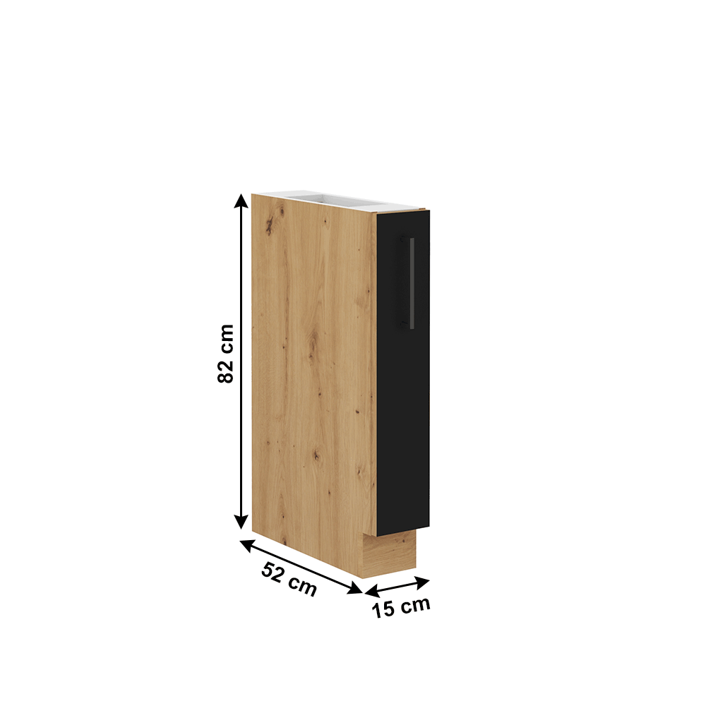 Materiál: laminovaná DTDFarba: čierny mat/dub artisanRozmery (ŠxHxV): 15x52x82 cmHrúbka materiálu: 1,6 cm1 dvierkaS úchytkouÚchytka: 19,2 cmTichý doraz dvierokS výsuvným kovovým košíkomVnútro skrinky je bieleS dolnou lištou/soklomBez pracovnej doskyPracovnú dosku dub artisan s hrúbkou 3,8cm je možné doobjednať za cenu 65 EURModerný dynamický dizajnDodávané v demonteMožnosť dokúpiť univerzálny drez LAY ON.