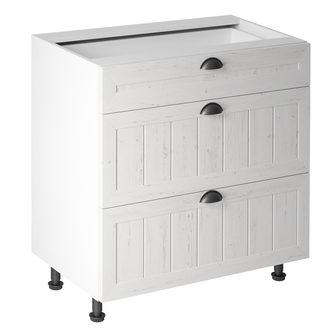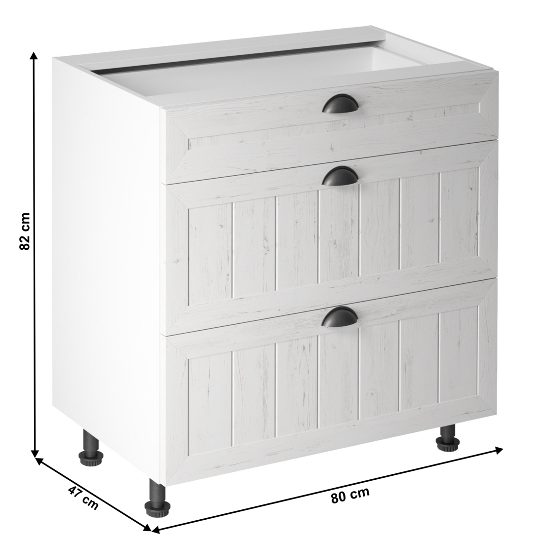 Spodná skrinka s tromi šuplíkmi ku kuchyni PROVANCEPrevedenie: DTD laminovaná/MDFFarba: biela/sosna andersenRozmery (ŠxHxV): 80x47x82 cmHrúbka materiálu: 15 mmCena sektorových skriniek je uvádzaná bez pracovnej dosky a spodnej lišty. Cena za pracovnú dosku dub lancelot je 56 Eur/bm - hrúbka 38 mm, cena za spodnú lištu je 14 Eur. Ku každej dolnej skrinke okrem D25PZ, je potrebné doobjednať 2 ks úchytov na sokel cena 1 Eur/2 ks.