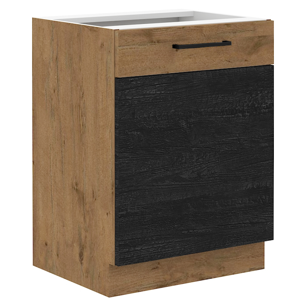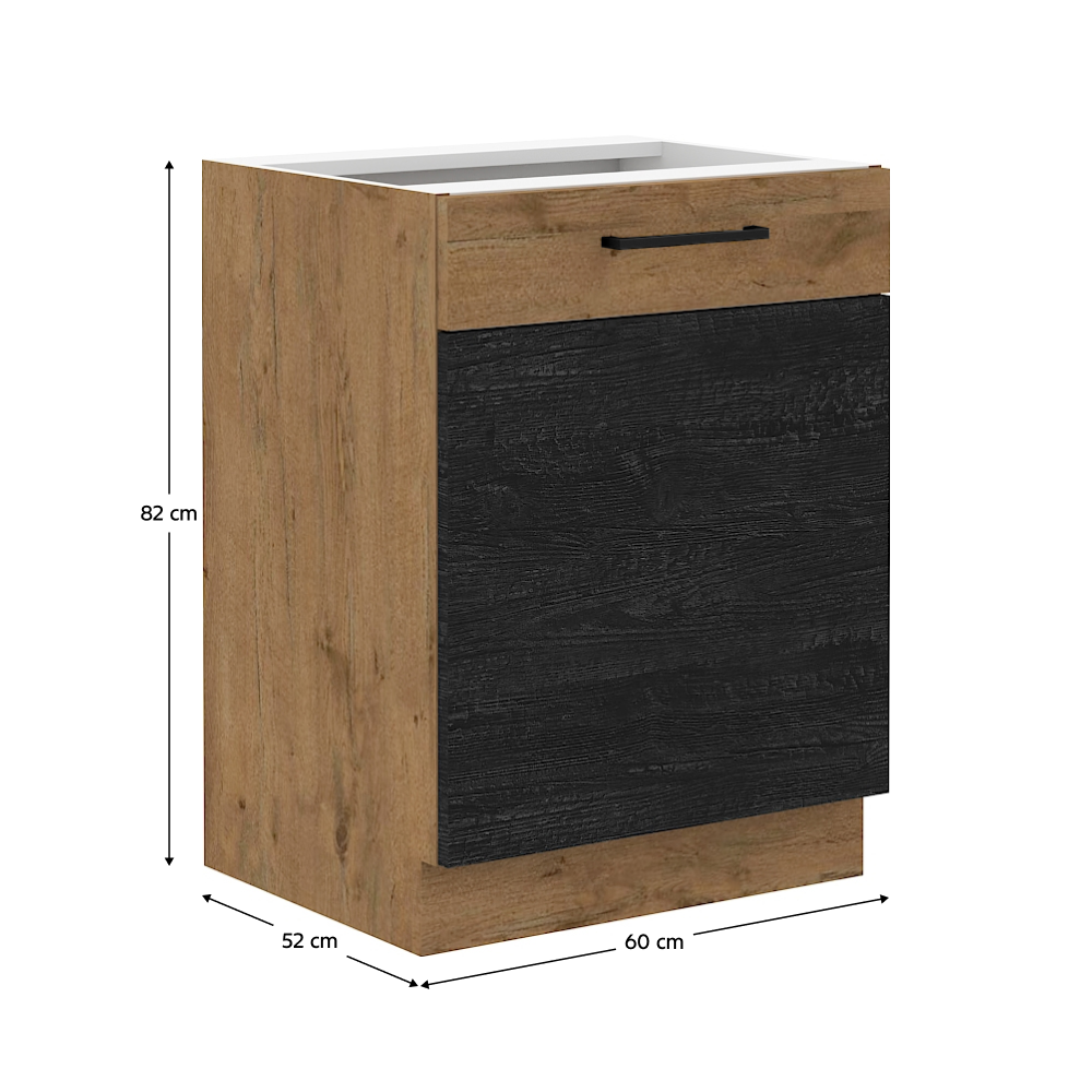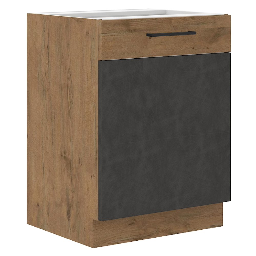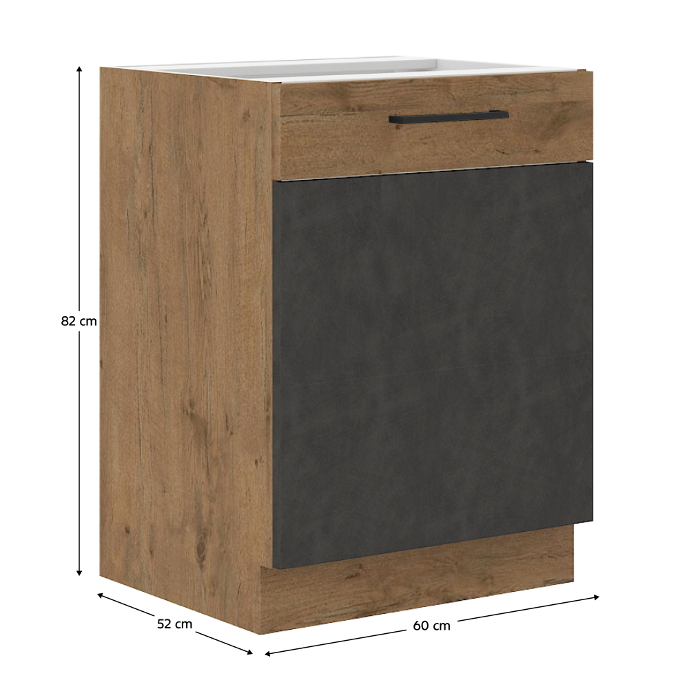 Spodná skrinka VEGA 60 D 1F BBMateriál: DTD laminovanáFarba: sivá matná/dub lancelotRozmery (ŠxHxV): 60x52x82 cmSkrinka bez pracovnej doskySystém tichého zatvárania dvierokVrátane spodnej lištyDodávané v demonteSpodné skrinky sú dodávané vrátane dolnej lišty, bez pracovnej dosky.Možnosť dokúpenia pracovnej dosky dub lancelot v cene 55 Eur/bm. Možnosť dokúpiť univerzálny drez LAY ON.