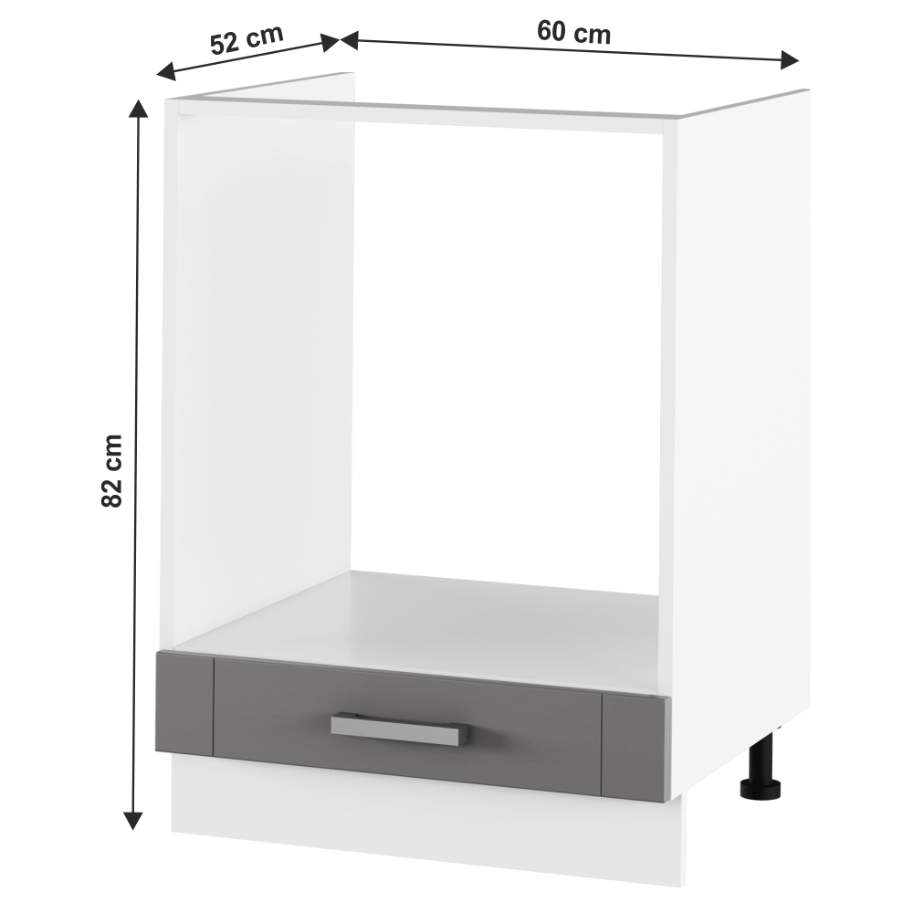 Materiál skrinka: DTD laminovaná/MDFFarba skrinka: tmavosivá/bielaMateriál úchytky: kovFarba úchytky: matný chrómRozmery (ŠxHxV): 60x52x82 cmRozmery na rúru (ŠxV): 56,8x59 cmHrúbka materiálu: 16 mmS nožičkamiS kovovou úchytkouDodávané so soklomPlastové nožičkyKvalitný slovenský výrobokDodávané v demonteSkrinky sú dodávané bez pracovnej dosky. Pracovnú dosku v prevedení gold craft oak v hrúbke 38 mm je možné doobjednať v cene 45 Eur/1 bm.