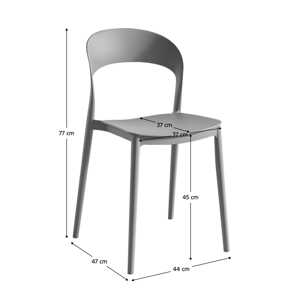 Materiál: plastFarba: siváRozmery (ŠxHxV): 44x47x77 cmVýška sedu: 45 cmHĺbka sedu: 37 cmŠírka sedu: 37 cmStohovateľnáS UV filtromVhodná do interiéru a exteriéruNosnosť: 100 kgDodávané v monte