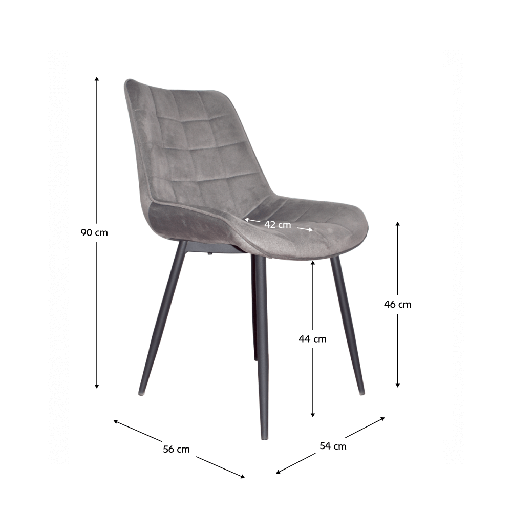 Materiál: látka Velvet/kovOderuodolnosť textílie podľa testu Martindale: 80 000 oderovFarba: sivá/čierny náterRozmery (ŠxHxV): 54x56x90cmVýška sedu : 46 cmHĺbka sedu : 42 cmNosnosť: 120 kgDekoratívne šitieZamatová látkaDodávané v demon