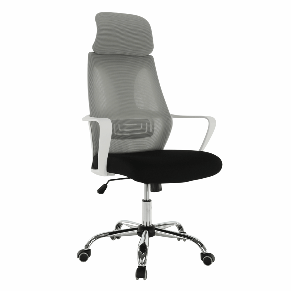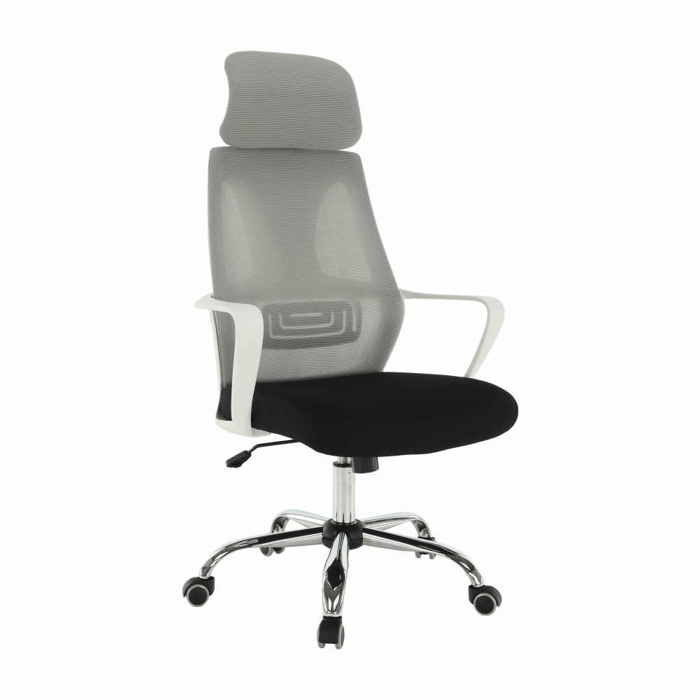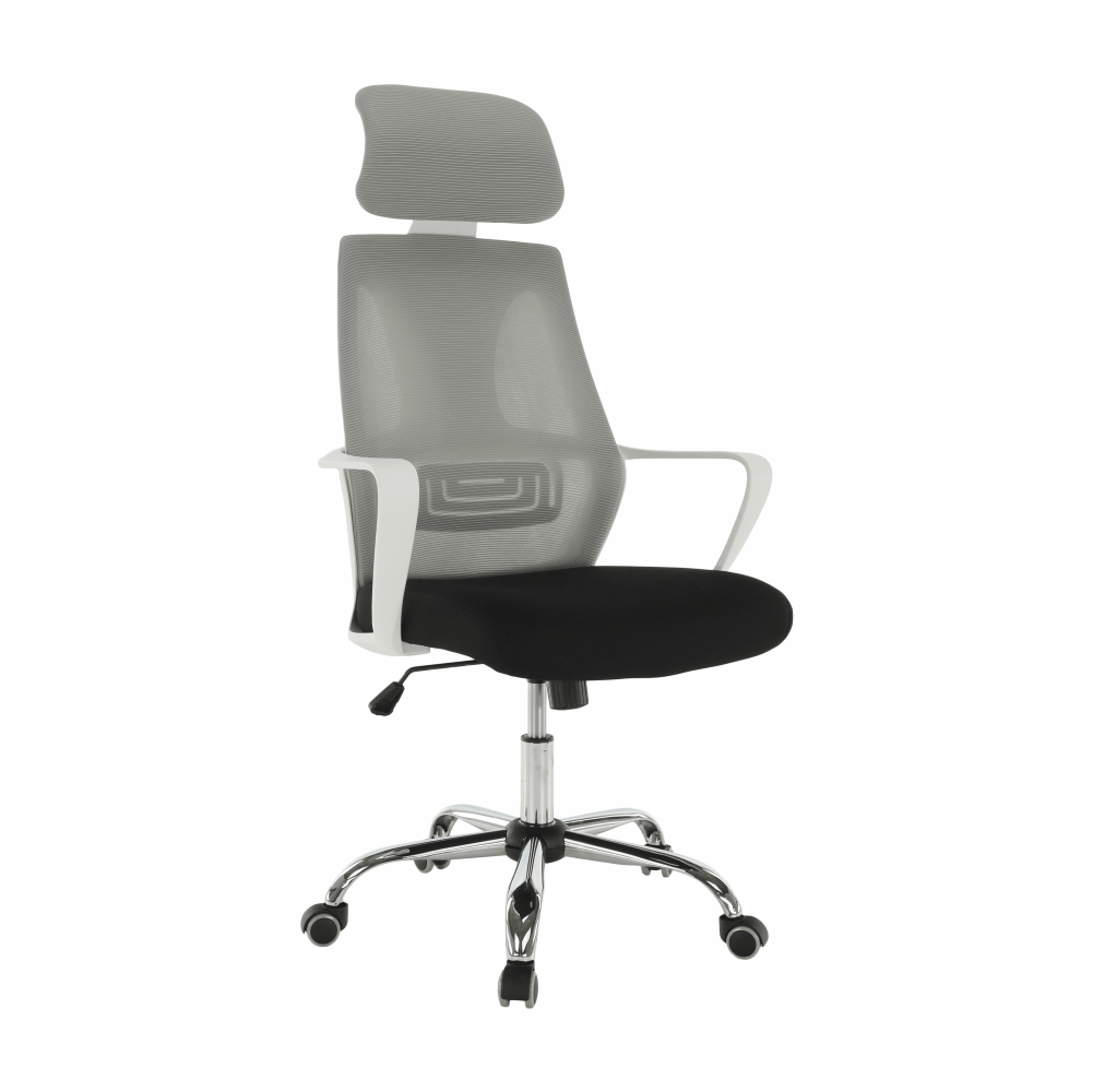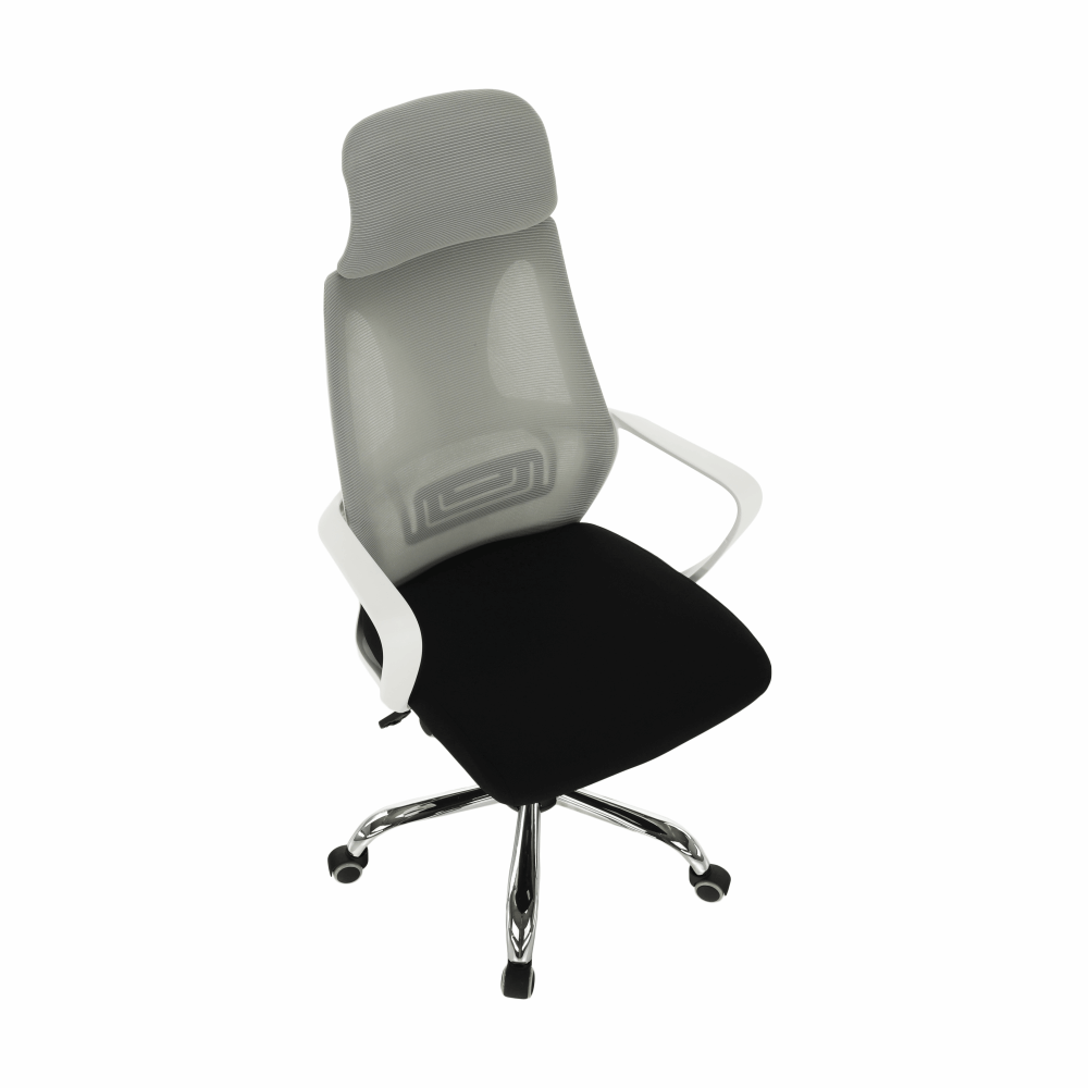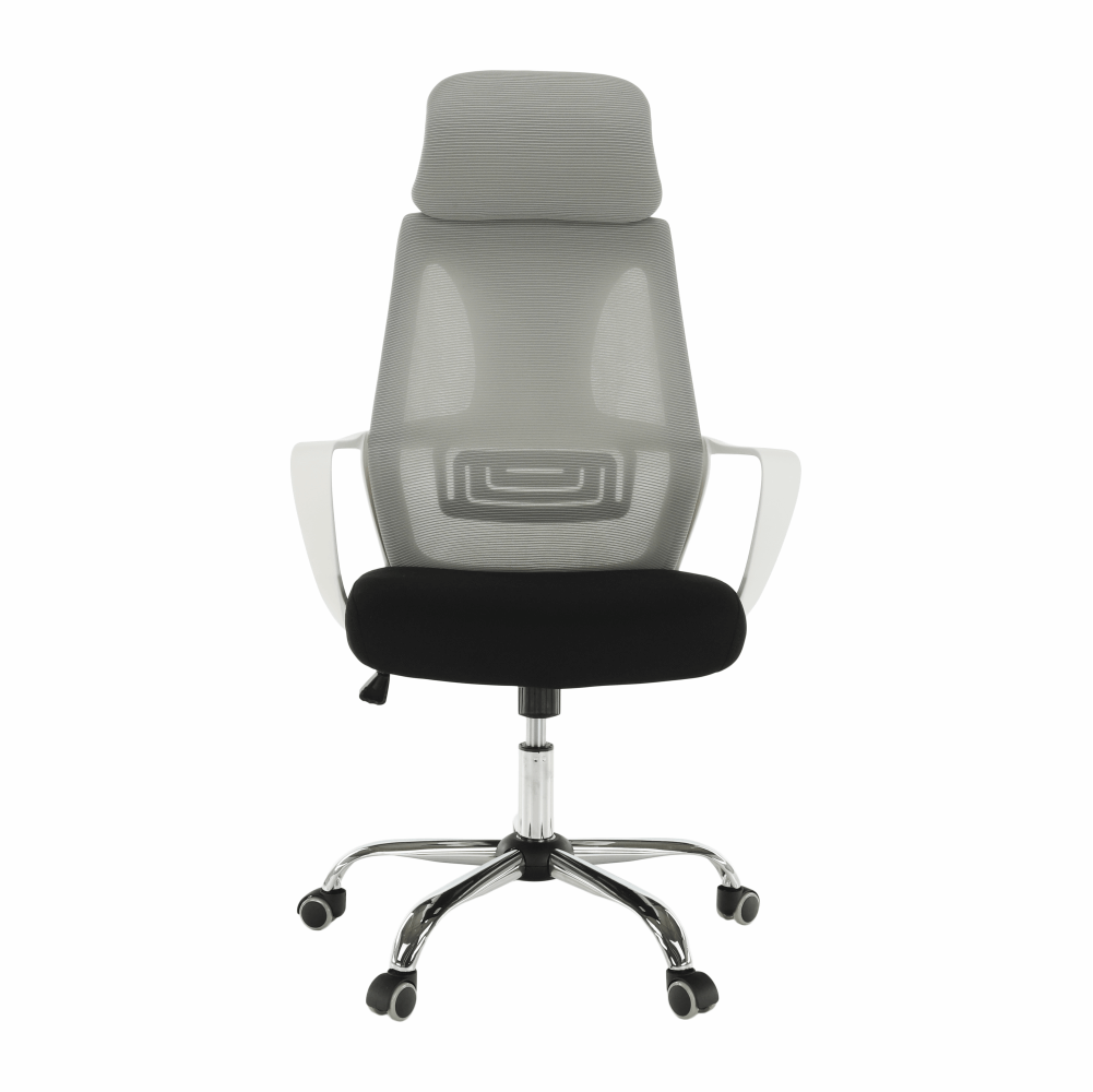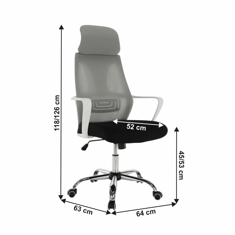 Materiál: látka/plast/kovOderuodolnosť textílie podľa testu Martindale: 90 000 oderovFarba: sivá/čierna/bielaRozmery (ŠxHxV): 64x63x118-126 cmNastaviteľná výška sedu : 45-53 cmHĺbka sedu : 52 cmŠírka sedu : 50 cmVýška chrbtovej opierky: 76-79,5 cmŠírka chrbtovej opierky: 49 cmNosnosť: 110 kgS opierkou hlavyS opierkami na rukyMechanizmus hojdaniaChrómová podstavaUniverzálne kolieska sú vhodné na mäkké aj tvrdé podlahyDodávané v demonte