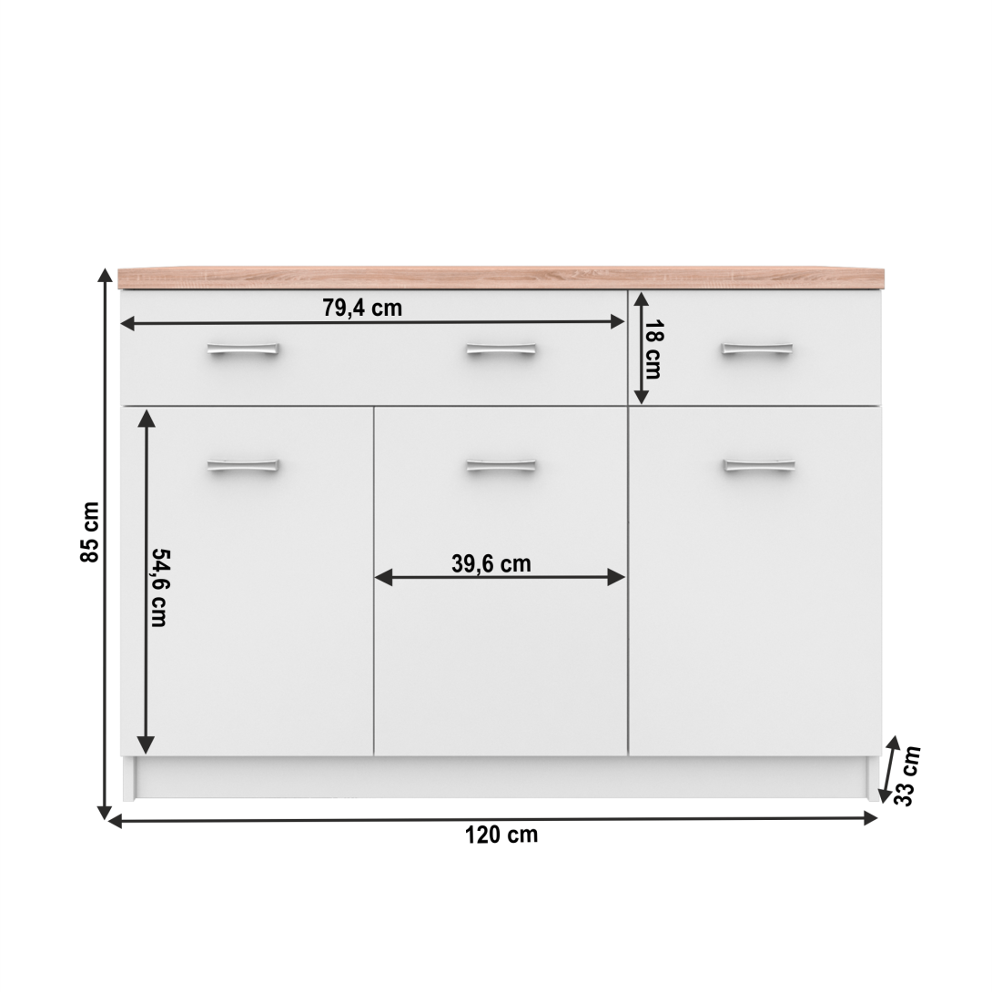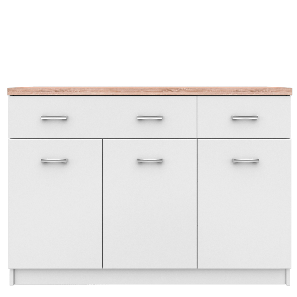Komoda 3D2S TOPTY Typ 07Materiál: DTD laminovanáPrevedenie: biela/dub sonomaRozmery (ŠxHxV): 120x33x85 cmHrúbka materiálu korpus: 16 mmHrúbka materiálu vrchnej dosky: 32 mmModerný sektorový systém vhodný na zariadenie kancelárií, pracovní, obývacích priestorov či predsiení