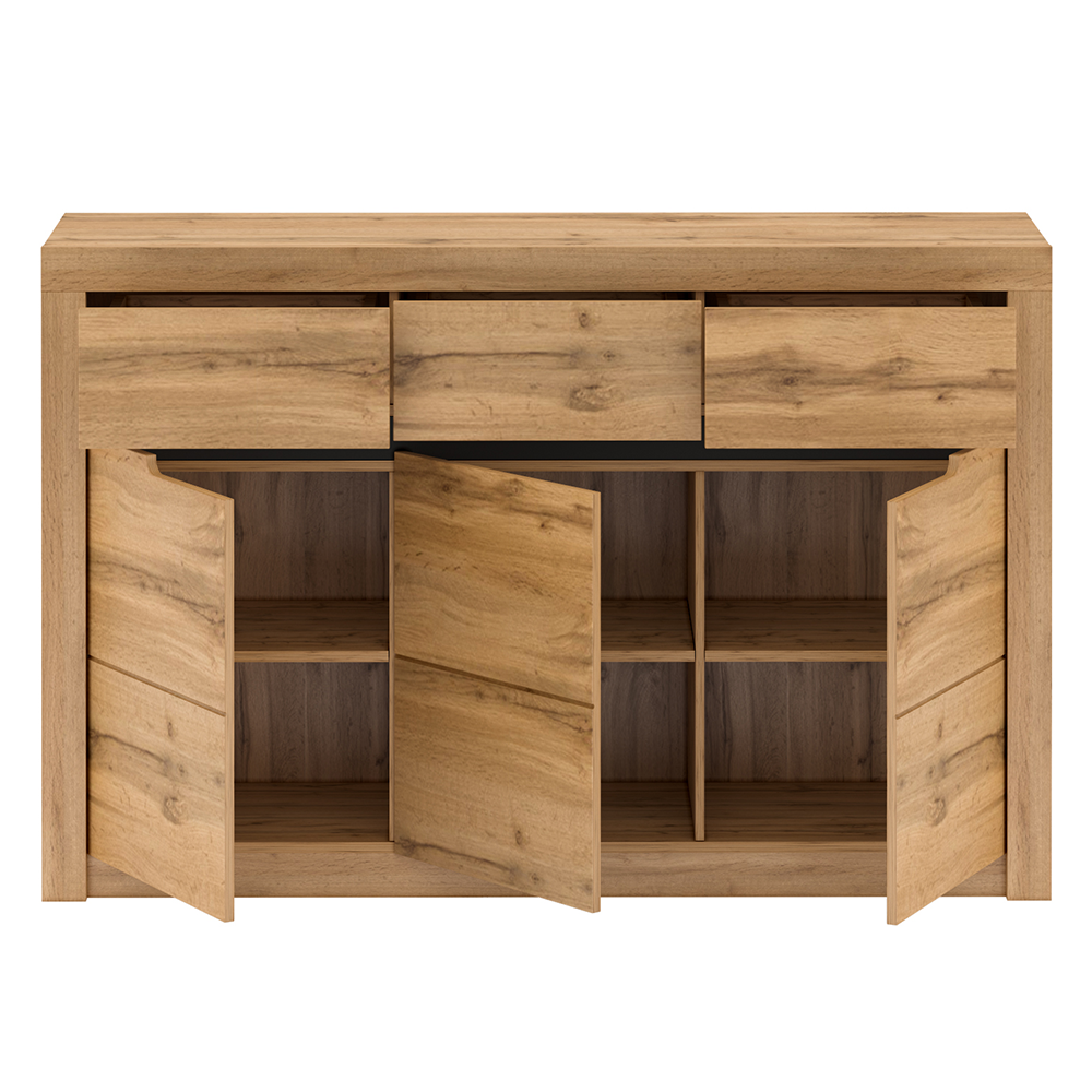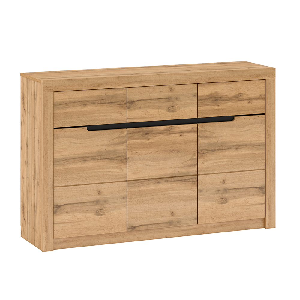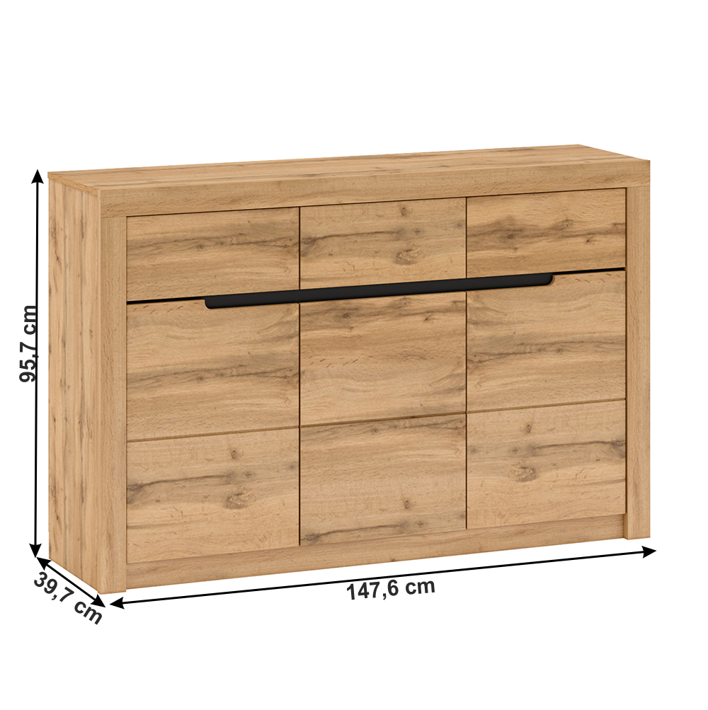 Materiál: DTD laminovaná/MDFFarba: dub wotanRozmery (ŠxHxV): 147,6x39,7x95,7 cmHrúbka materiálu korpus: 16 mmHrúbka materiálu dvierka: 19 mmTrojdverováS policamiTri šuplíkyDodávané v demonte