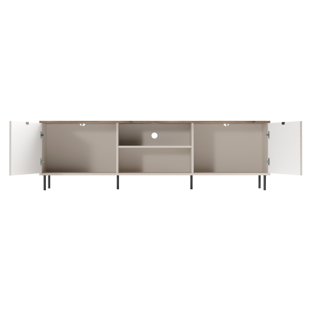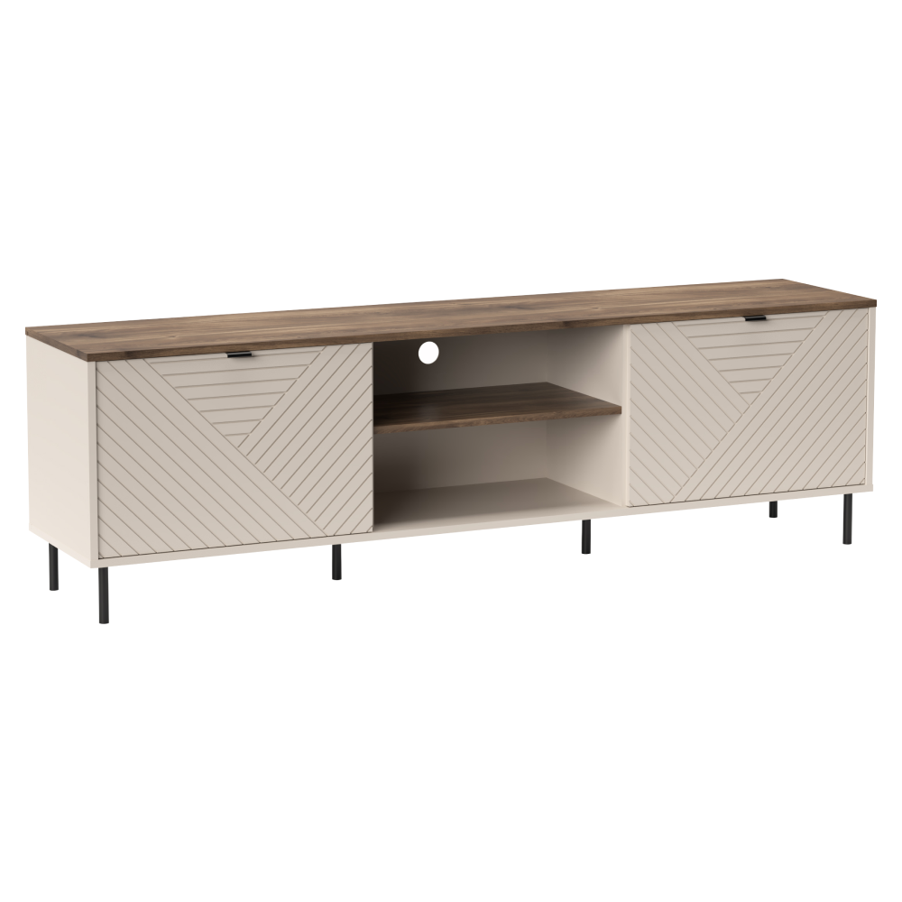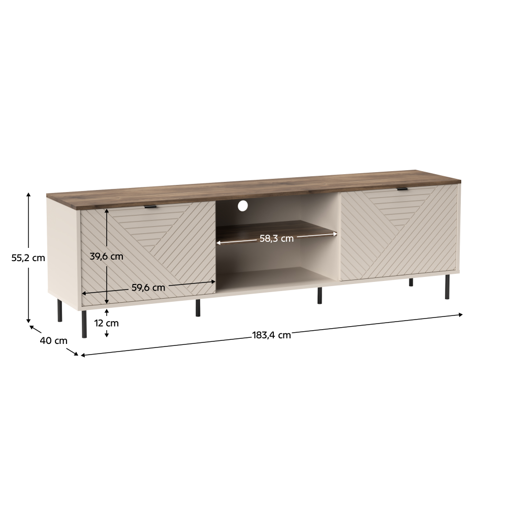 Materiál: laminovaná DTD/MDF/ABS hranyFarba: kašmír/dub castelloRozmery (ŠxHxV): 183,4x40x55,2 cmHrúbka materiálu: 1,6 cmDvojdverovýDve skrinkyRozmery skrinky (ŠxV): 59,6x39,6 cmPolicaŠírka police: 58,3 cmOtvorený úložný priestorOtvor na vývod káblovS úchytkamiMateriál úchytiek: kovFarba úchytiek: čiernaNa nožičkáchMateriál nožičiek: kovFarba nožičiek: čiernaVýška nožičiek: 12 cmNosnosť vrchnej dosky: 10 kgNosnosť police: 8 kgDekoratívne dvierkaModerný dizajnOdporúčame pripevniť k steneDodávané v demonte