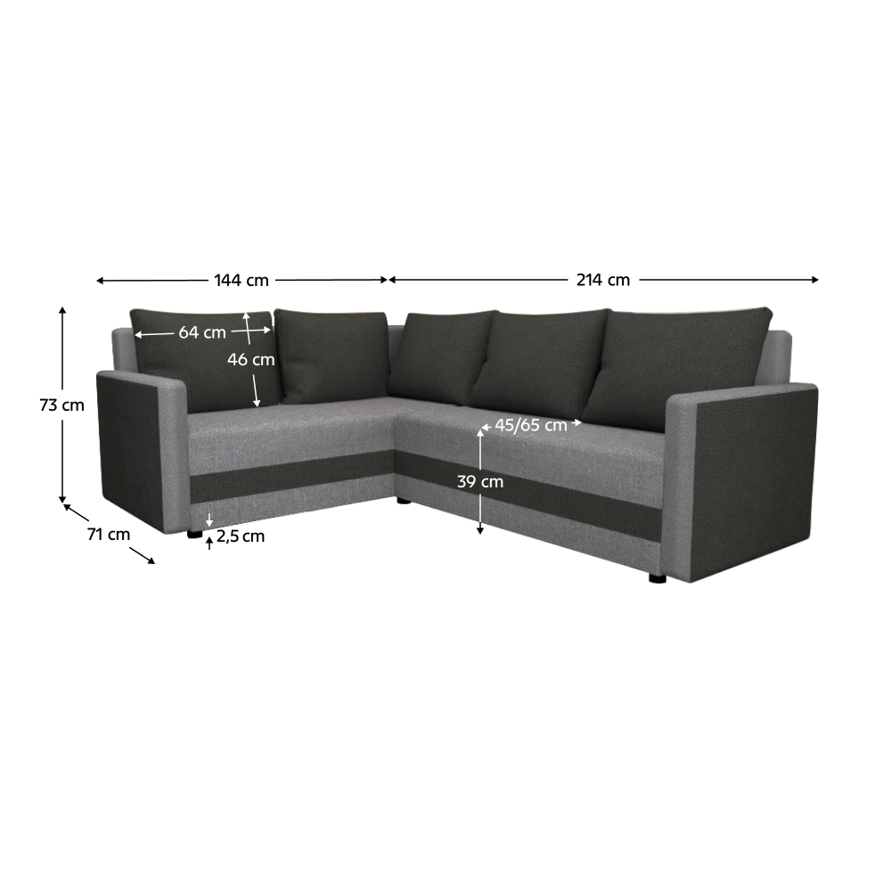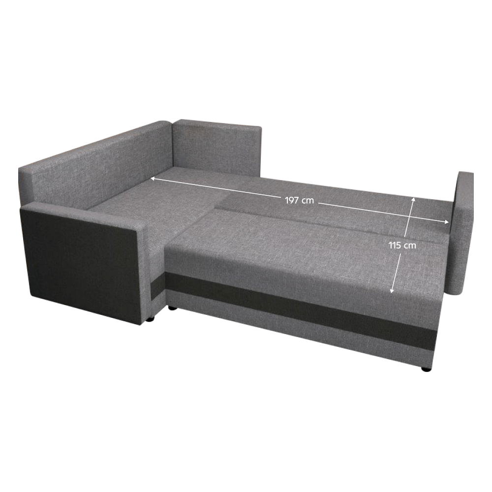 Materiál čalúnenie: látka Savana 14/21Oderuodolnosť textílie podľa testu Martindale: 80 000 oderovFarba čalúnenie: čierna/siváRozmery (ŠxHxV): 214x144/71x73 cmPlocha na spanie (ŠxD): 115x197 cmRozmery opierky na ruku (ŠxH): 10x75 cmVýška sedu: 39 cmHĺbka sedu: 45/65 cmNa plastových nožičkáchFarba nožičiek: čiernaVýška spodného priestoru od podlahy: 2,5 cmVýplň: pur penaRozkladaciaRohováUniverzálna (Ľ/P)S úložným priestoromDodávaná s piatimi vankúšmiRozmer vankúšov (ŠxH): 64x46 cmDodávané v demonte