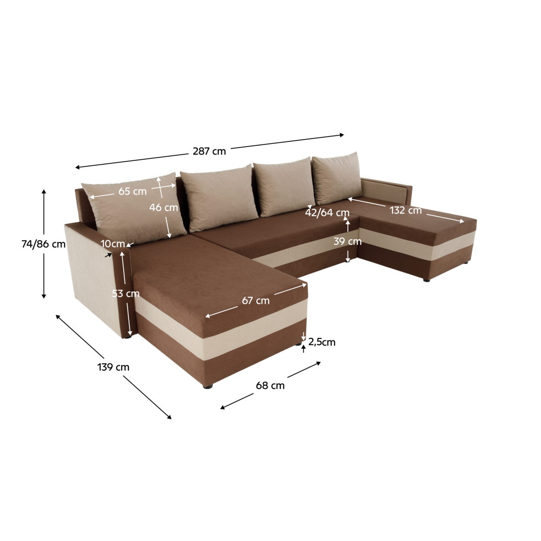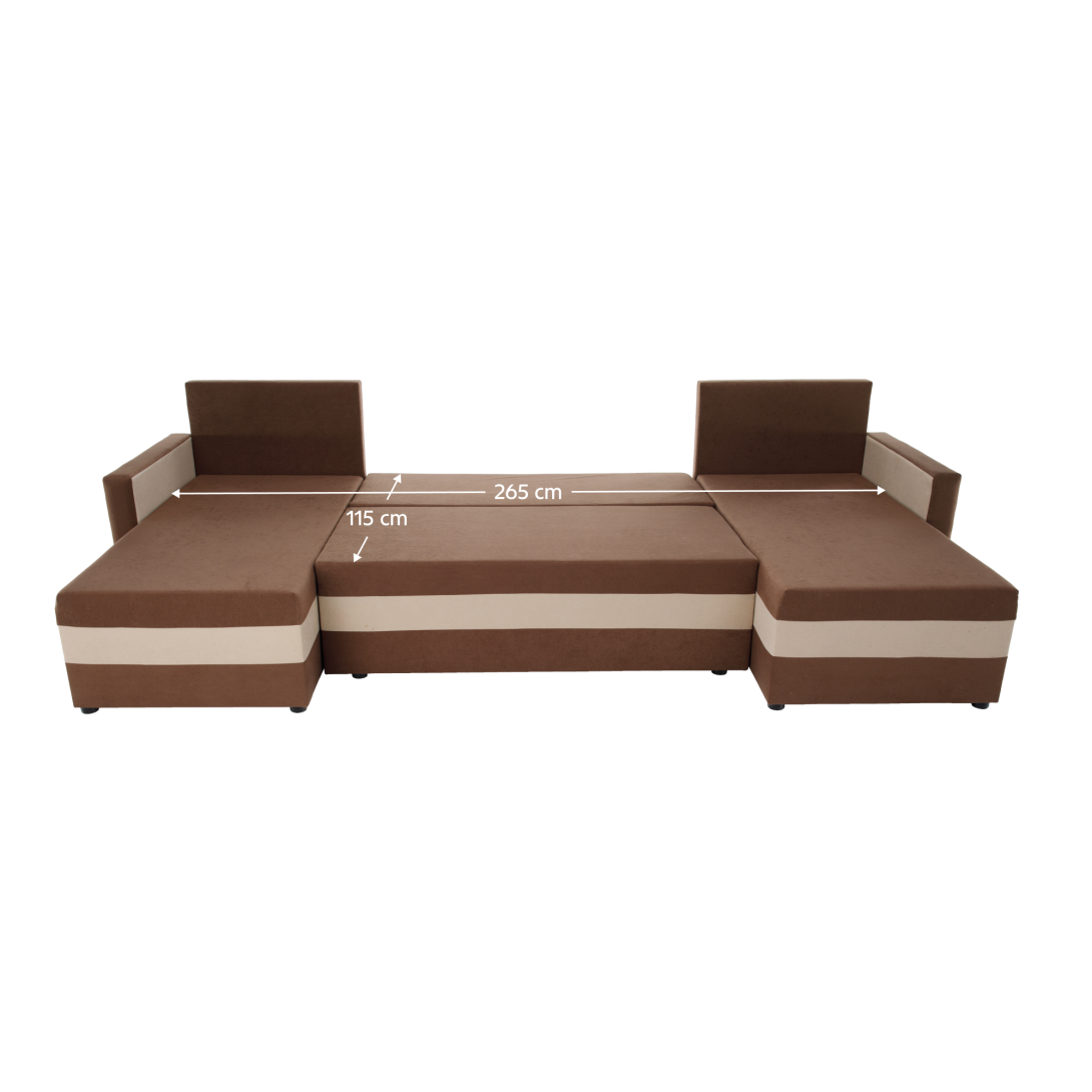 Materiál čalúnenie: látka Alova 67/07Oderuodolnosť textílie podľa testu Martindale: 85 000 oderovFarba čalúnenie: hnedá/béžováRozmery (ŠxHxV): 287x139/139x74/86 cmPlocha na spanie (ŠxD): 115x265 cmVýška sedu: 39 cmHĺbka sedu: 42/64 cmDodávaná s vankúšmiRozmer vankúša (ŠxV): 65x46 cmŠírka otomanov: 67 cmOpierka na ruku (ŠxV): 10x54 cmVýška spodného priestoru od podlahy: 2,5 cmVýplň: Pur pena T28Tvar URozkladaciaRohováUniverzálna (Ľ/P)S úložným priestorom V stredovej častiDodávané v demonte