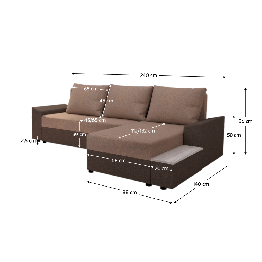 Materiál: látka Falcone 16/25Oderuodolnosť textílie podľa testu Martindale: 50 000 oderovPrevedenie: hnedá/svetlohnedáRozmery (ŠxHxV): 240x140x86 cmPlocha na spanie (ŠxD): 120x200 cmVýška sedu: 39 cmHĺbka sedu: 45/65 cmRozmer vankúša (ŠxV): 65x45 cmRozmery opierky na ruku (ŠxV): 20x50 cm Výška spodného priestoru od podlahy: 2,5 cm Výplň: Pur penaMateriál nožičiek: plastFarba nožičiek: čiernaUniverzálna (Ľ/P)CeločalúnenáRohováRozkladaciaS úložným priestoromS vankúšmiRozmery vankúšov (ŠxV):65x45 cmBarová doskaDodávané v demonte