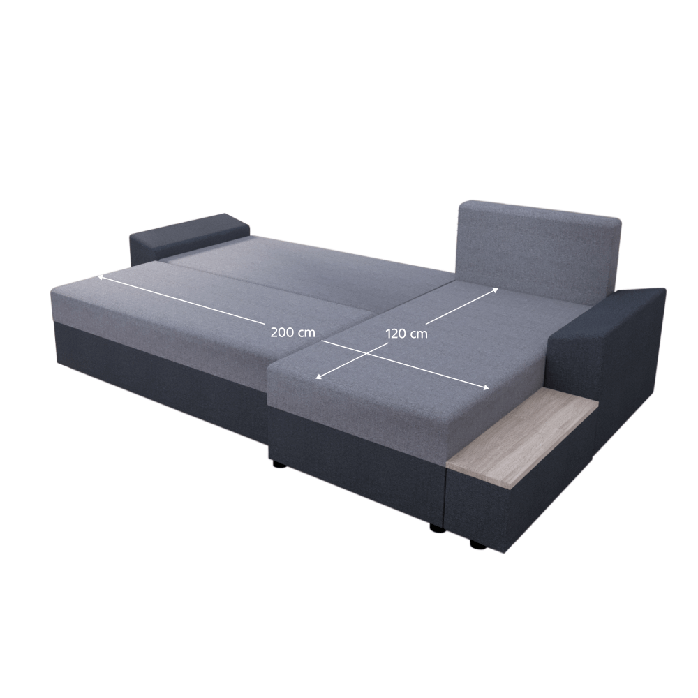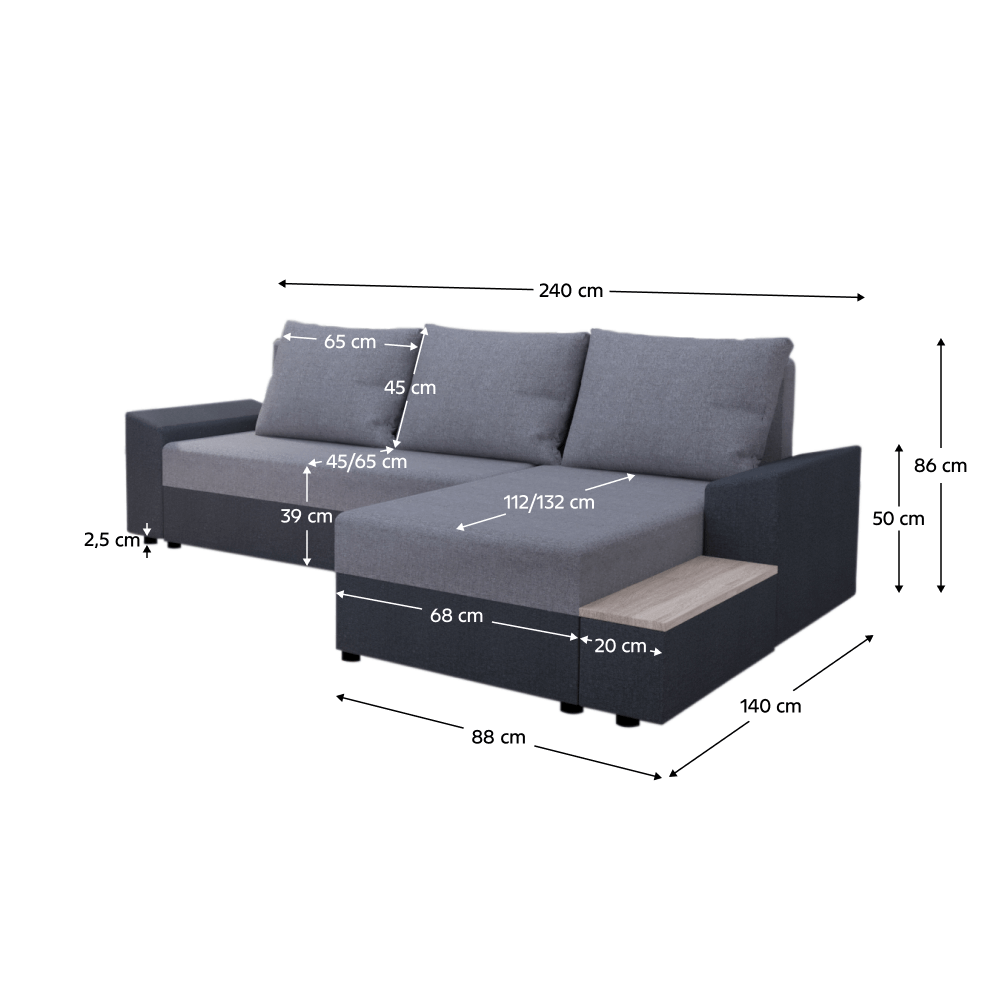 Materiál: látka Falcone 05/21Oderuodolnosť textílie podľa testu Martindale: 50 000 oderovPrevedenie: tmavosivá/siváRozmery (ŠxHxV): 240x140x86 cmPlocha na spanie (ŠxD): 120x200 cmVýška sedu: 39 cmHĺbka sedu: 45/65 cmRozmer vankúša (ŠxV): 65x45 cmRozmery opierky na ruku (ŠxV): 20x50 cm Výška spodného priestoru od podlahy: 2,5 cm Výplň: Pur penaMateriál nožičiek: plastFarba nožičiek: čiernaUniverzálna (Ľ/P)CeločalúnenáRohováRozkladaciaS úložným priestoromS vankúšmiRozmery vankúšov (ŠxV):65x45 cmBarová doskaDodávané v demonte.