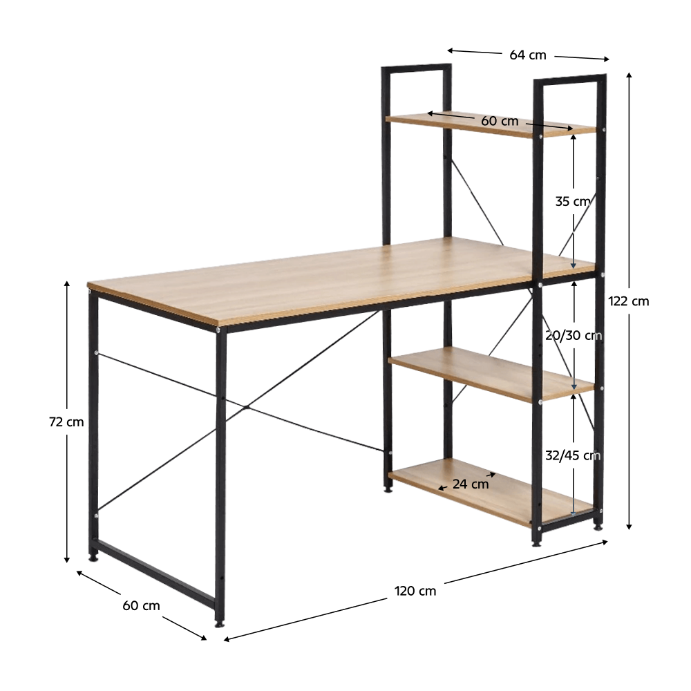Materiál: DTD laminovaná/kovFarba: dub/čiernaRozmery (ŠxHxV): 120x60/64x72/122 cmVýška regálu: 122 cmVýška stola: 72 cmHrúbka materiálu: 16 mmHĺbka políc: 24 cmNosnosť police: 20 kgNosnosť stola: 30 kgTri policeViacúčelový stôlRektifikačné skrutky na noháchDodávané v demonte
