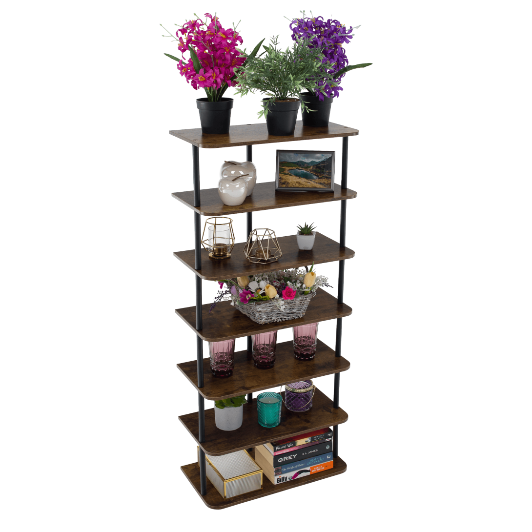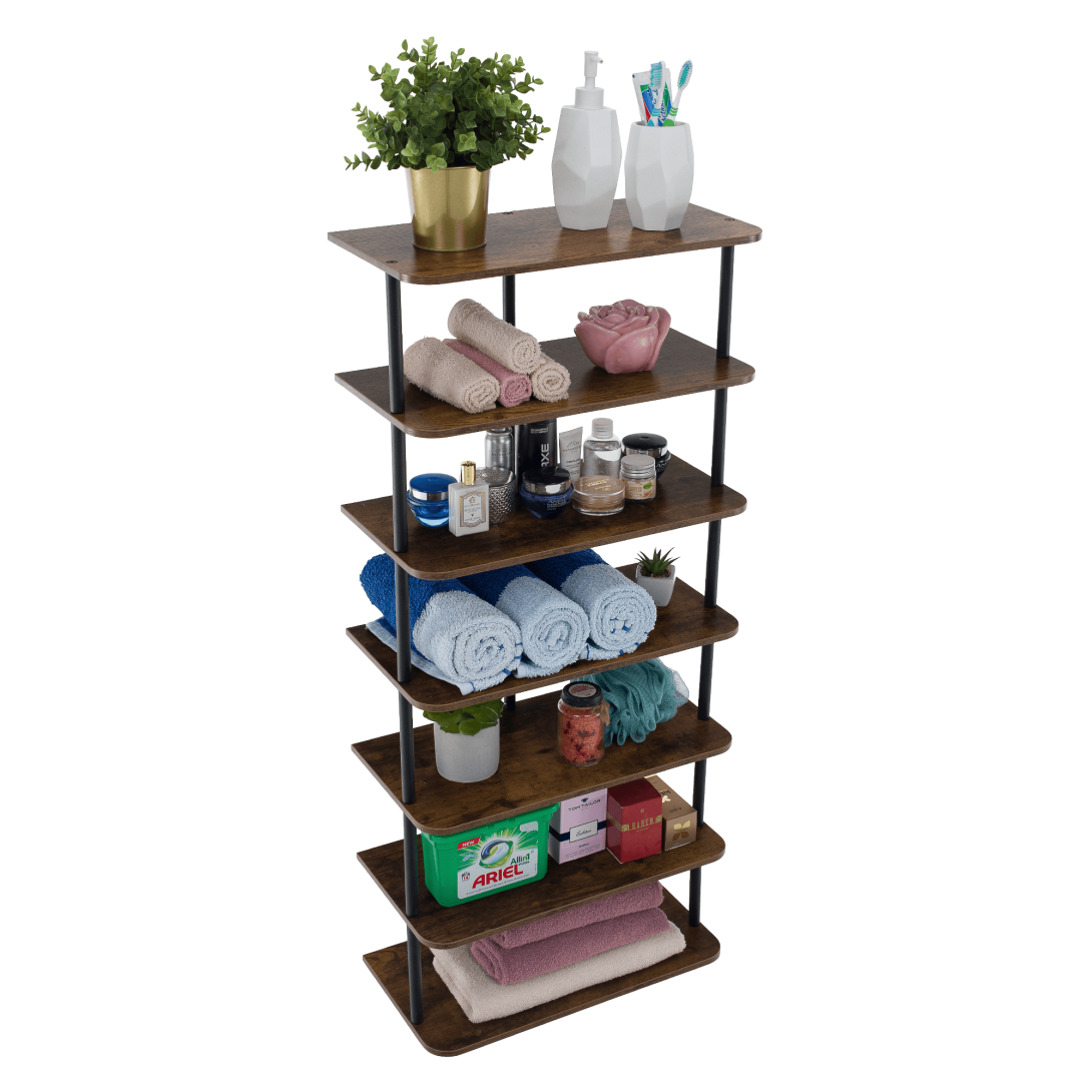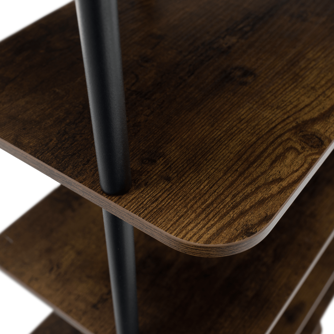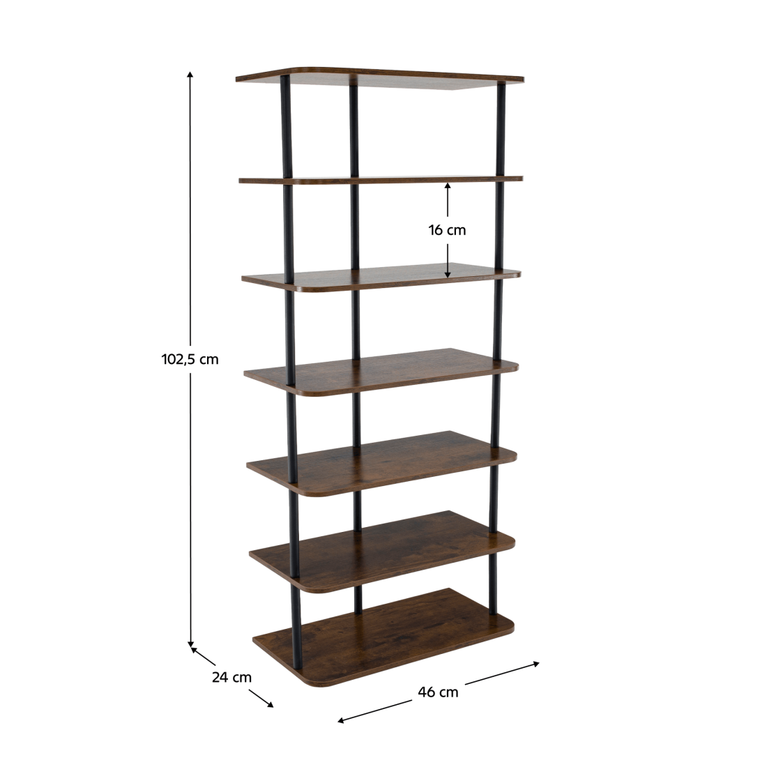 Materiál: kov/DTDFarba: čierna/rustikálne drevoRozmery (ŠxHxV): 46x24x102,5 cmHrúbka tyče: 1,6 cmNosnosť na policu: 5 kg-10 kgVýška police: 16 cm6-radovýViacúčelovýDodávané v demonte