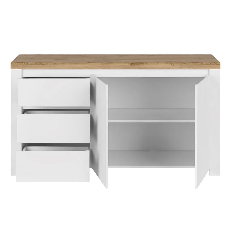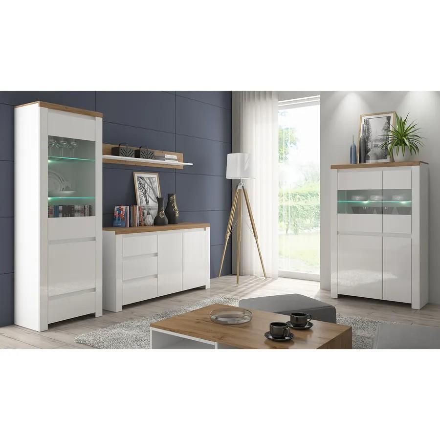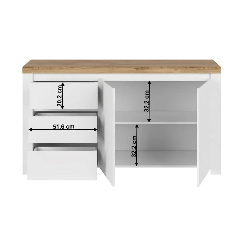 Komoda VILGO 2D3S je vhodná na zariadenie obývacích izieb, jedálni, spálni a tiež ju môžete postaviť v predsieni, kde svojou jednoduchosťou a farebnou kombináciou HG bielej a dub wotan dodá pocit čistoty a sviežosti. Zaručene sa stane dominantou každej izby, do ktorej sa ju rozhodnete postaviť. Komoda ponúka dokonalý priestor na úschovu vašich vecí. Pravá strana komody je dvojdverovás jednou poličkou, a ľavá časť obsahuje tri rovnako veľké šuplíky.