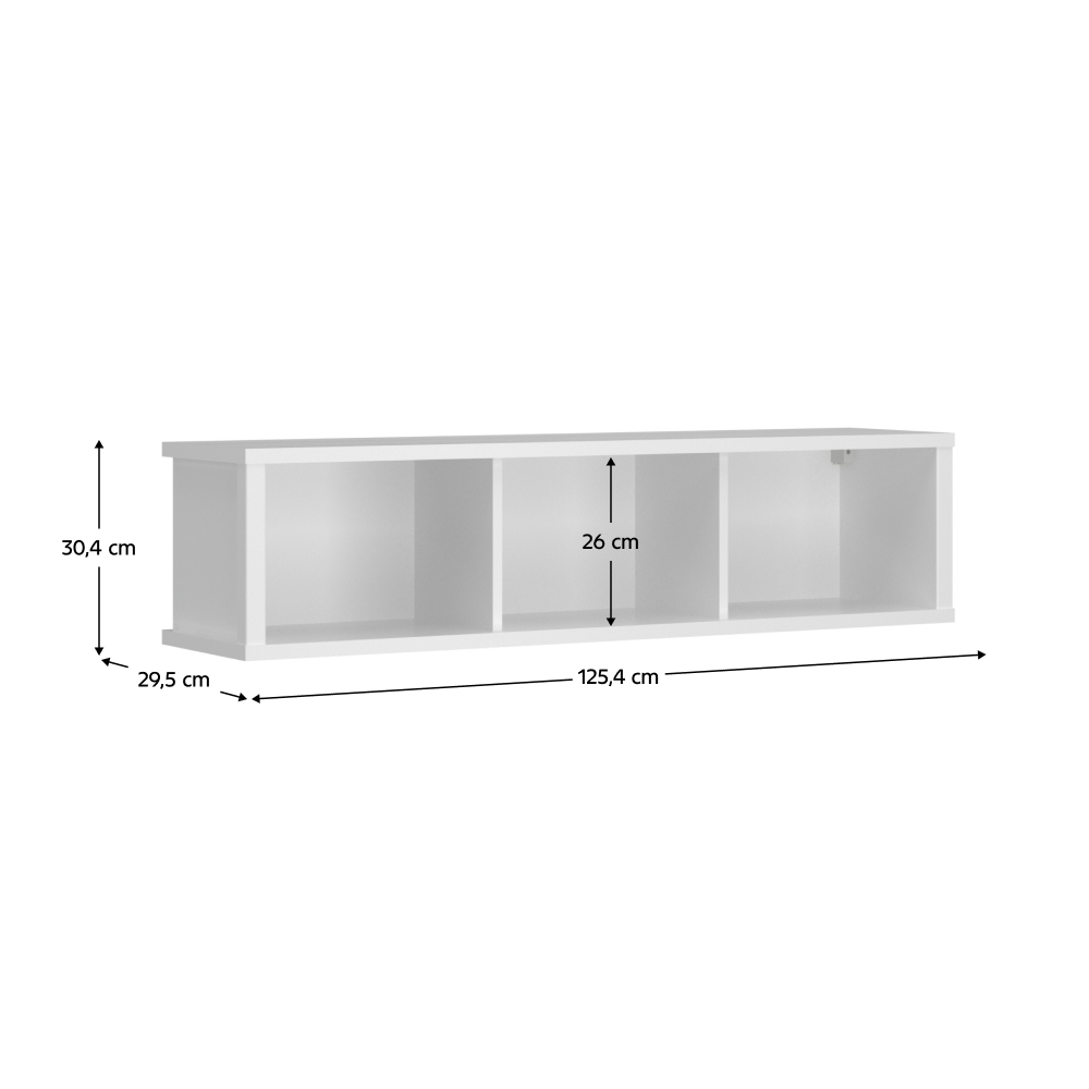 Materiál: DTD laminovaná/ABS hranyFarba: bielaRozmery (ŠxHxV): 125,4x29,5x30,4 cmHrúbka materiálu: 1,6-3,2 cmOtvorený úložný priestor Tri odkladacie častiZávesnáModerný dizajnOdporúčame pripevniť k steneDodávané v demonte