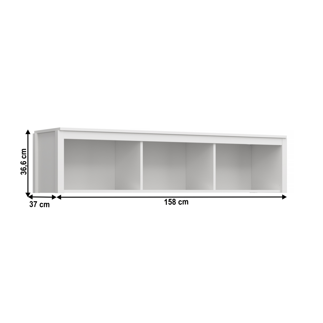 Materiál: DTD laminovaná/ABS hranyFarba: bielaRozmery (ŠxHxV): 158x37x36,6 cmHrúbka materiálu: 1,6 cmOtvorený úložný priestorPredelený úložný priestorSpodná a vrchná lištaTri odkladacie častiABS hranyBez LED osvetleniaMožnosť dokúpenia LED osvetleniaDodávaný v demonte