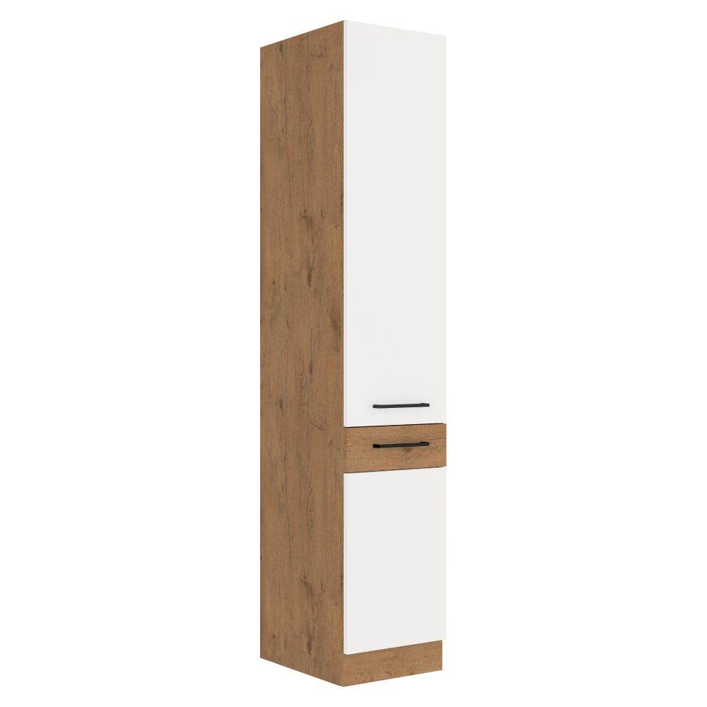 Vysoká skrinka VEGA 40 DK-210 2F Materiál: DTD laminovaná/MDFFarba: dub lancelot/biela extra vysoký lesk HGRozmery (ŠxHxV): 40x210x57 cmDodávané v demonteMožnosť dokúpenia pracovnej dosky dub lancelot v cene 55 Eur/bm. Možnosť dokúpiť univerzálny drez LAY ON.