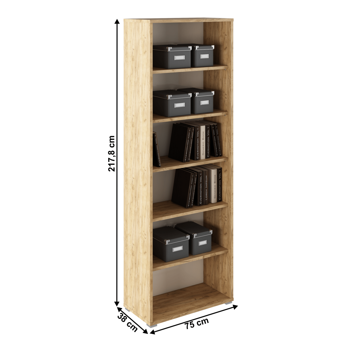 Vysoký regál RIOMA TYP 01Materiál: DTD laminovanáFarba: dub artisan/bielaRozmery (ŠxHxV): 75x38x217,8 cmHrúbka lamina 22 mmPäť polícKvalitný slovenský výrobokDodávané v demonte