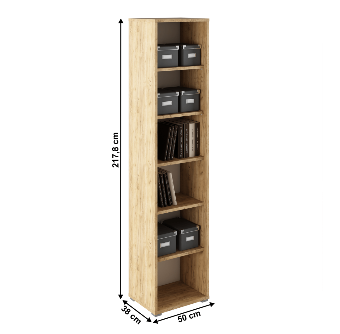 Vysoký regál RIOMA TYP 02Materiál: DTD laminovanáFarba: dub artisan/bielaRozmery (ŠxHxV): 50x38x217,8 cmHrúbka lamina 22 mmPäť polícKvalitný slovenský výrobokDodávané v demonte