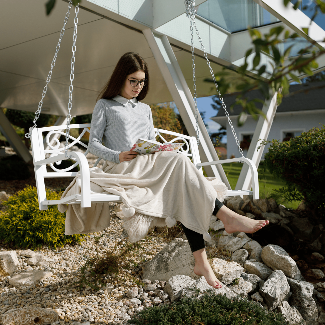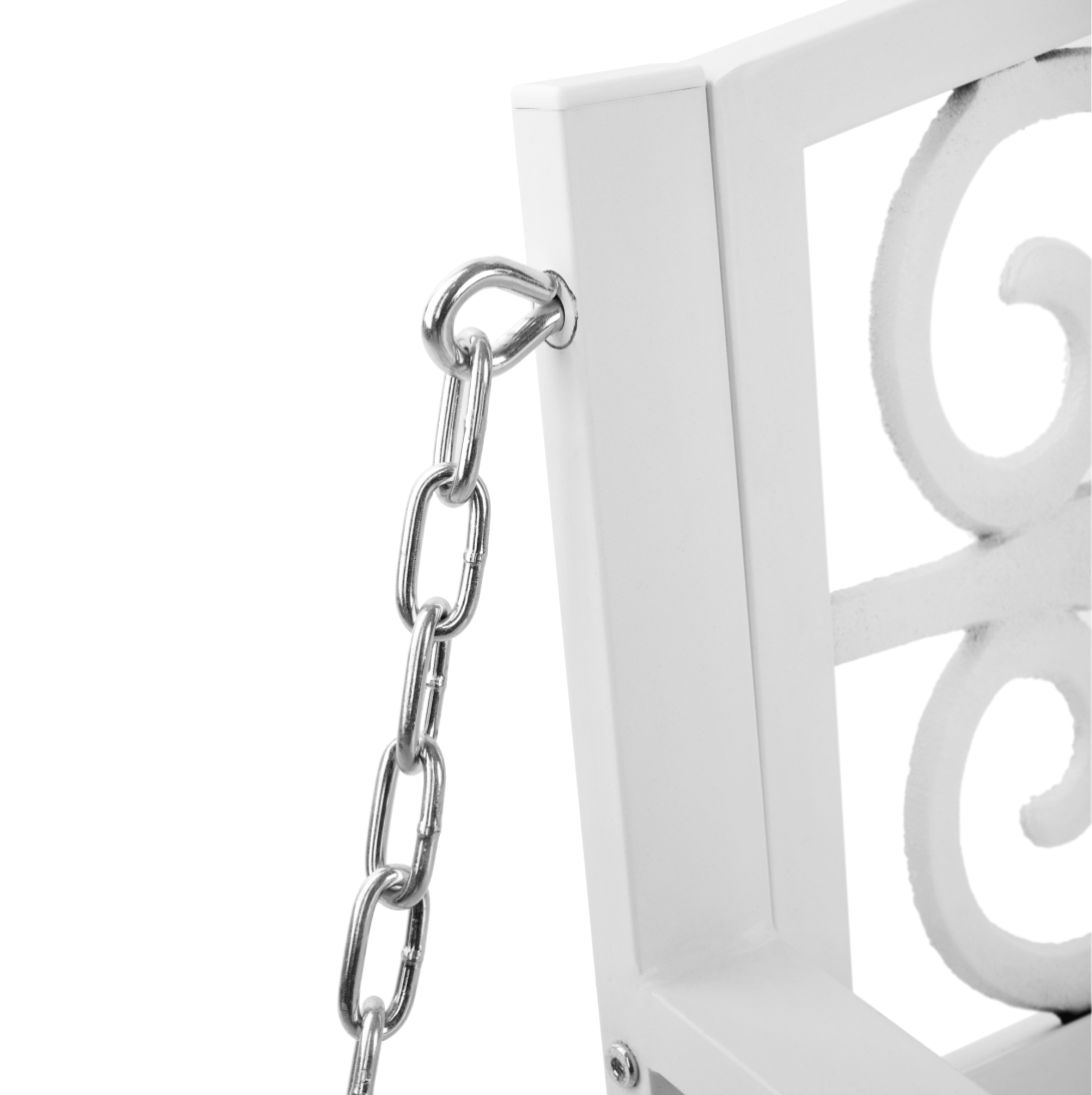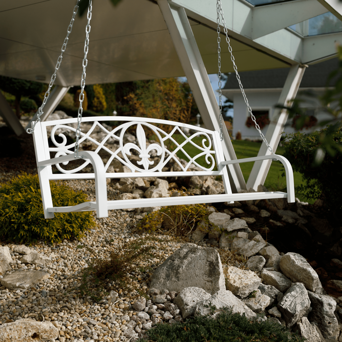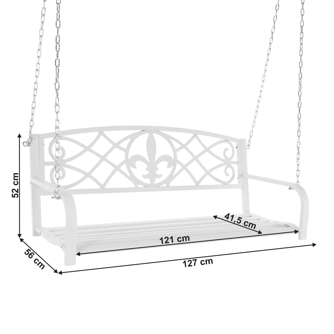 Materiál: oceľFarba: bielaRozmery (ŠxHxV): 127x56x52 cmŠírka sedu: 121 cmHĺbka sedu: 41,5Nosnosť: 170 kgS reťazouDĺžka reťazí: 3,4 mRomantický dizajnOrnamenty na opierke chrbtaVhodná do interiéru aj exteriéruNa balkóny, terasy, do záhradyDodávaná bez vankúšovDodávaná bez stojanuDodávané v demonte