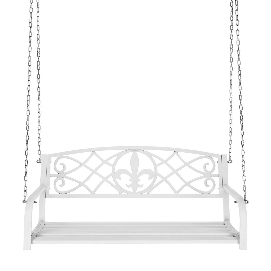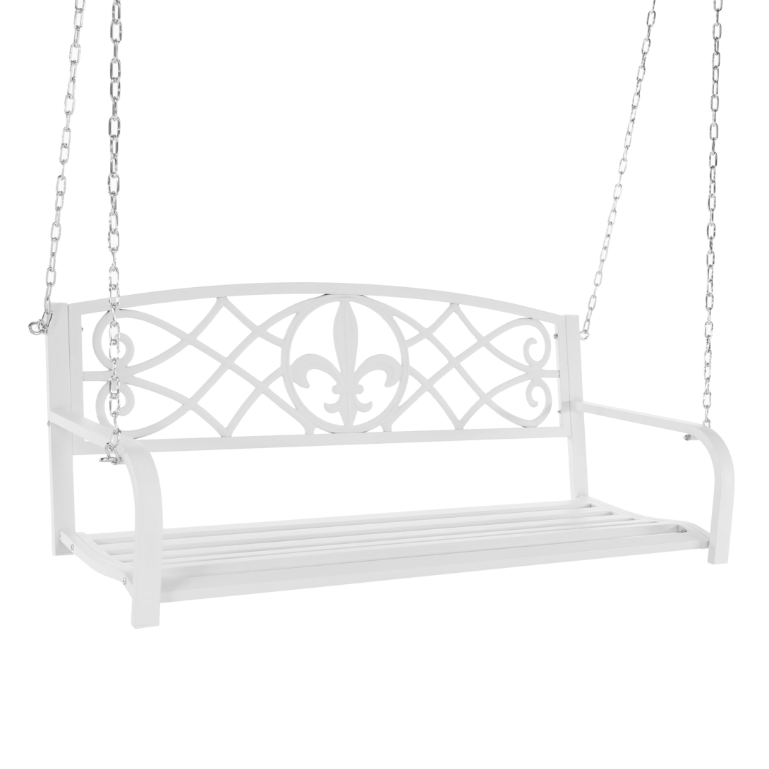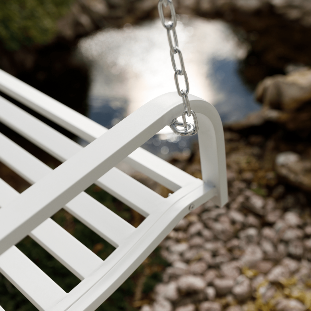 Materiál: oceľFarba: bielaRozmery (ŠxHxV): 127x56x52 cmŠírka sedu: 121 cmHĺbka sedu: 41,5Nosnosť: 170 kgS reťazouDĺžka reťazí: 3,4 mRomantický dizajnOrnamenty na opierke chrbtaVhodná do interiéru aj exteriéruNa balkóny, terasy, do záhradyDodávaná bez vankúšovDodávaná bez stojanuDodávané v demonte