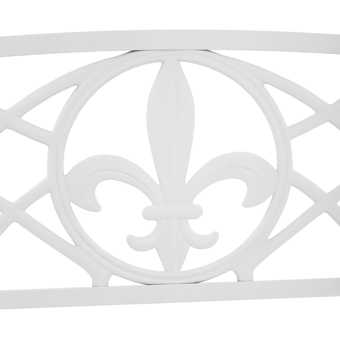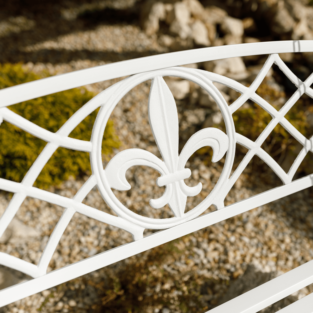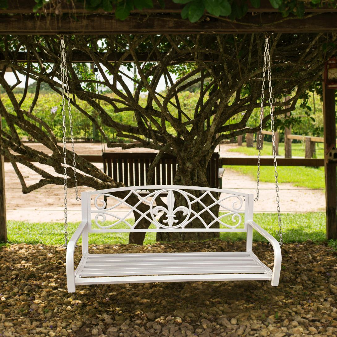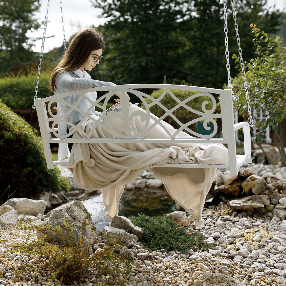 Materiál: oceľFarba: bielaRozmery (ŠxHxV): 127x56x52 cmŠírka sedu: 121 cmHĺbka sedu: 41,5Nosnosť: 170 kgS reťazouDĺžka reťazí: 3,4 mRomantický dizajnOrnamenty na opierke chrbtaVhodná do interiéru aj exteriéruNa balkóny, terasy, do záhradyDodávaná bez vankúšovDodávaná bez stojanuDodávané v demonte