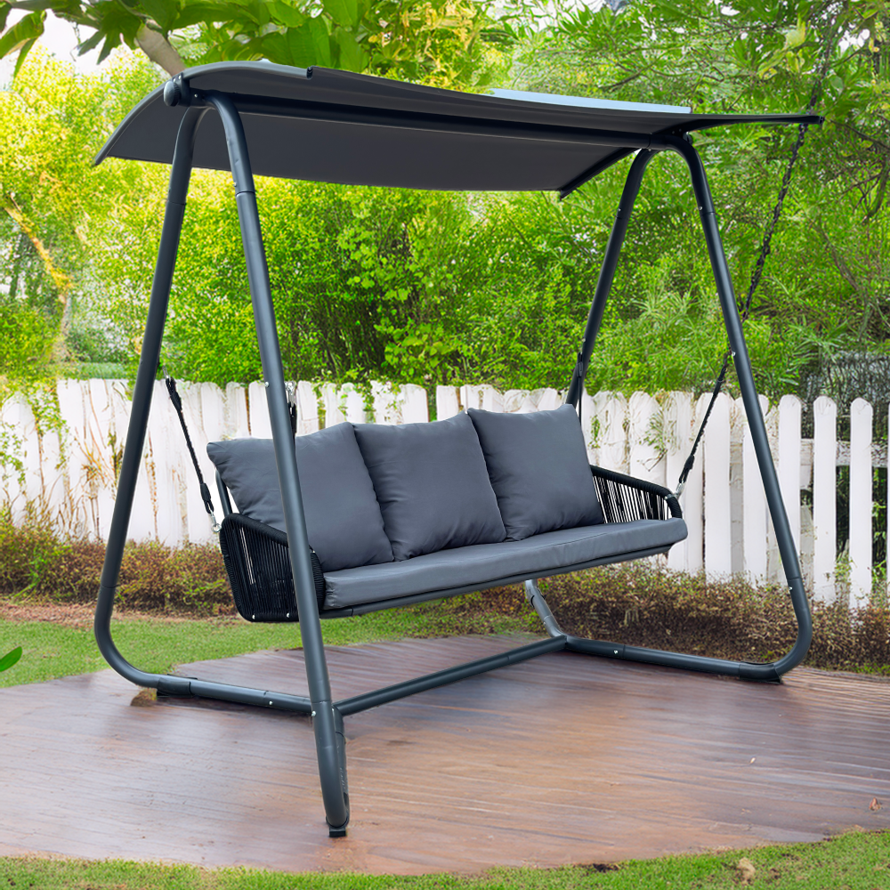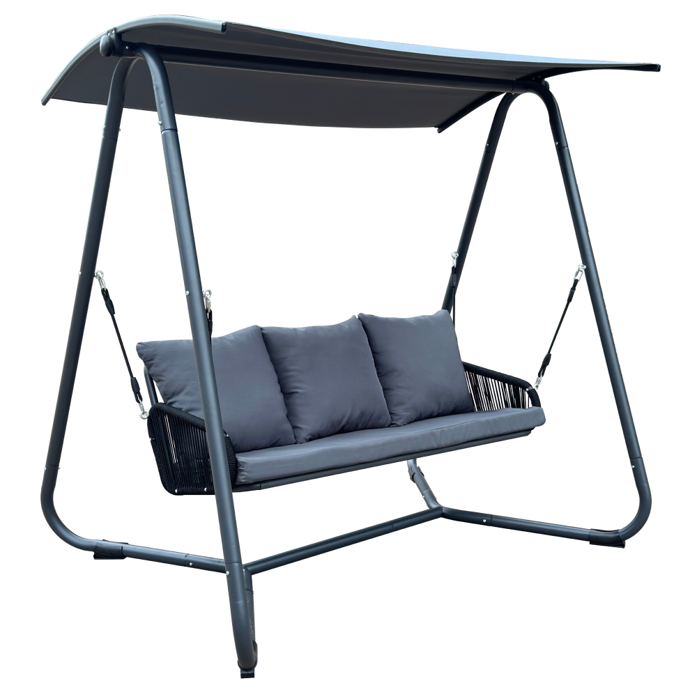 Materiál: látka/kovFarba: sivá/tmavosiváRozmery (ŠxHxV): 190x147x180 cmVýška sedu: 48 cmHĺbka sedu: 48 cmVýška chrbta: 46 cmŠírka chrbta: 140 cmNosnosť na osobu: 90 kgVodoodolné poťahyHrúbka vankúša na sedenie: 8 cmRozmery opierkového vankúša (ŠxV): 48x48 cmKovová konštrukciaSo strieškouRozmer striešky (ŠxV): 185x117 cmDodávané v demonte