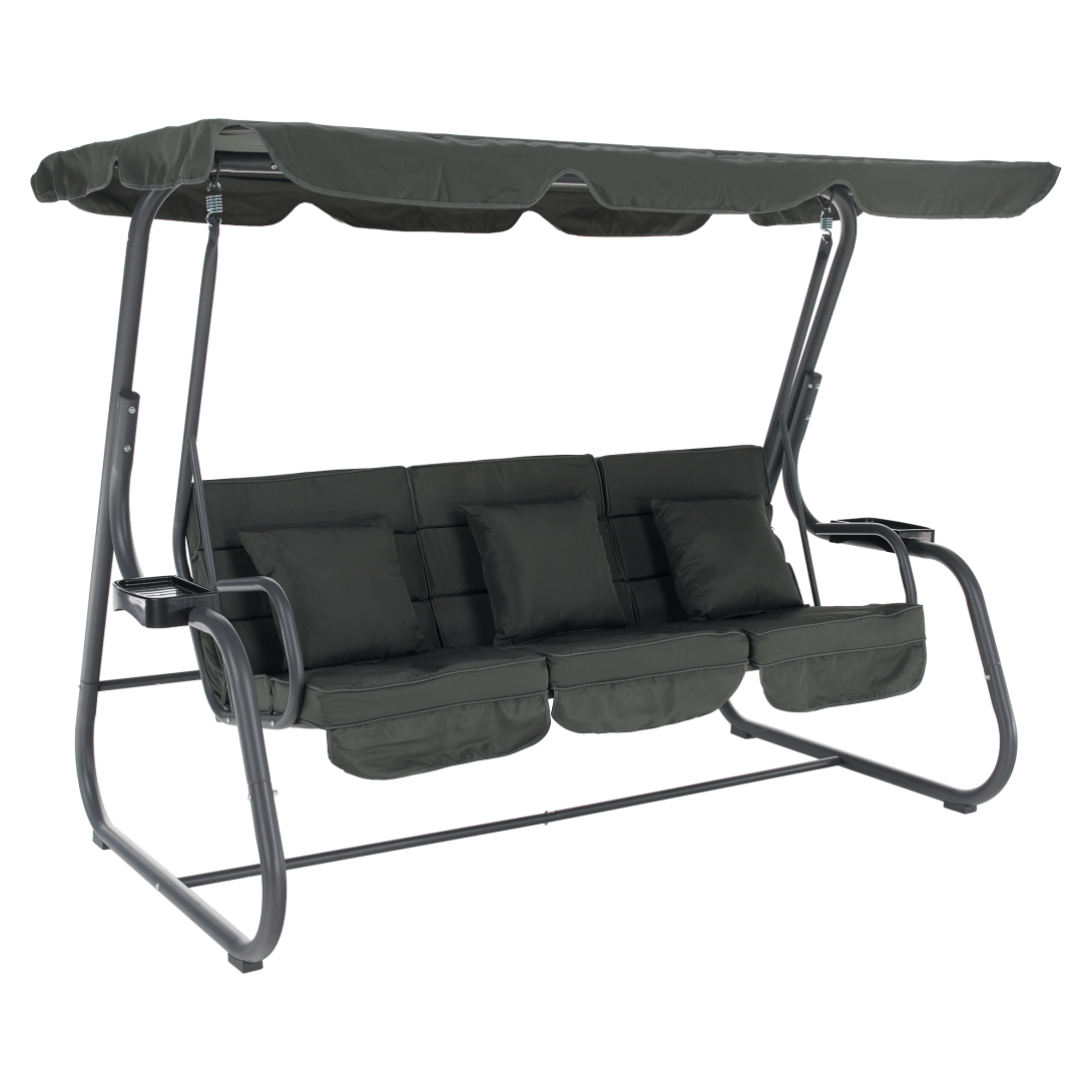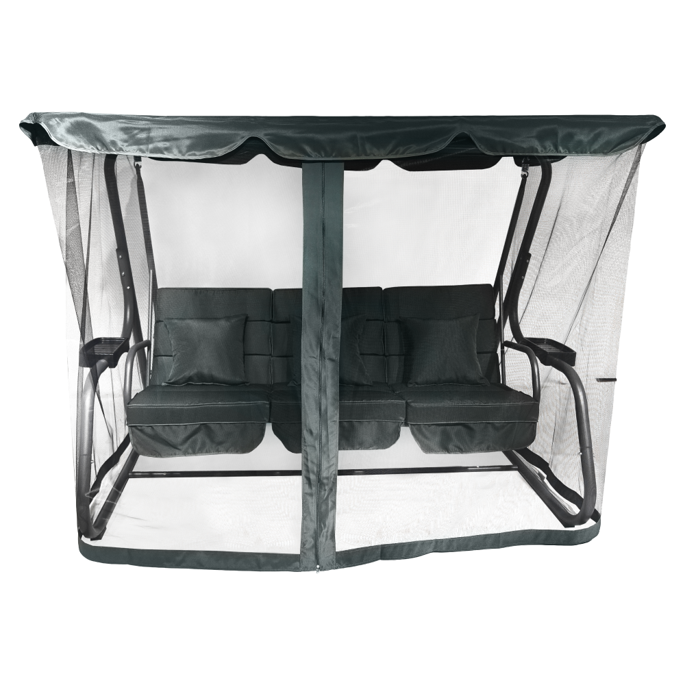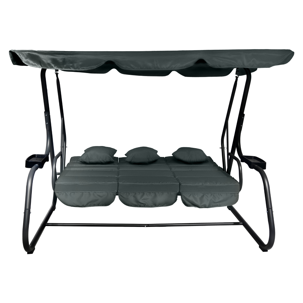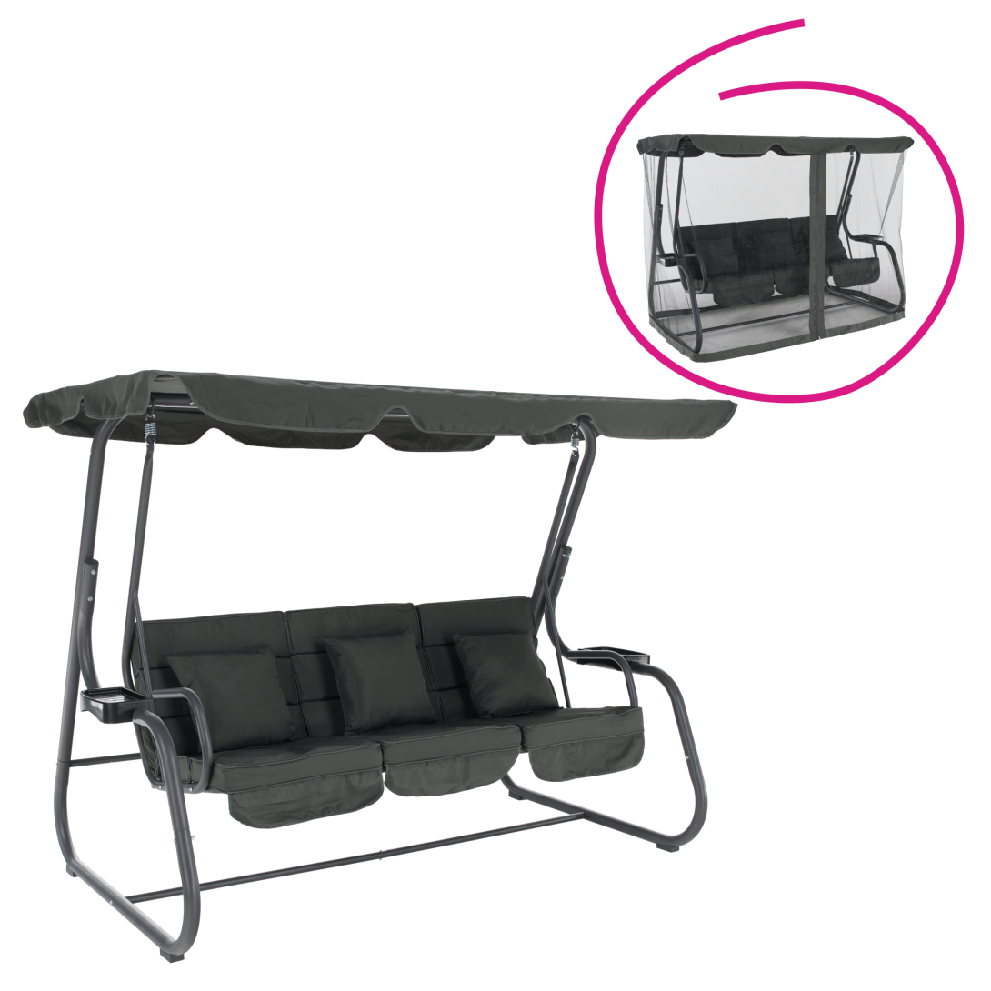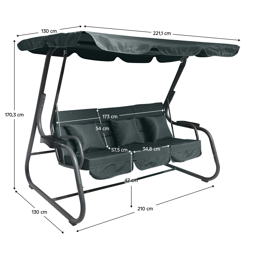 Materiál: kov/polyesterová tkanina/plastFarba: tmavosiváRozmery (ŠxHxV): 221,1x130x170,3 cmVýška sedu: 47 cmHĺbka sedu: 57,5 cmŠírka sedu: 173 cmVýška chrbta: 54 cmKovová konštrukciaOdkladacie priestory na oboch stranáchMožnosť rozloženia na ležanieRozmery ležania: 108x173 cmNosnosť: 200 kg3x dekoratívne vankúšeRozmery vankúšov (ŠxV): 38,3x39 cmVodoodolné poťahyPrať ručnePoťah upevnený suchým zipsomDodávané so sieťkouZapínanie na zipsProtišmykové nožičkyDodávané so strieškouRozmery striešky (ŠxV): 221,1x130 cmBez možnosti nastavenia sklonuDodávané v demonte