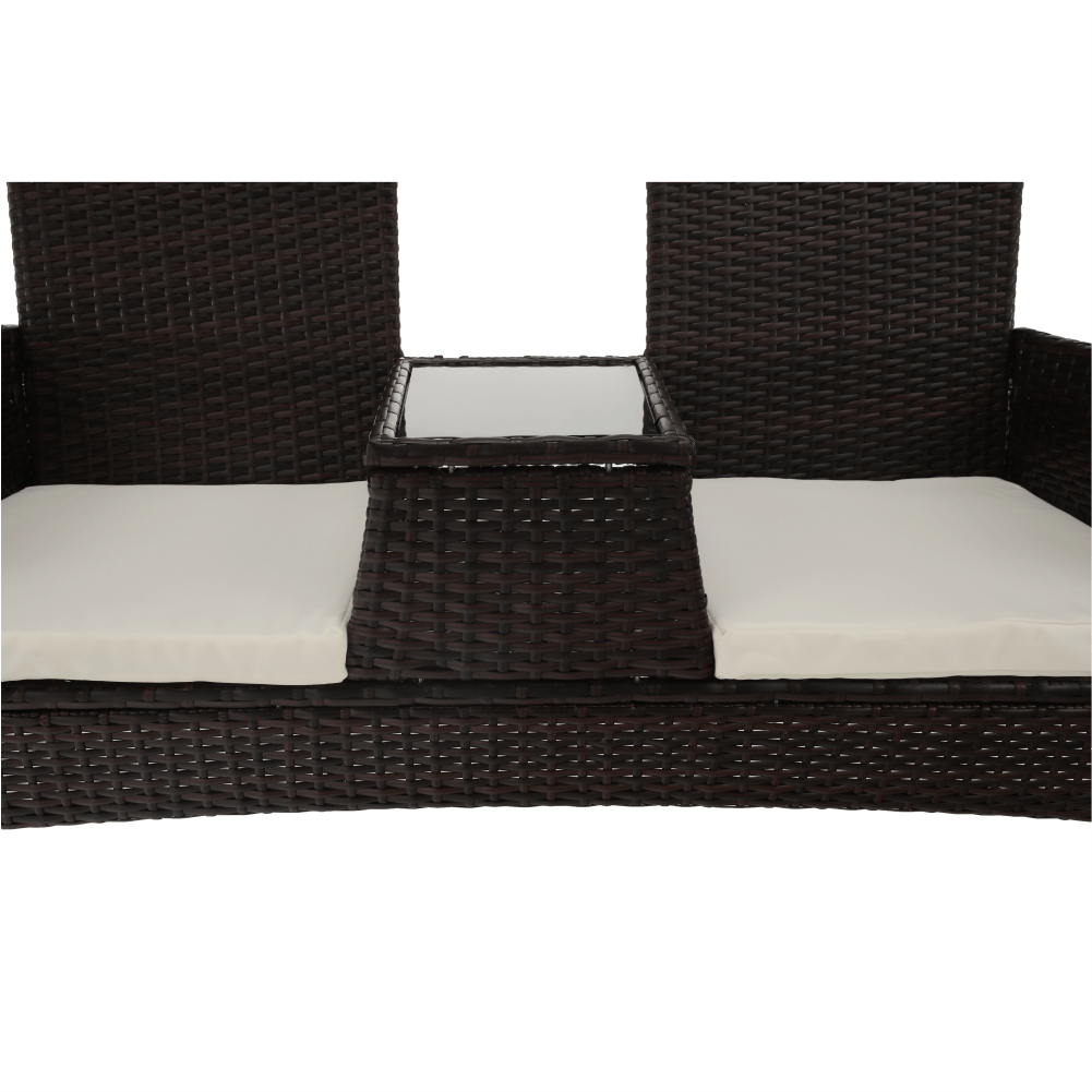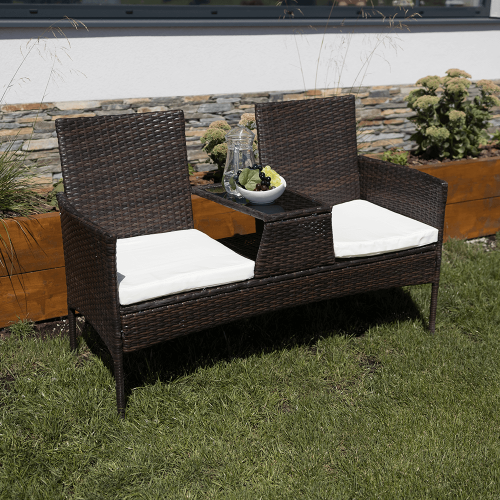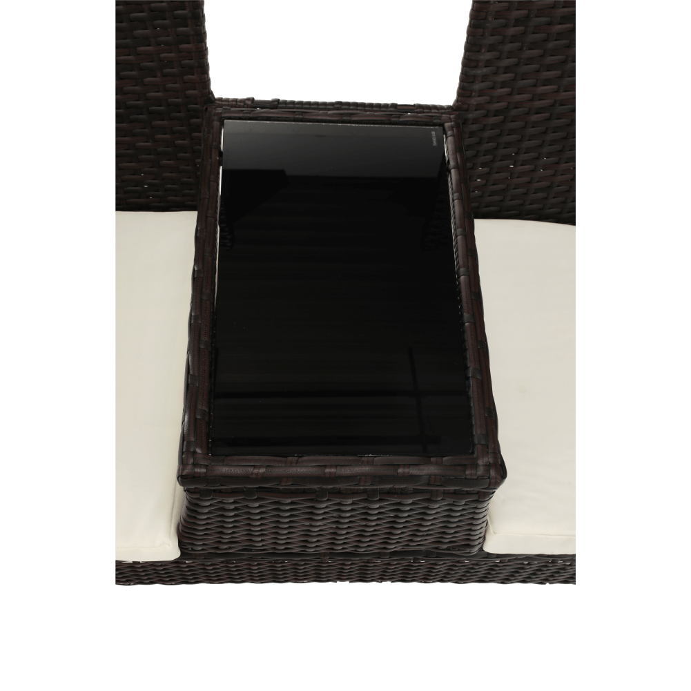 Materiál: umelý ratan/oceľ/tvrdené sklo/látkaOderuodolnosť textílie podľa testu Martindale: 95 000 oderovFarba: hnedá/krémováRozmery (ŠxHxV): 125x48x87 cmStôl (ŠxH): 30x51 cmVýška nohy: 21 cmVýška sedu: 39,5 cmHrúbka vankúša: 5 cmRozmery sedu (ŠxH): 46x45 cmOpierka na ruku (HxV): 54x62,5 cmOpierka chrbta (ŠxV): 45x46 cmVodoodolný poťahSnímateľný poťahMožné je prať ho v práčkeDodávané v demonte