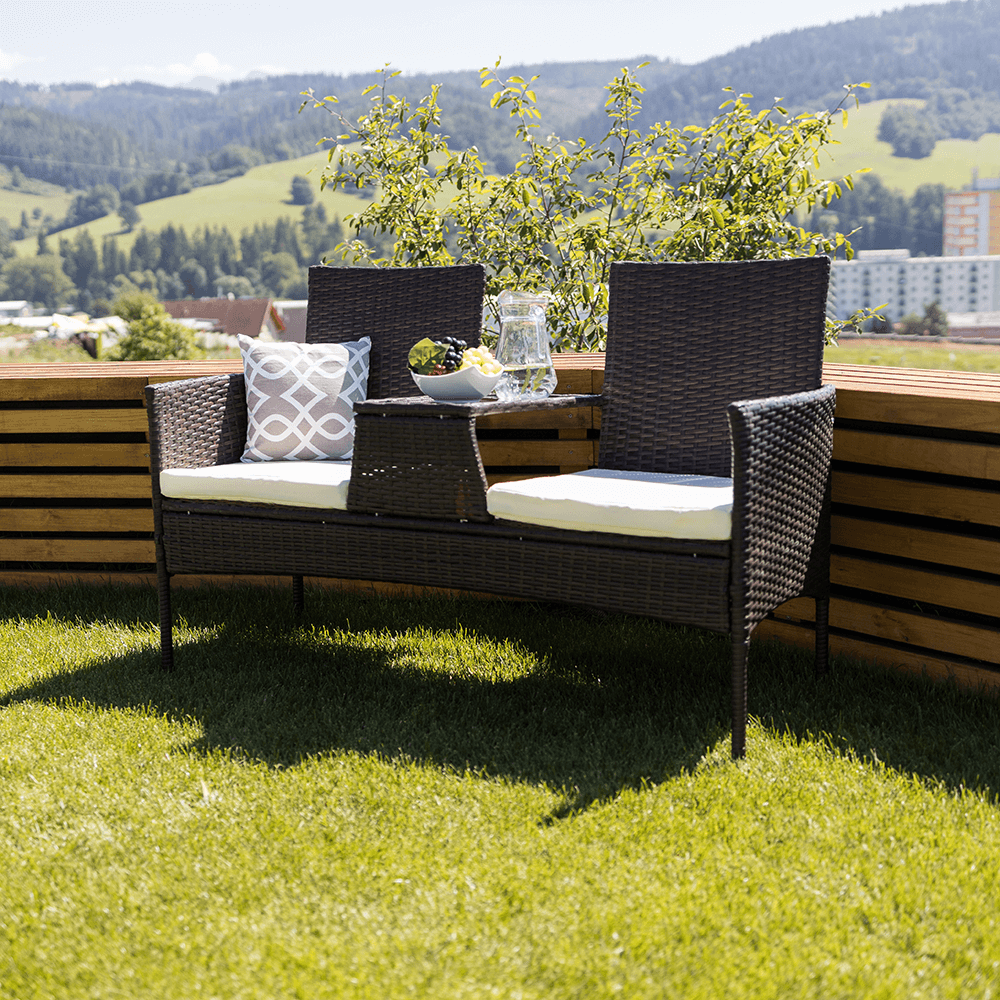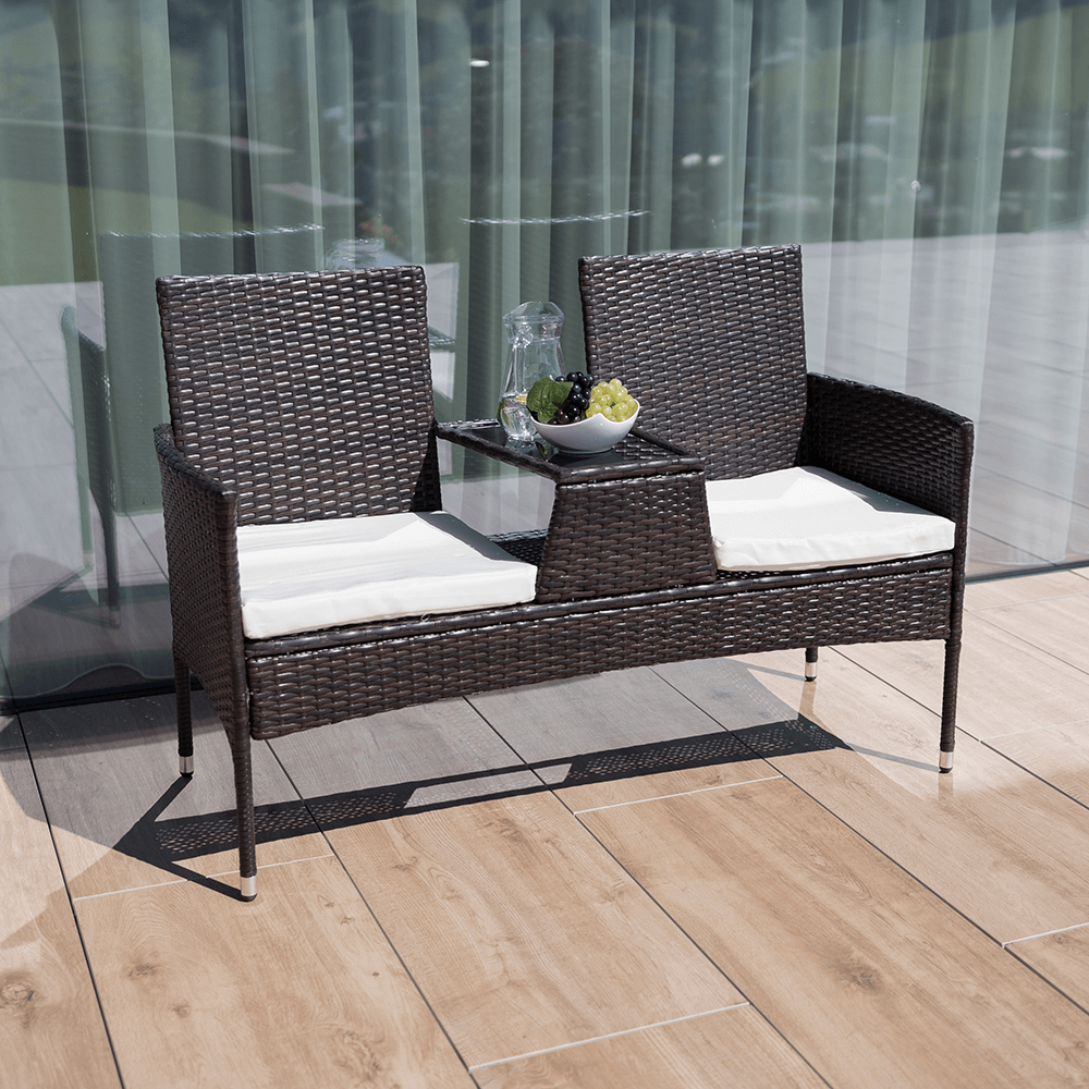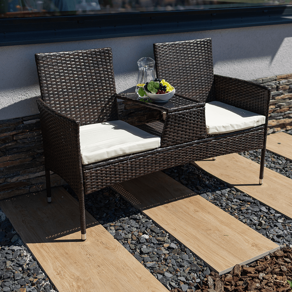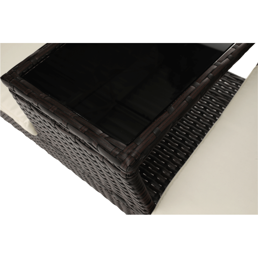 Materiál: umelý ratan/oceľ/tvrdené sklo/látkaOderuodolnosť textílie podľa testu Martindale: 95 000 oderovFarba: hnedá/krémováRozmery (ŠxHxV): 125x48x87 cmStôl (ŠxH): 30x51 cmVýška nohy: 21 cmVýška sedu: 39,5 cmHrúbka vankúša: 5 cmRozmery sedu (ŠxH): 46x45 cmOpierka na ruku (HxV): 54x62,5 cmOpierka chrbta (ŠxV): 45x46 cmVodoodolný poťahSnímateľný poťahMožné je prať ho v práčkeDodávané v demonte