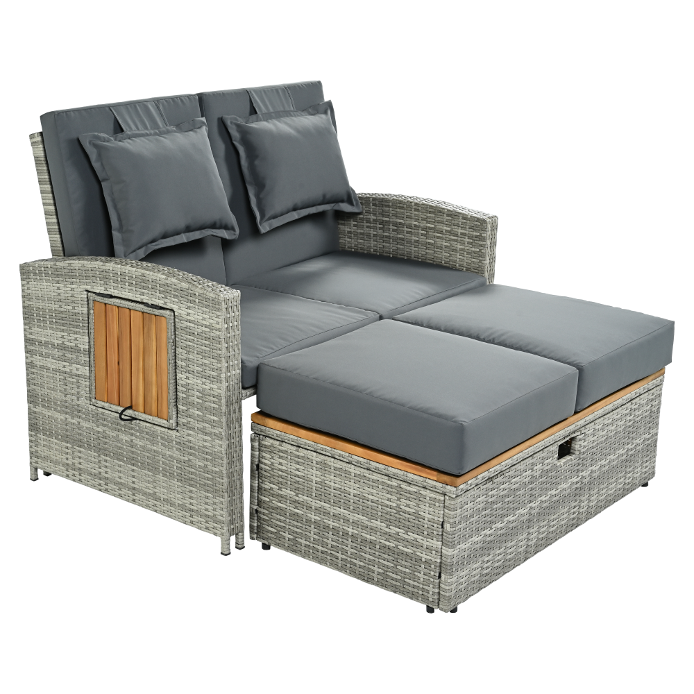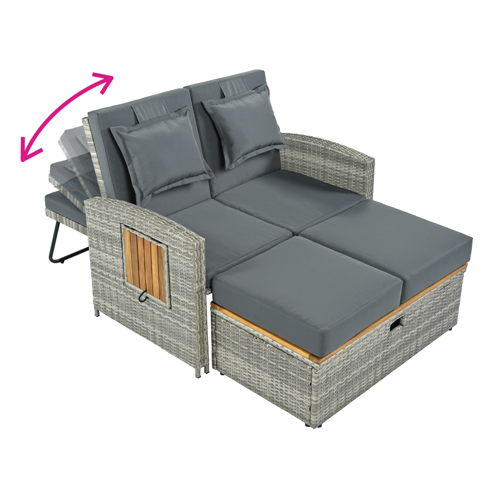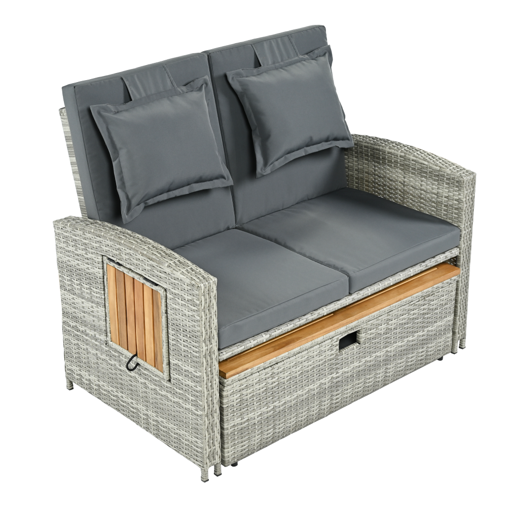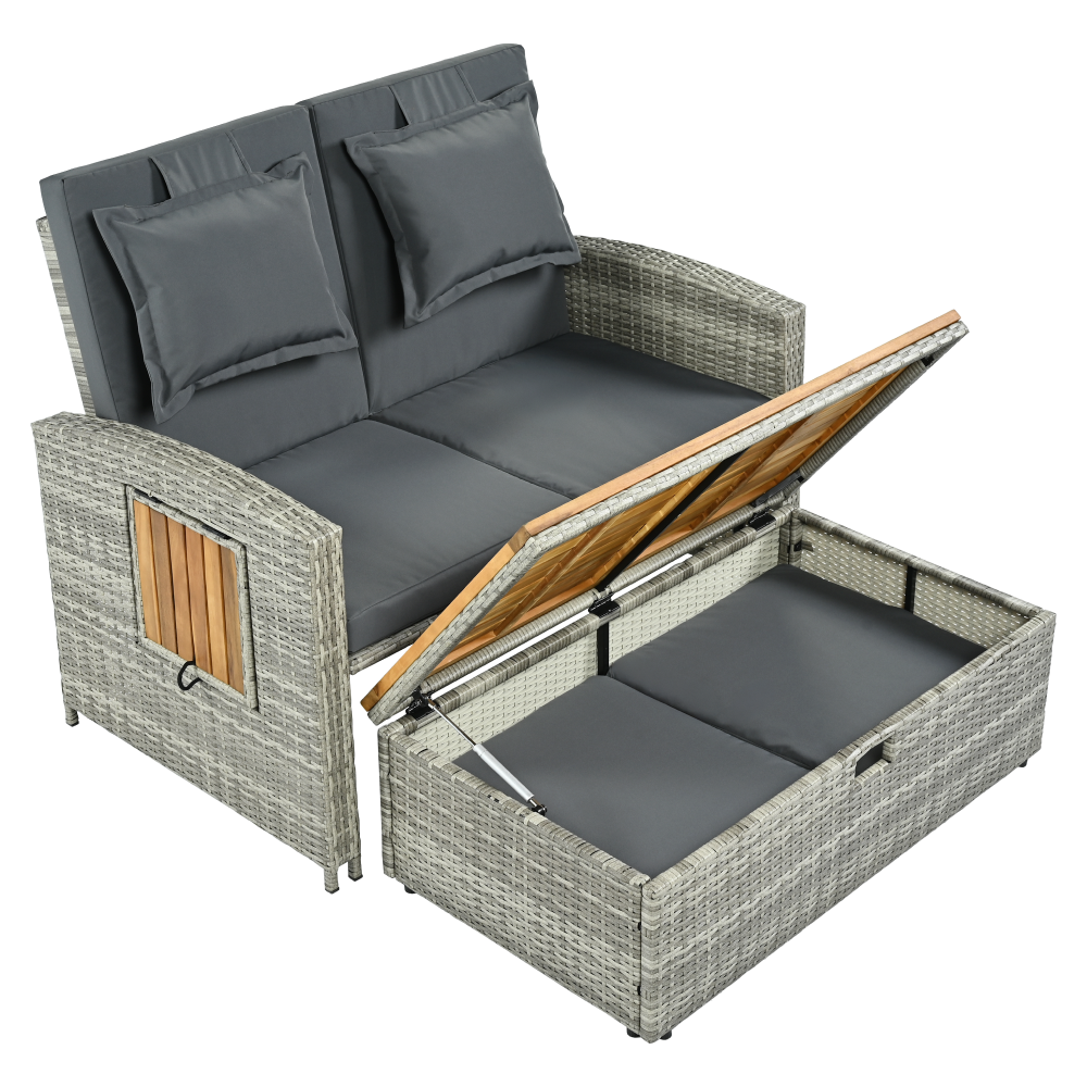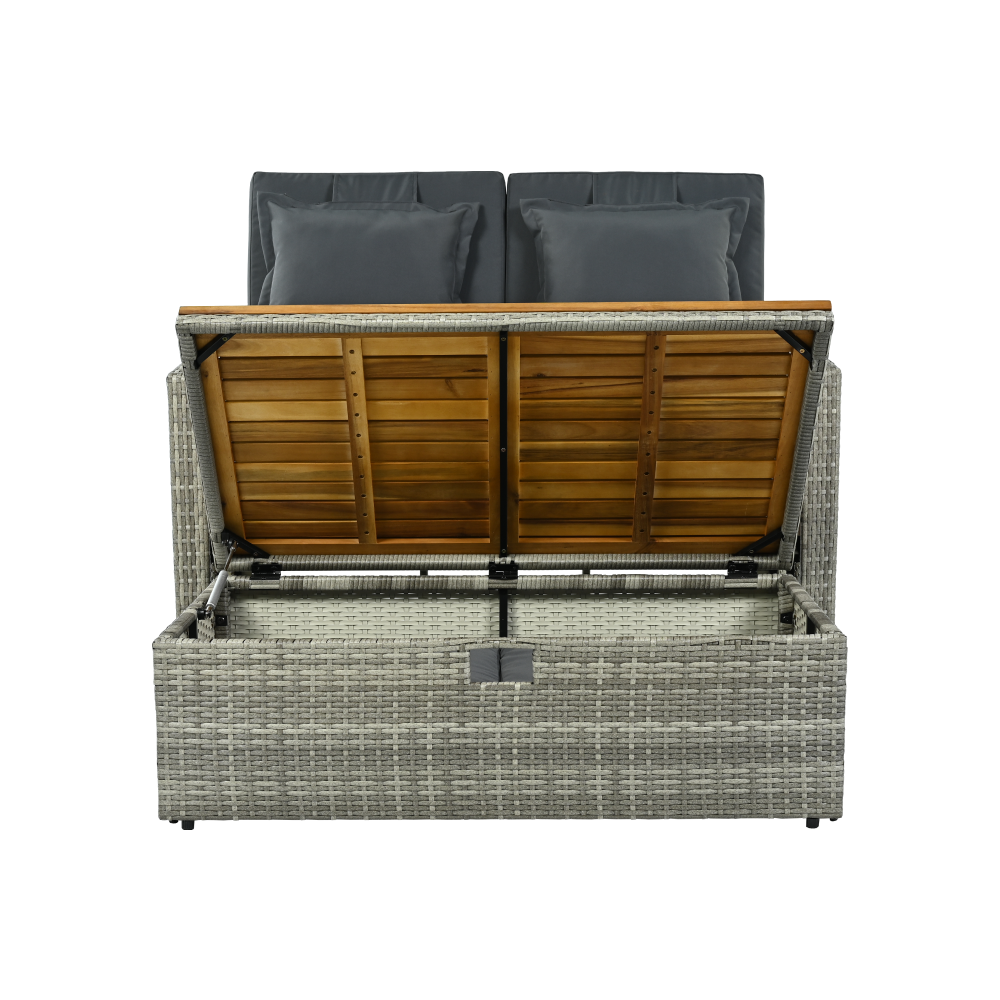 Materiál: technický ratan/oceľ/látka/akáciové drevoOderuodolnosť textílie podľa testu Martindale: 95 000 oderovFarba: sivá/prírodnáRozmery pohovka (ŠxHxV): 115x69x92 cmVýška sedu bez vankúša: 39 cmVýška sedu s vankúšom: 45 cmHĺbka sedu: 51,5 cmŠírka sedu: 103 cmRozmery lavica (ŠxHxV): 99x55,5x33 cmVýška sedu bez vankúša: 33 cmVýška sedu s vankúšom: 45 cmRozmery sklopeného stolíka (ŠxH): 29x29 cmVýška chrbta bez vankúša: 35 cmVýška chrbta s vankúšom: 29 cmŠírka chrbta: 103 cmRozmery rozloženia (ŠxD): 103x170 cmVýška opierky na ruku: 65 cmNosnosť: 130 kgHmotnosť: 32 kg2-dielna súpravaPohovkaLavica2x sklápacie príručné stolíkyPolohovacia opierka chrbta4 pozície sklápania opierky chrbtaS opierkami rúkDodávané s vankúšmiSnímateľný a vodoodolný poťahPoťahy je možné prať pri teplote 30 °CPoťahy nesušte v sušičke, nebieľte, nečistite chemicky a nežehliteOtváranie veka lavice pomocou hydraulického piestuVhodná na záhradné náradie, hračky, vankúše, deky, sedenieLavicu je možné zasunúť pod pohovkuVšestranné využitieModerný dizajnPrírodný dizajnVhodný do exteriéruOdolný voči poveternostným podmienkamOdporúčame výrobok chrániť pred nepriaznivými poveternostnými podmienkami, aby sa predĺžila životnosť výrobkuDodávané v demonte