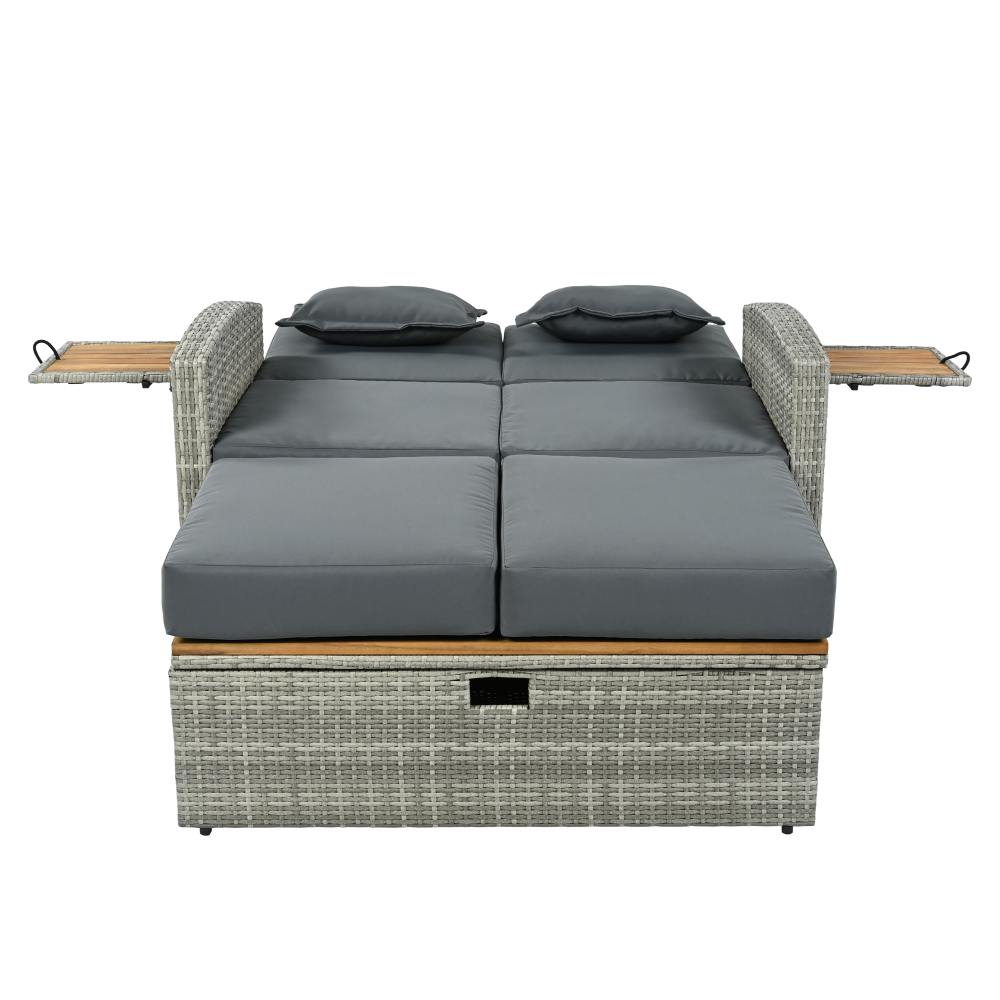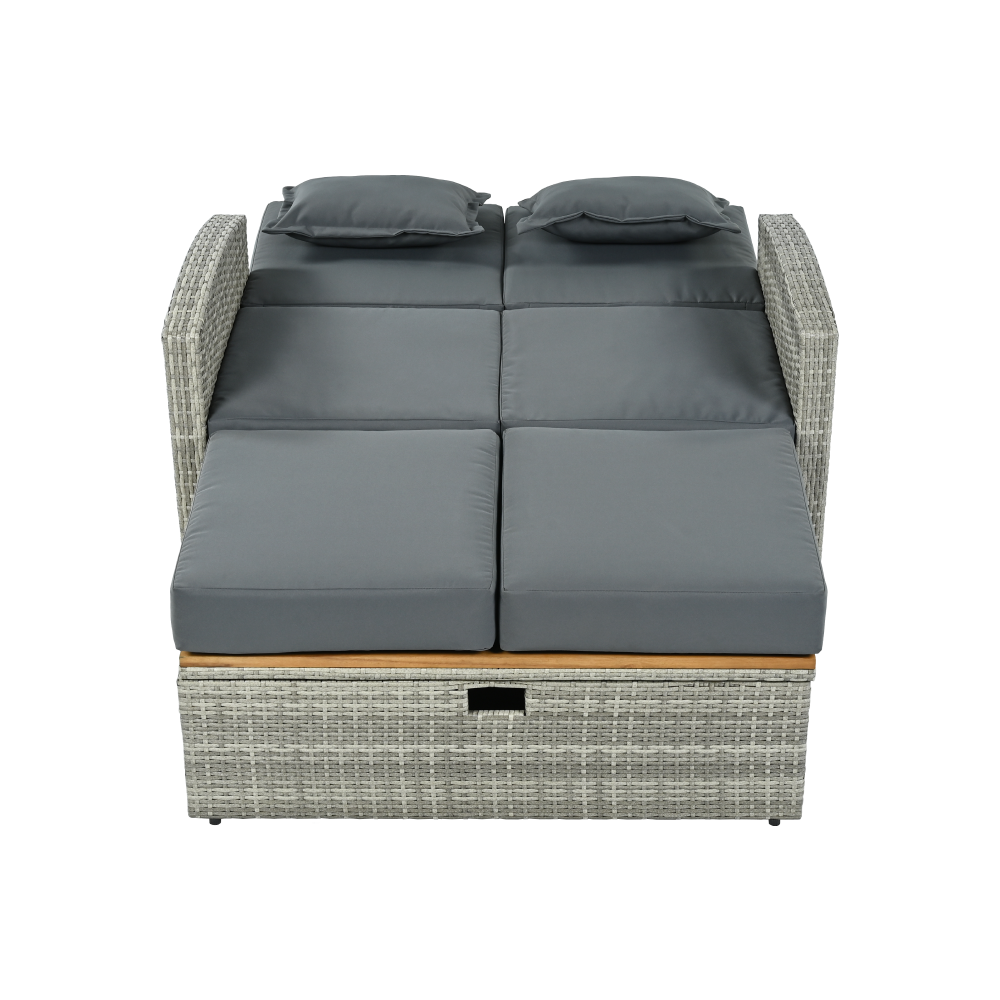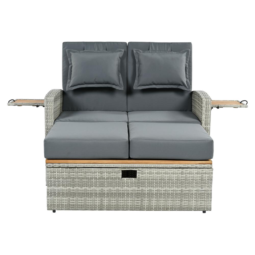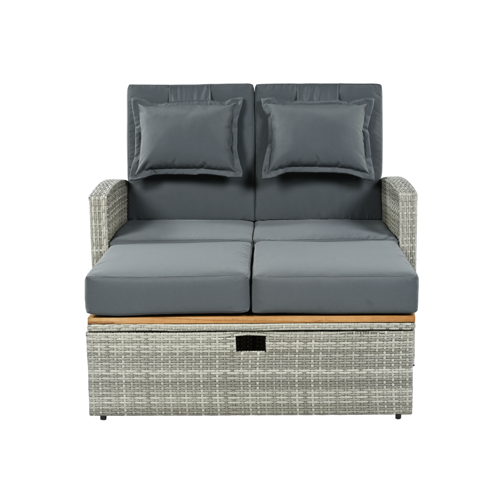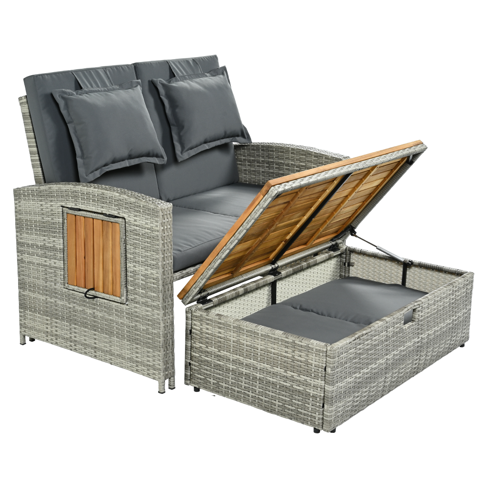 Materiál: technický ratan/oceľ/látka/akáciové drevoOderuodolnosť textílie podľa testu Martindale: 95 000 oderovFarba: sivá/prírodnáRozmery pohovka (ŠxHxV): 115x69x92 cmVýška sedu bez vankúša: 39 cmVýška sedu s vankúšom: 45 cmHĺbka sedu: 51,5 cmŠírka sedu: 103 cmRozmery lavica (ŠxHxV): 99x55,5x33 cmVýška sedu bez vankúša: 33 cmVýška sedu s vankúšom: 45 cmRozmery sklopeného stolíka (ŠxH): 29x29 cmVýška chrbta bez vankúša: 35 cmVýška chrbta s vankúšom: 29 cmŠírka chrbta: 103 cmRozmery rozloženia (ŠxD): 103x170 cmVýška opierky na ruku: 65 cmNosnosť: 130 kgHmotnosť: 32 kg2-dielna súpravaPohovkaLavica2x sklápacie príručné stolíkyPolohovacia opierka chrbta4 pozície sklápania opierky chrbtaS opierkami rúkDodávané s vankúšmiSnímateľný a vodoodolný poťahPoťahy je možné prať pri teplote 30 °CPoťahy nesušte v sušičke, nebieľte, nečistite chemicky a nežehliteOtváranie veka lavice pomocou hydraulického piestuVhodná na záhradné náradie, hračky, vankúše, deky, sedenieLavicu je možné zasunúť pod pohovkuVšestranné využitieModerný dizajnPrírodný dizajnVhodný do exteriéruOdolný voči poveternostným podmienkamOdporúčame výrobok chrániť pred nepriaznivými poveternostnými podmienkami, aby sa predĺžila životnosť výrobkuDodávané v demonte