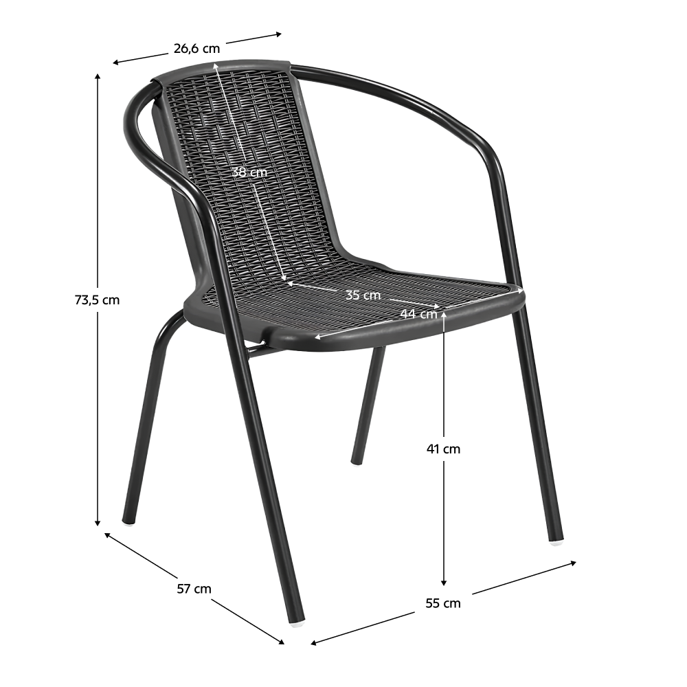 Materiál: kov/plastFarba: čiernaRozmery (ŠxHxV): 52x57x72 cmVýška sedu: 41 cmHĺbka sedu: 36 cmŠírka sedu: 42 cmŠírka opierky chrbta: 26,6 cmVýška opierky chrbta: 48,5 cmNosnosť: 150 kgHmotnosť: 3 kgStohovateľnéZáhradnéModerný dizajnĽahké skladovanieJednoduchá údržbaDodávané v monte