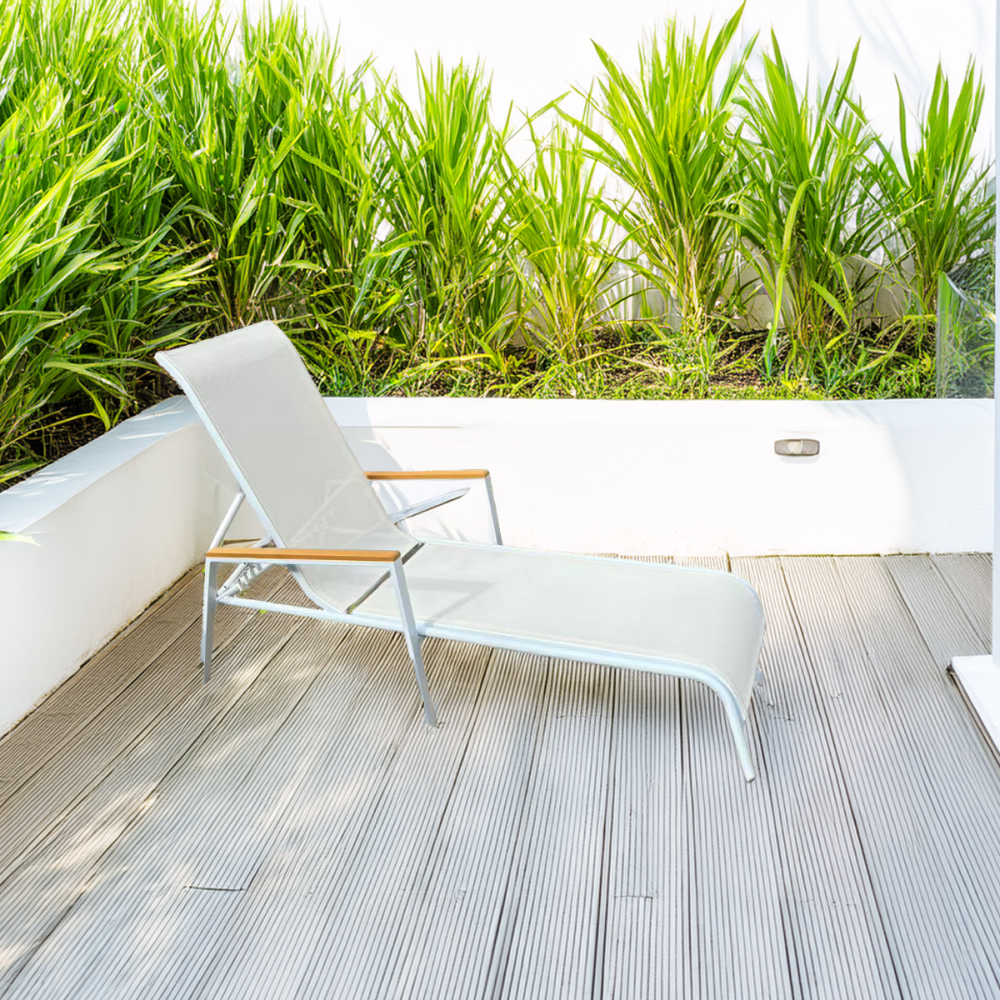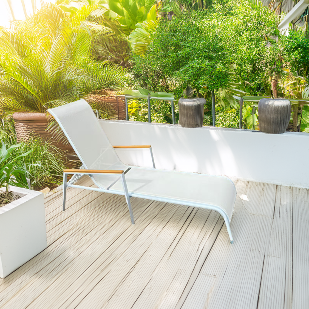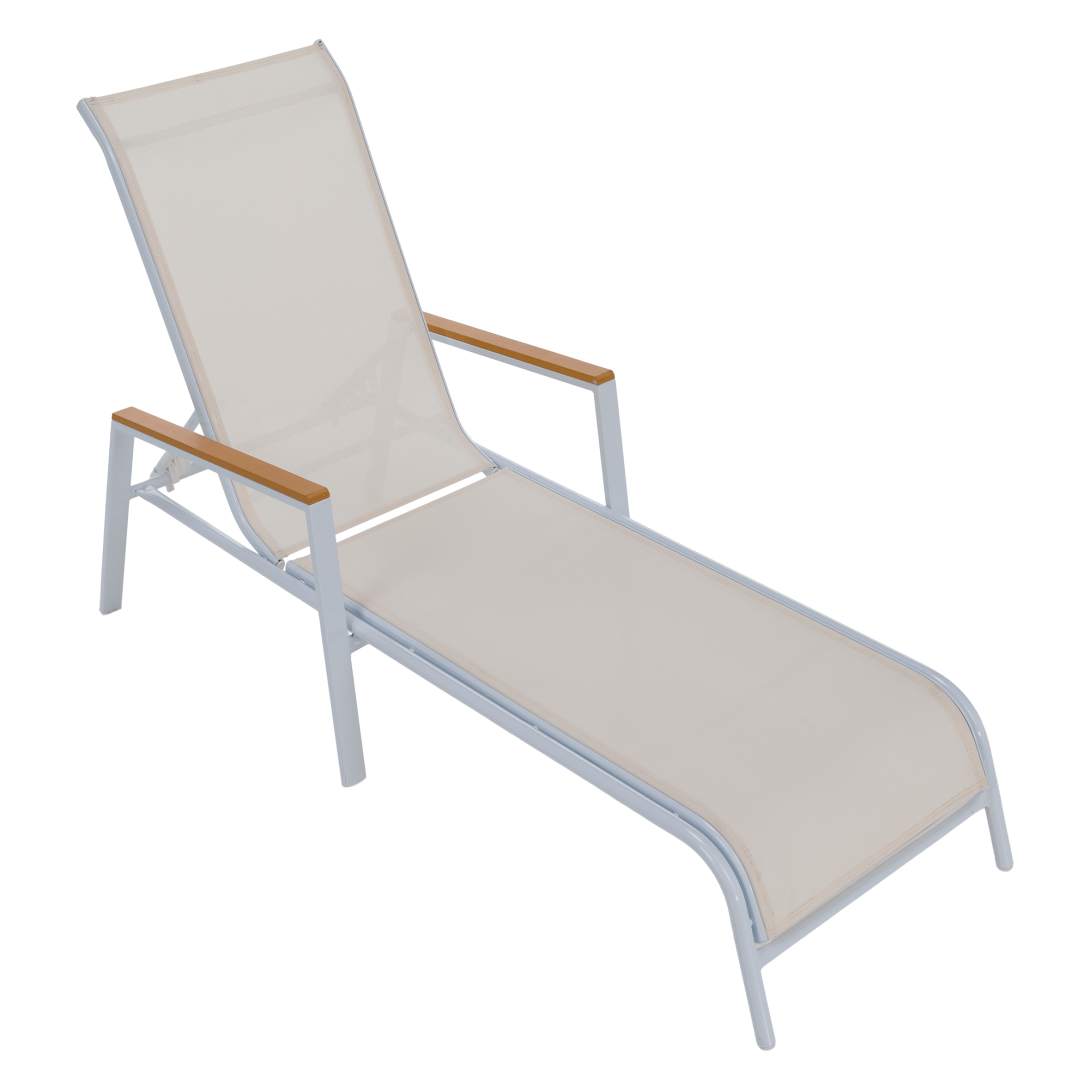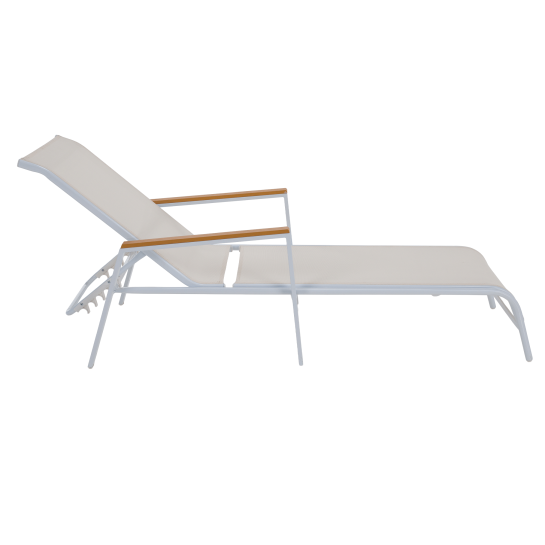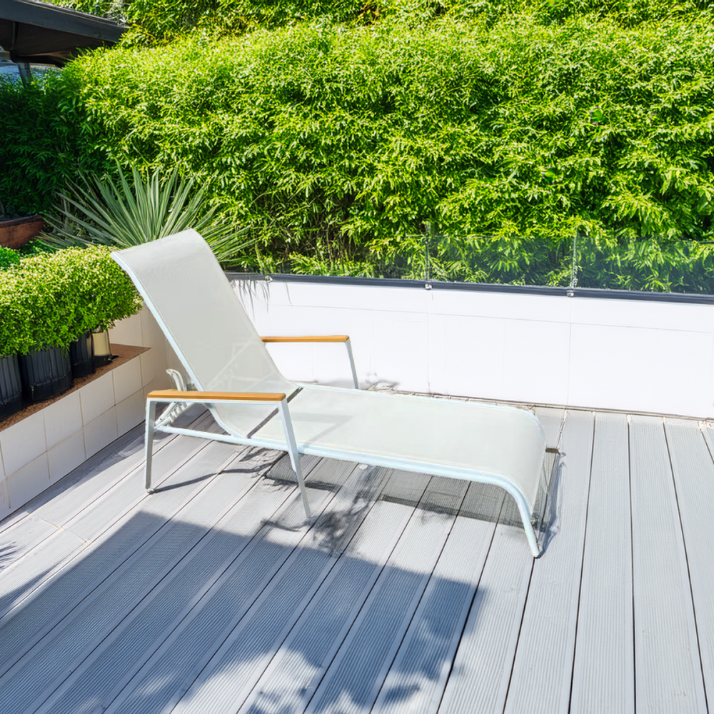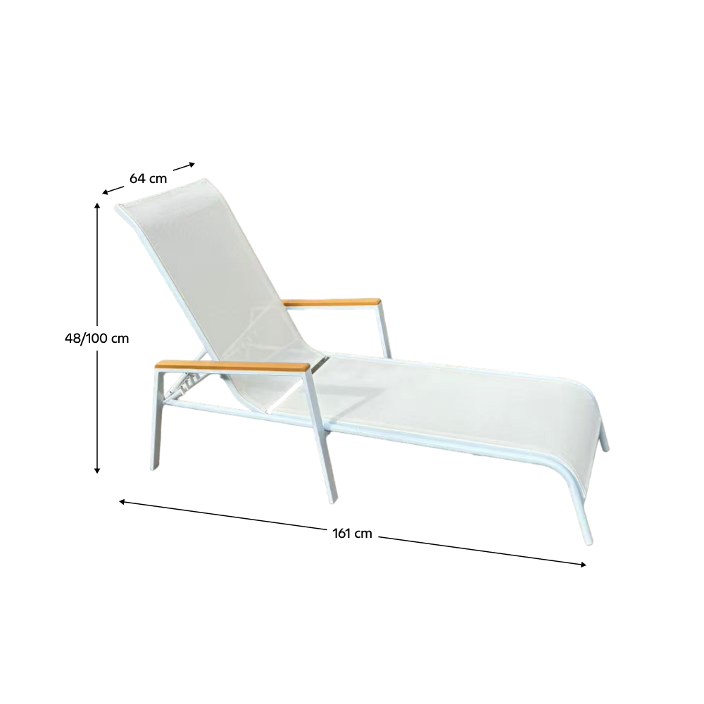 Materiál: oceľ/umelá textília/polywoodFarba: biela/dubRozmery (ŠxHxV): 64x161x48/100 cmVýška sedu: 28 cmHĺbka sedu: 104 cmCelková hĺbka po sklopení: 195 cmNosnosť: 100 kgZahradnéStohovateľnéPolohovacie5 pozícií sklápania operadlaS opierkami rúkDodávané v monte