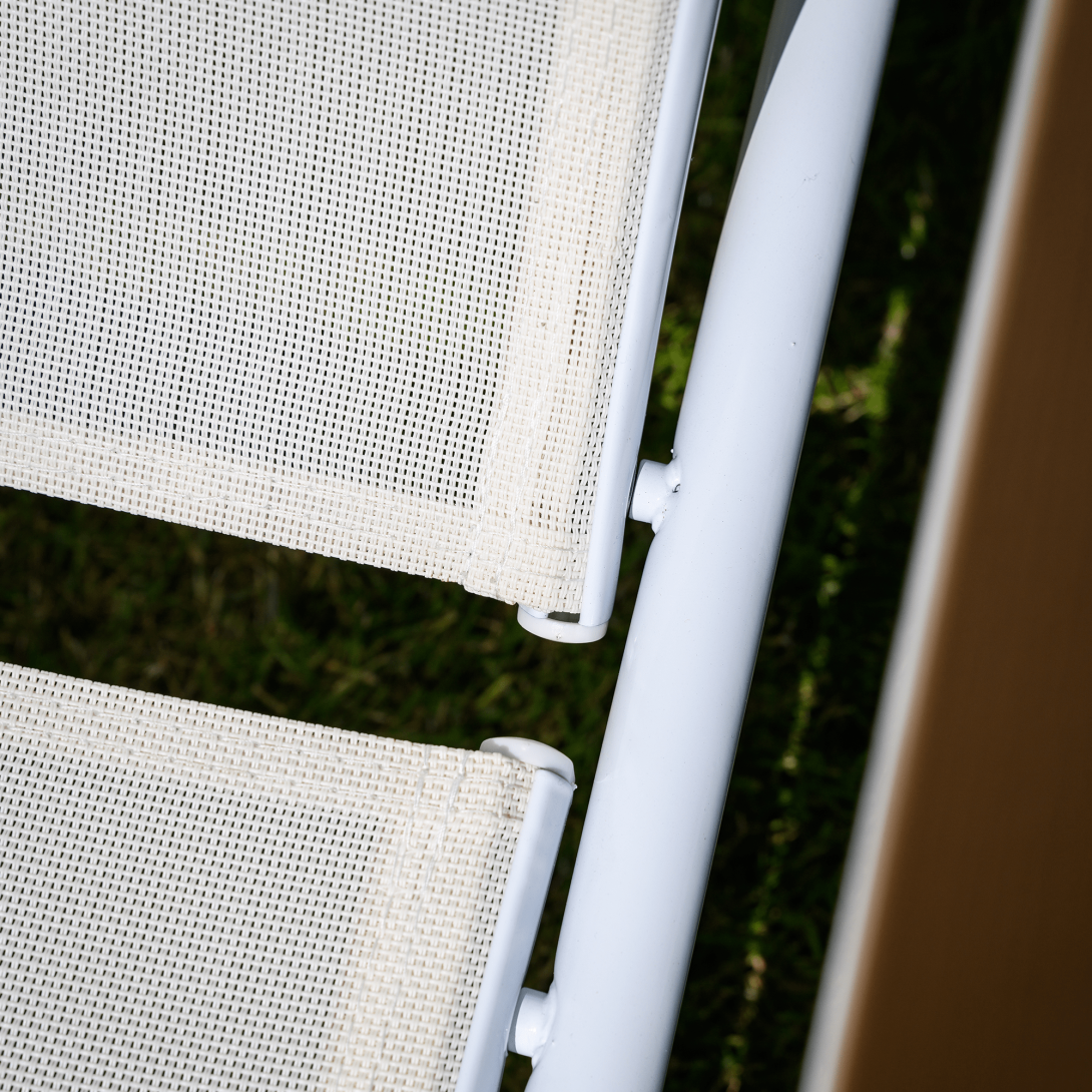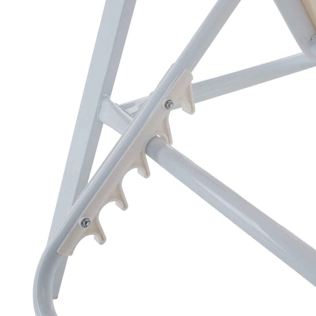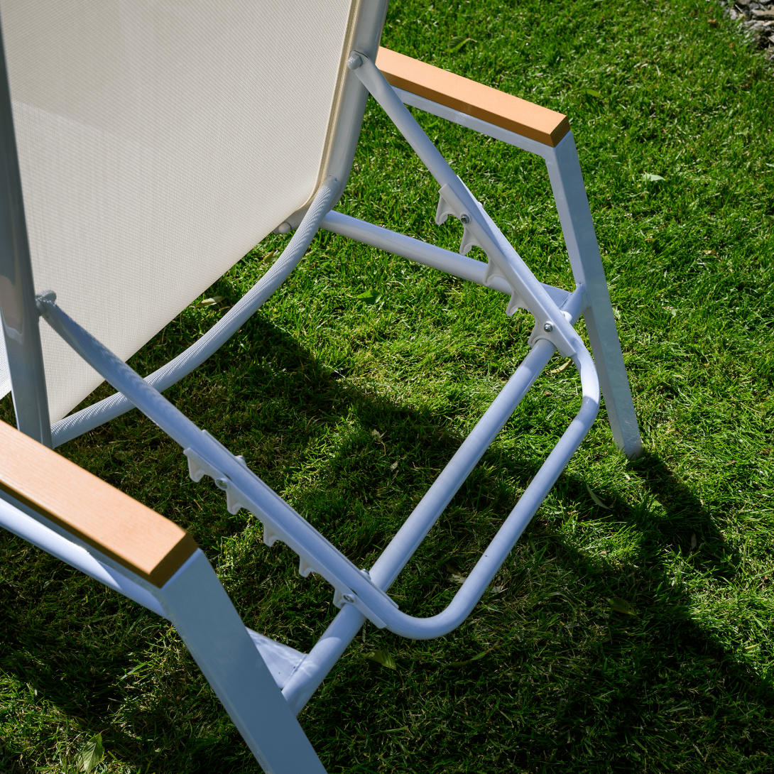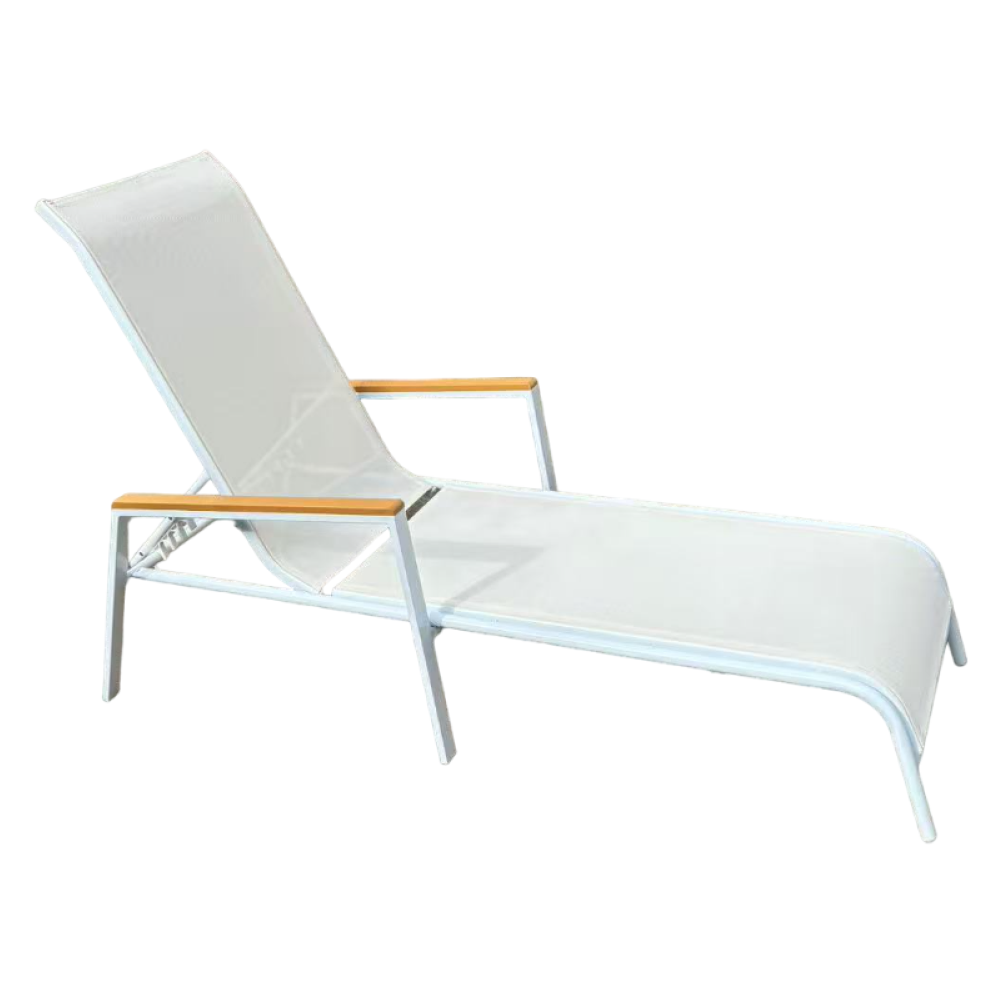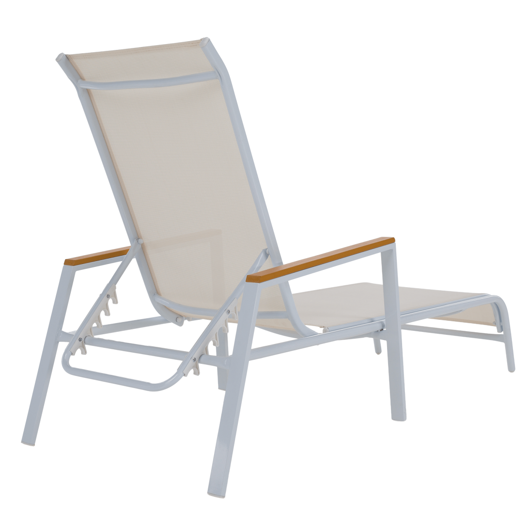 Materiál: oceľ/umelá textília/polywoodFarba: biela/dubRozmery (ŠxHxV): 64x161x48/100 cmVýška sedu: 28 cmHĺbka sedu: 104 cmCelková hĺbka po sklopení: 195 cmNosnosť: 100 kgZahradnéStohovateľnéPolohovacie5 pozícií sklápania operadlaS opierkami rúkDodávané v monte