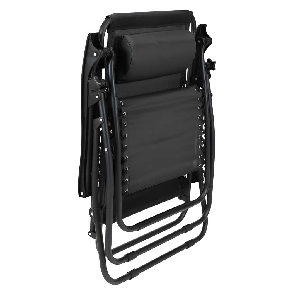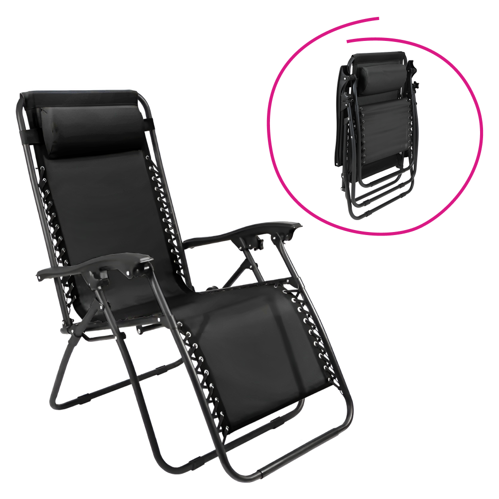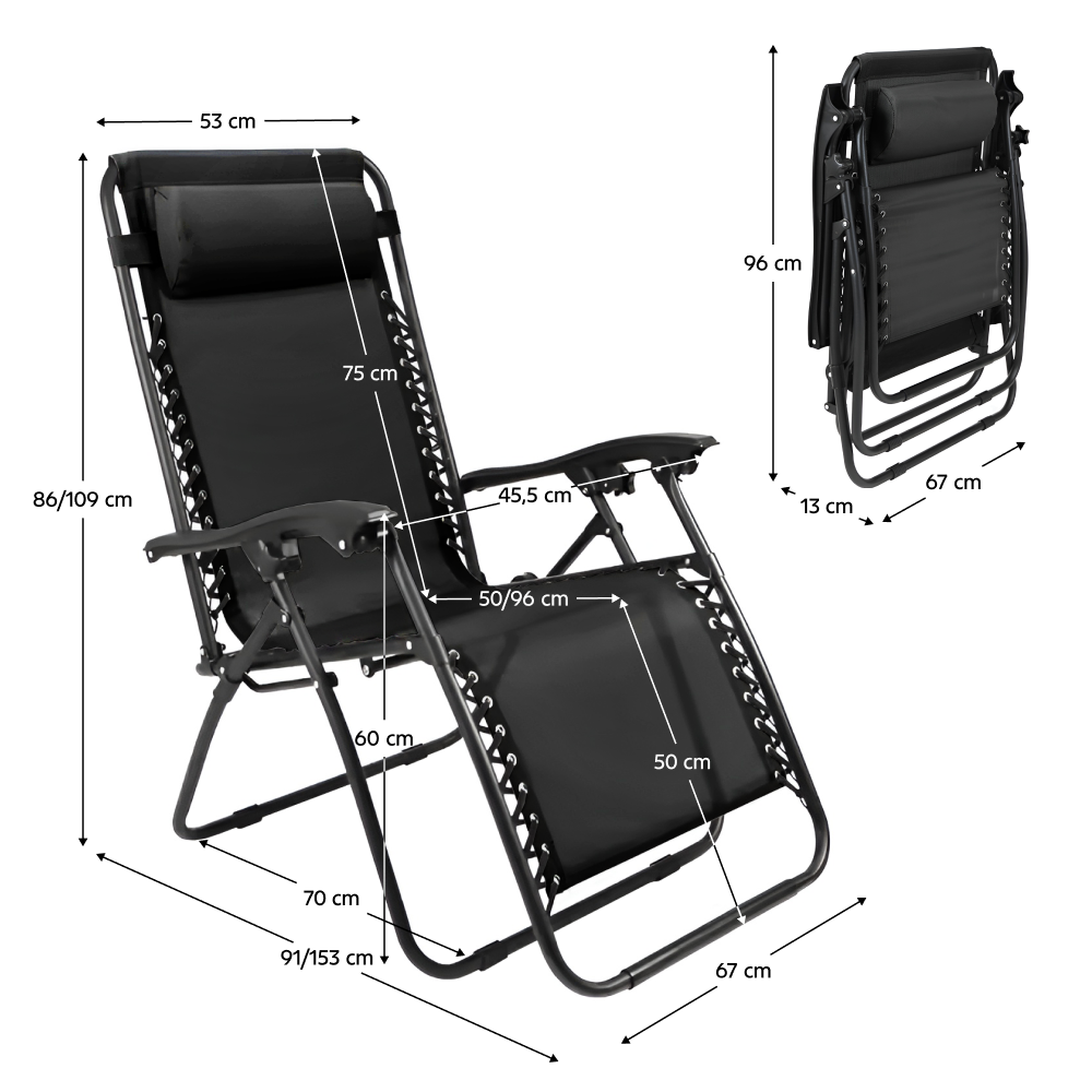Materiál: umelá textília/oceľFarba: čiernaRozmery (ŠxHxV): 57x96/147x87/110 cmRozmery po zložení (ŠxHxV): 57x13x97 cmVýška sedu: 50 cmHĺbka sedu: 46/96 cmŠírka sedu: 47 cmŠírka opierky chrbta: 75 cmVýška opierky chrbta: 43 cmVýška opierky na ruku od zeme: 60 cmNosnosť: 100 kgHmotnosť: 5,75 kgSkladaciePolohovacieS 5 stupňami polohovaniaMäkká opierka hlavyPraktickéModerný dizajnDodávané v monte