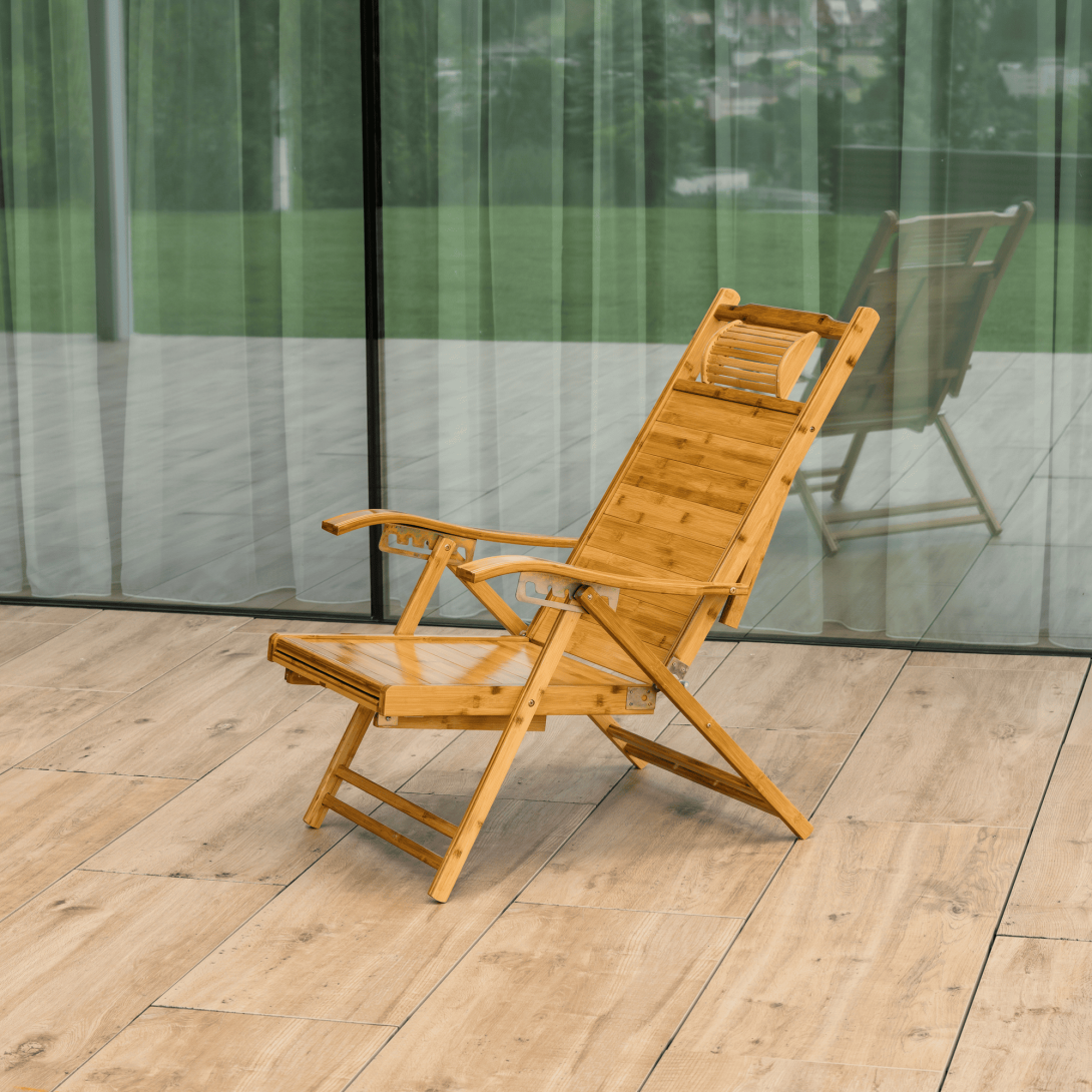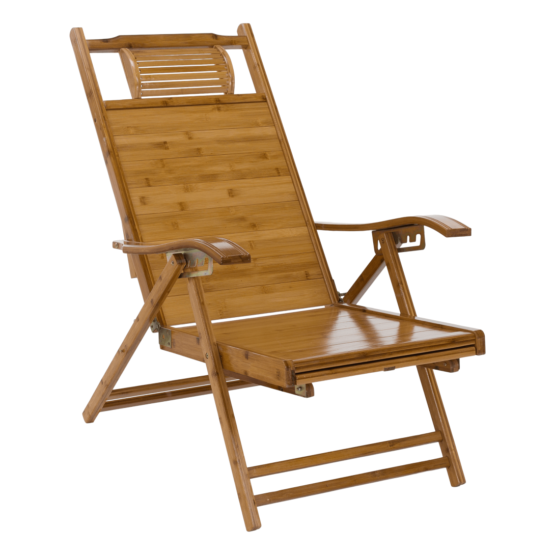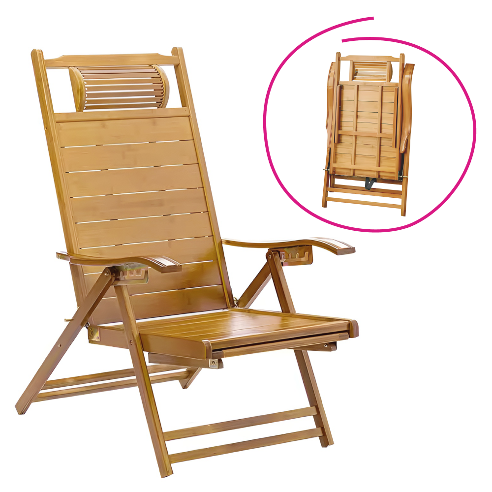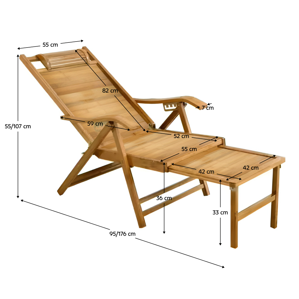 Materiál: masívne bambusové drevoFarba: prírodnáRozmery (ŠxHxV): 55x95-176x55-107 cmVýška sedu: 36 cmHĺbka sedu: 52 cmŠírka sedu: 55 cmVýška chrbtovej opierky: 82 cmŠírka chrbtovej opierky: 55 cmNosnosť: 100 kgHmotnosť: 13 kgZáhradnéSkladaciePolohovacie5 úrovní polohovaniaOpierka hlavyS opierkami rúkKresloLežadloS výsuvnou podnožouRozmery podnož (ŠxH): 42x42 cmPraktickéModerný dizajnDodávané v monte