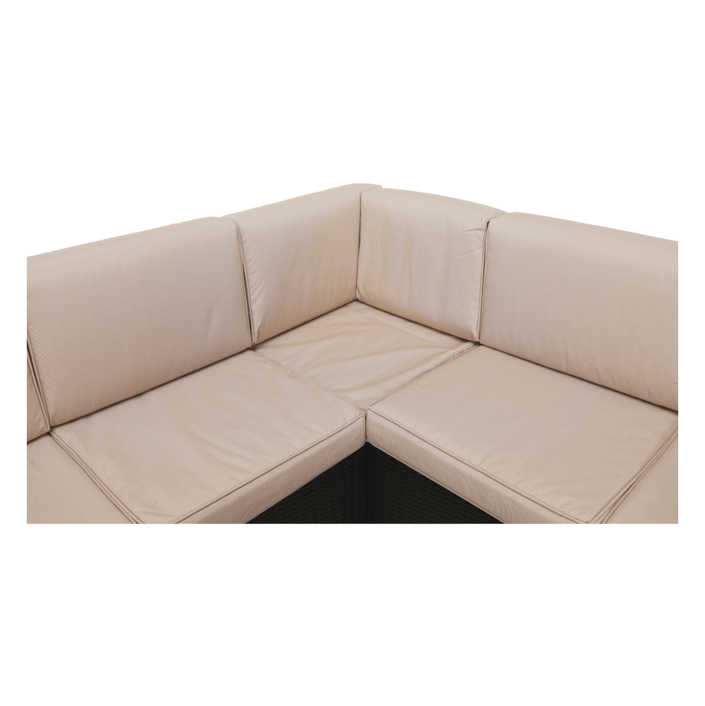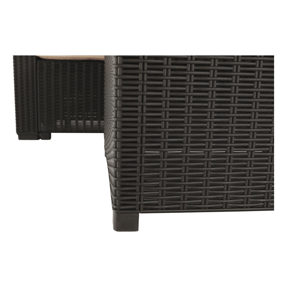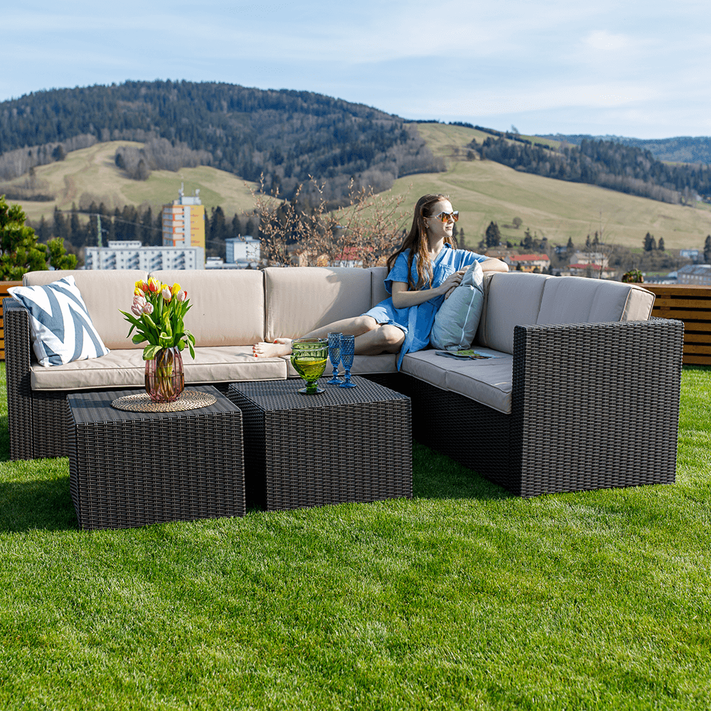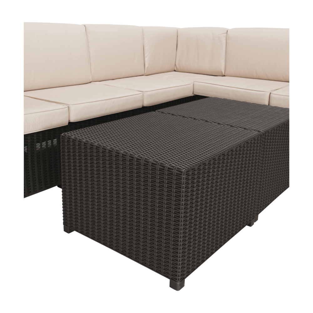 Materiál: umelý ratan/látka/penaFarba: hnedá/béžováOderuodolnosť textílie podľa testu Martindale: 95 000 oderovRozmery roh (ŠxHxV): 246,6/190,6x69,5x67,5/80 cmVýška sedu: 41,5 cmHĺbka sedu: 51 cmRozmery stôl (ŠxHxV): 56x56x40 cmHrúbka vankúša: 9 cm3-dielny setS vankúšmi2 konferenčné stolíkyDodávané v demonte.