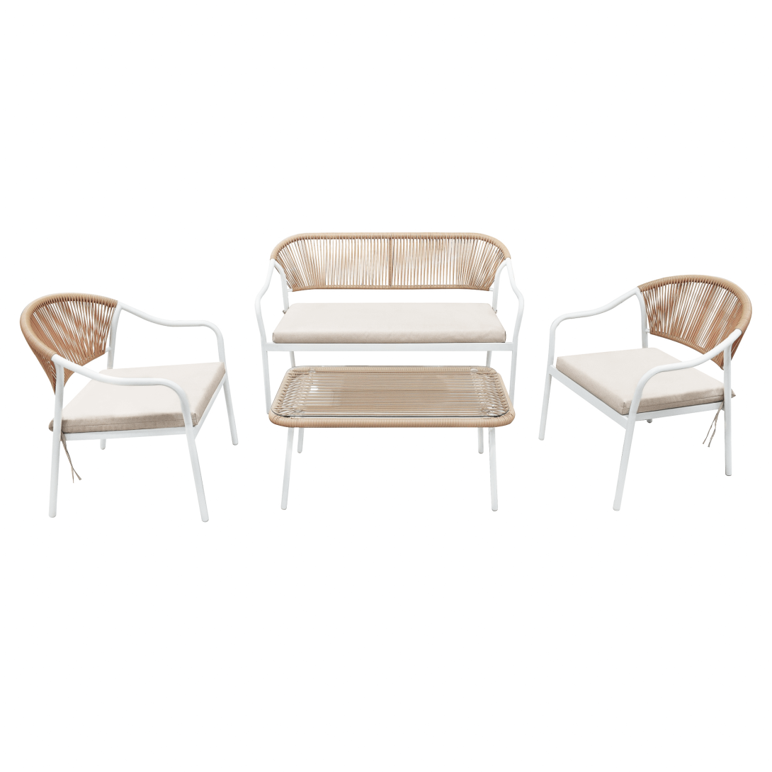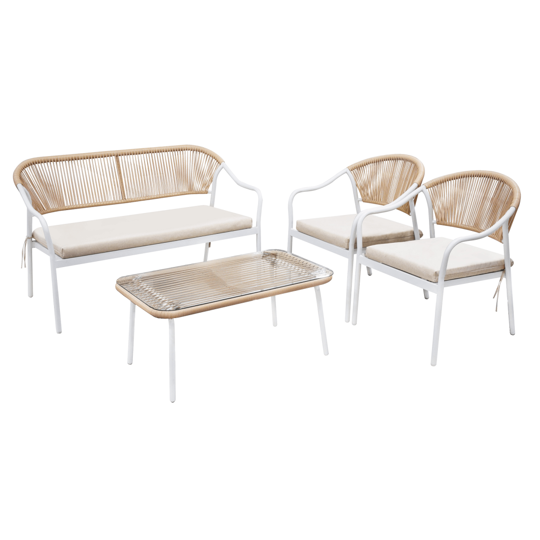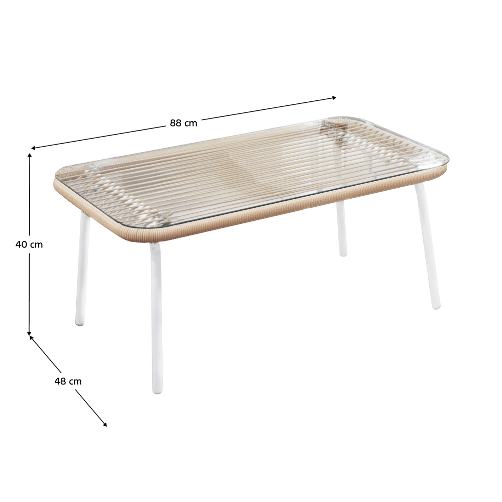 Materiál konštrukcia: oceľFarba: bielaMateriál výplet: technický ratanFarba: béžováMateriál podušky: vodeodolná látkaFarba: béžováMateriál doska stola: tvrdené skloOderuodolnosť textílie podľa testu Martindale: 95 000 oderovRozmery stola (ŠxHxV): 88x48x40 cmNosnosť stola: 20 kgHrúbka skla: 5 mmRozmery stoličky (ŠxHxV): 61x63x77 cmVýška sedu: 43/38 cmHĺbka sedu: 52 cmVýška od zeme po opierku na ruku: 59 cmRozmery vankúša (ŠxV): 52x45 cmHrúbka vankúša: 4,5 cmNosnosť na osobu: 90 kgRozmery 2 sedu (ŠxHxV): 123x63x78 cmVýška sedu: 39/44 cmHĺbka sedu: 51,5 cmRozmery vankúša (ŠxV): 51,5x107 cmHrúbka vankúša: 4,5 cmS vankúšmi4-dielna súpravaJeden stôlDve stoličkyJeden 2-sedDodávané v monte