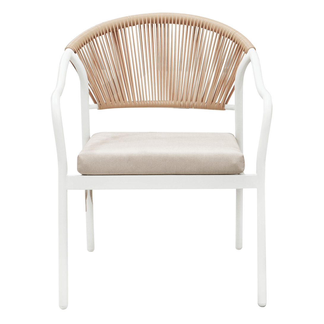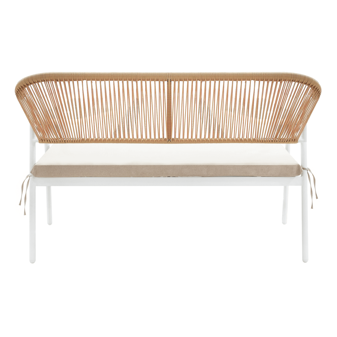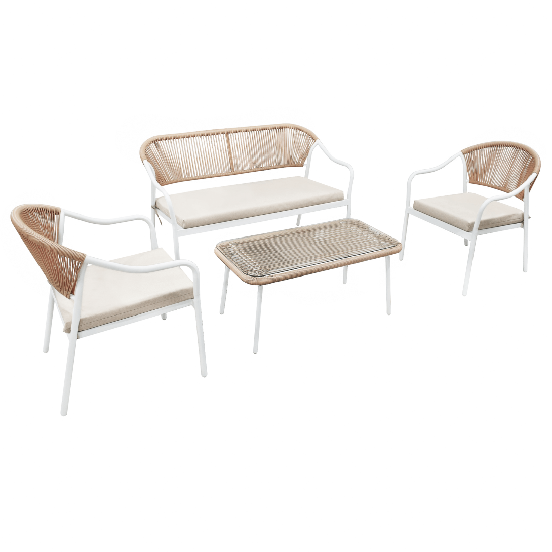 Materiál konštrukcia: oceľFarba: bielaMateriál výplet: technický ratanFarba: béžováMateriál podušky: vodeodolná látkaFarba: béžováMateriál doska stola: tvrdené skloOderuodolnosť textílie podľa testu Martindale: 95 000 oderovRozmery stola (ŠxHxV): 88x48x40 cmNosnosť stola: 20 kgHrúbka skla: 5 mmRozmery stoličky (ŠxHxV): 61x63x77 cmVýška sedu: 43/38 cmHĺbka sedu: 52 cmVýška od zeme po opierku na ruku: 59 cmRozmery vankúša (ŠxV): 52x45 cmHrúbka vankúša: 4,5 cmNosnosť na osobu: 90 kgRozmery 2 sedu (ŠxHxV): 123x63x78 cmVýška sedu: 39/44 cmHĺbka sedu: 51,5 cmRozmery vankúša (ŠxV): 51,5x107 cmHrúbka vankúša: 4,5 cmS vankúšmi4-dielna súpravaJeden stôlDve stoličkyJeden 2-sedDodávané v monte