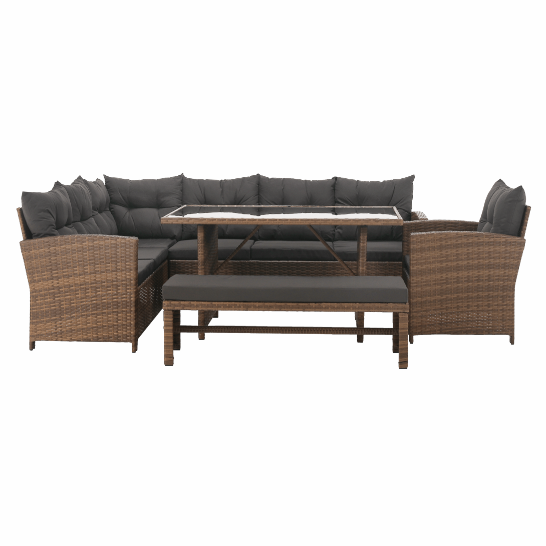 Materiál: technoratan/látka/kov/tvrdené skloOderuodolnosť textílie podľa testu Martindale: 95 000 oderovFarba: svetlohnedá/sivohnedáRozmery roh (ŠxHxV): 226/173x65x75 cmRozmery kreslo (ŠxHxV): 65x66x75 cmRozmery lavica (ŠxHxV): 120x35x39 cmRozmery stôl (ŠxHxV): 130x75x68 cmVýška sedenia: 40 cmHĺbka sedenia: 33/54 cmNosnosť na osobu: 90 kgHrúbka vankúša: 7 cm4-dielnaRohKresloLavicaStôlJedálenský stôl s tvrdeným sklom v hrúbke 5 mmUniverzálne prevedenieMožnosť zmontovať s rohom na pravej alebo ľavej straneDodávané s vankúšmiRozmery vankúša (ŠxV): 49x54 cmVodeodolný poťahDodávané v demonte