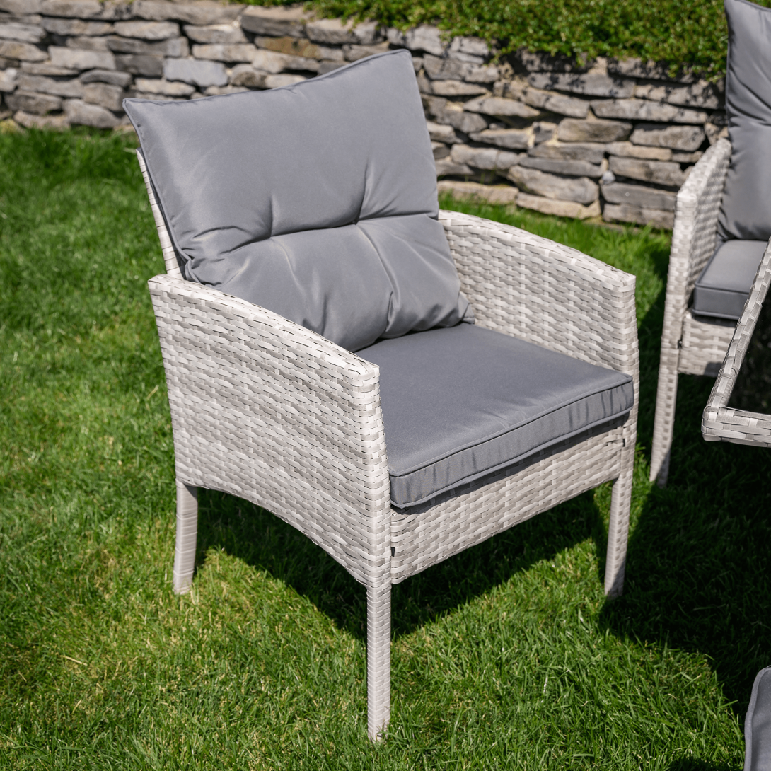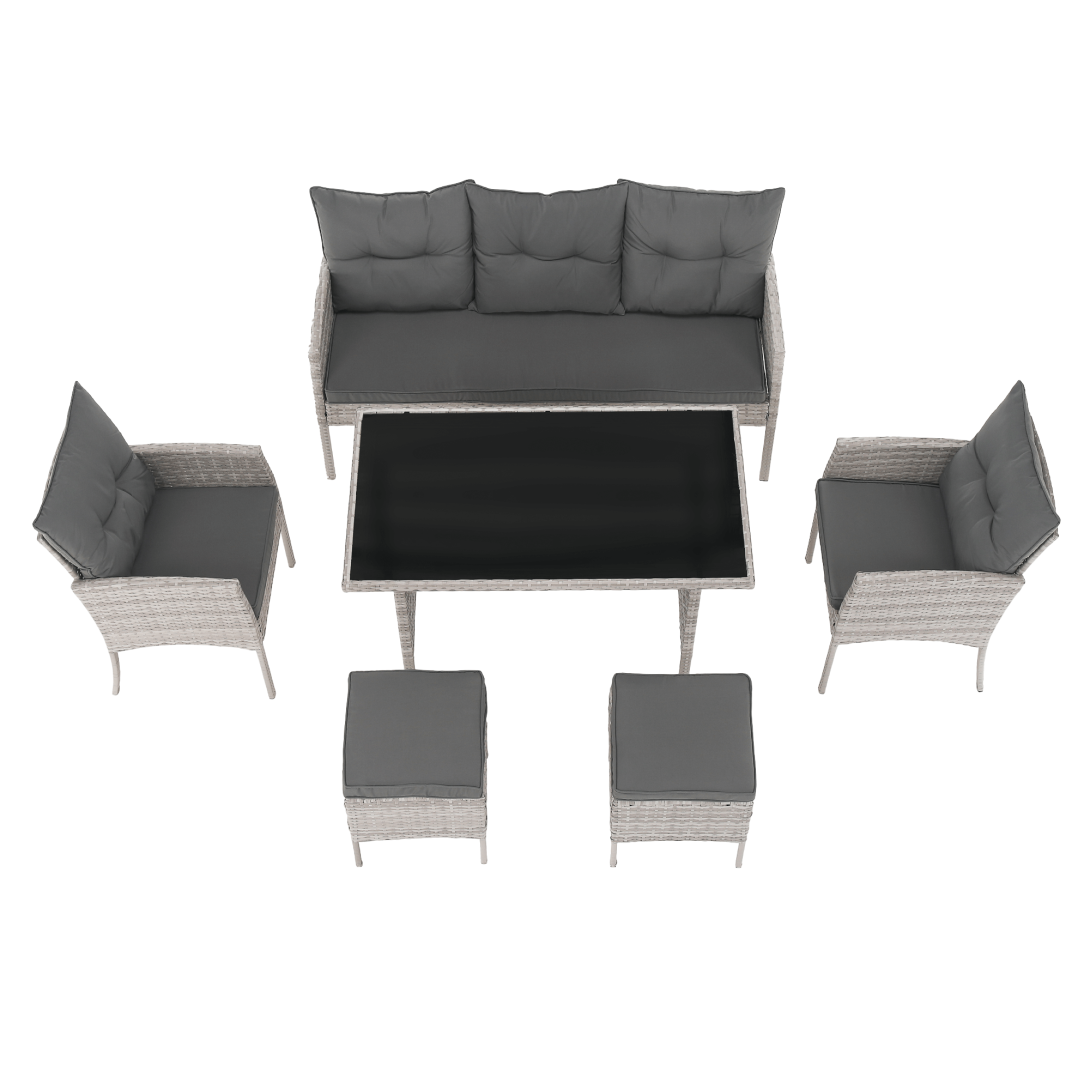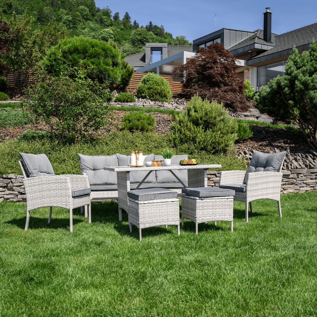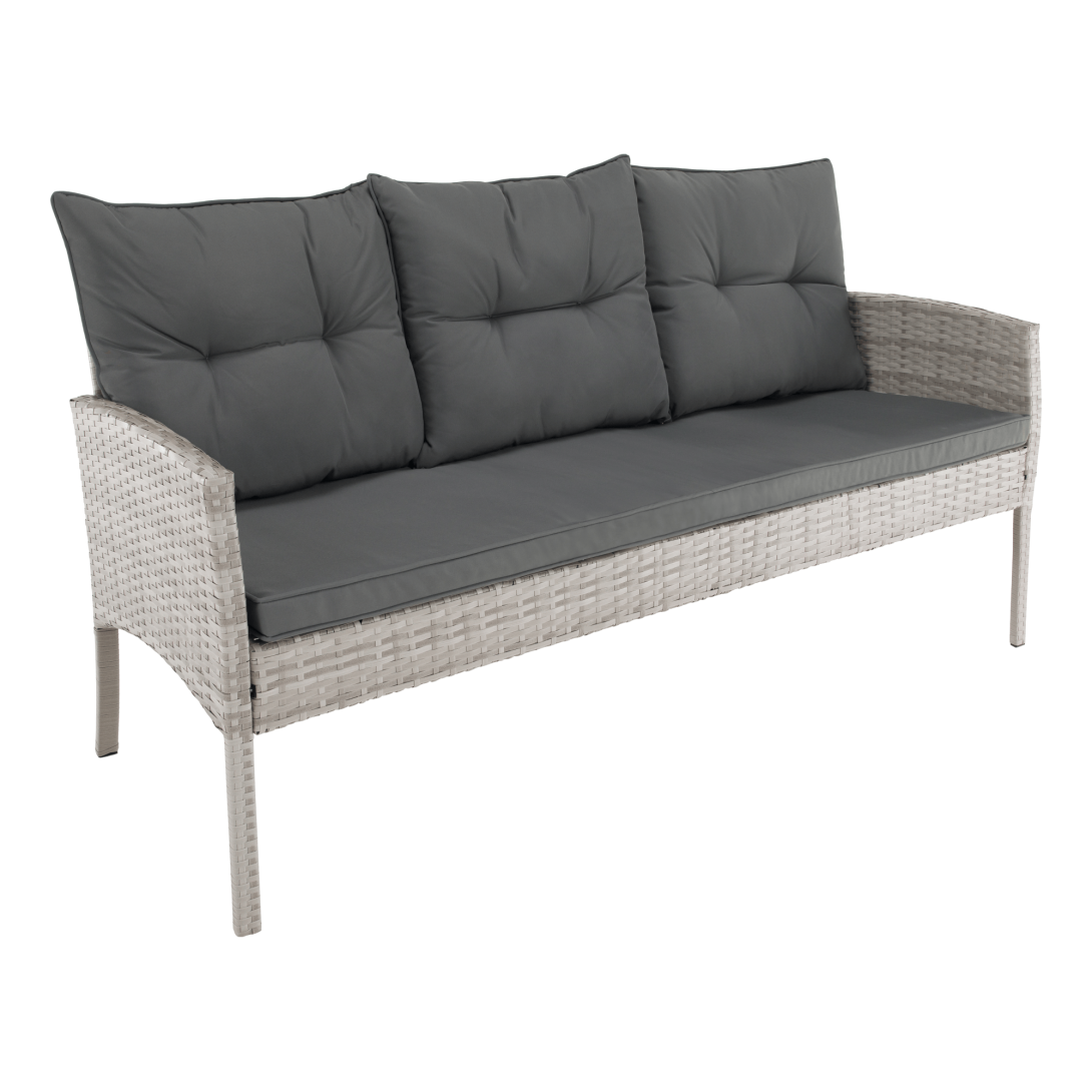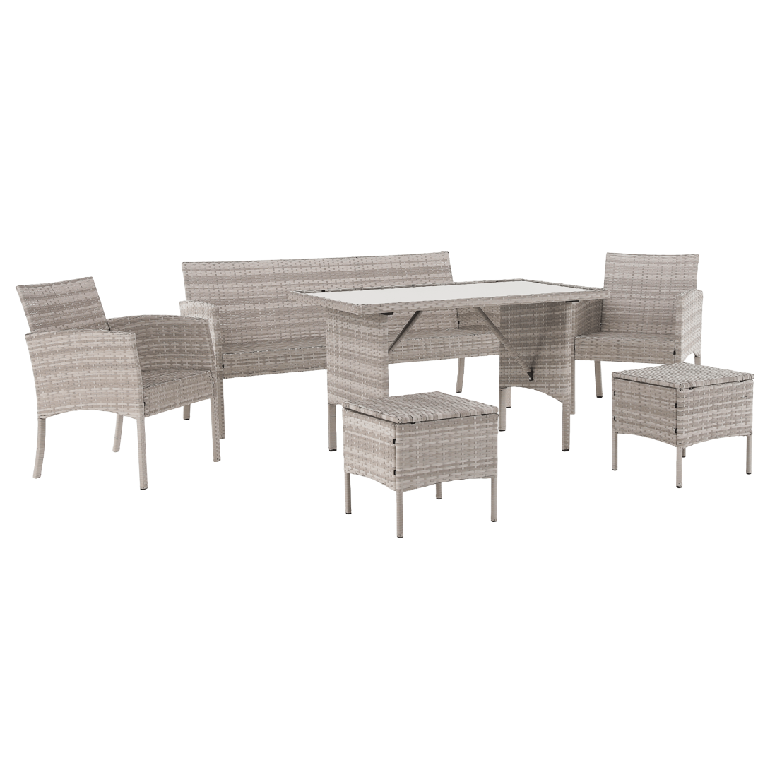Materiál: technoratan/látka/kov/tvrdené skloOderuodolnosť textílie podľa testu Martindale: 95 000 oderovFarba: svetlosiváRozmery trojsed (ŠxHxV): 161x55x77/86 cmHĺbka sedu: 38/47 cmRozmery stôl (ŠxHxV): 120x70x70 cmRozmery kreslo (ŠxHxV): 57x57x77/86 cmHĺbka sedu kresla: 36/47 cmRozmery taburet (ŠxHxV): 39,5x39,5x45 cmVýška sedu: 45 cmVýška chrbtovej opierky: 34 cmNosnosť na osobu :90 kgNosnosť stola :35 kgDodávané s vankúšmiHrúbka vankúša: 6 cm6-dielna súpravaTrojsed2x kreslo2x taburetJedálenský stôlS tvrdeným sklom (5 mm)Poťah je vodeodolnýDodávané v demonte