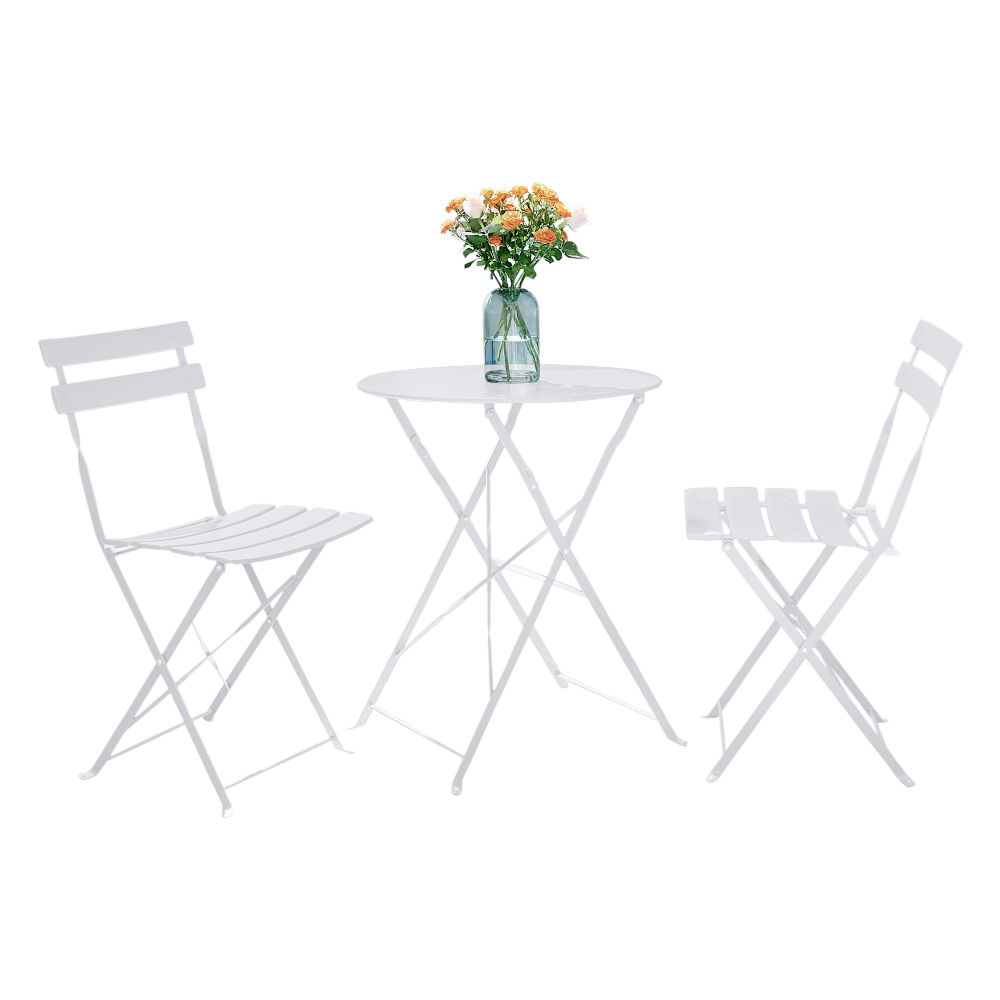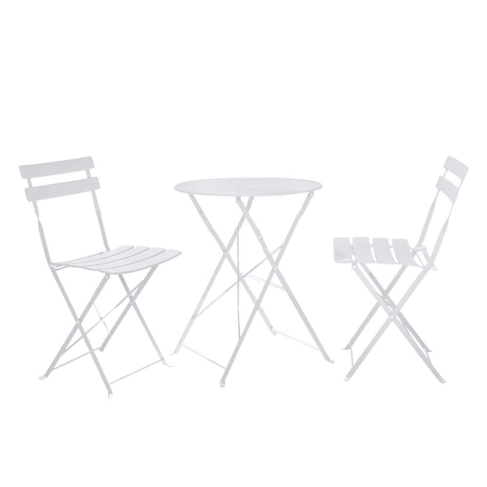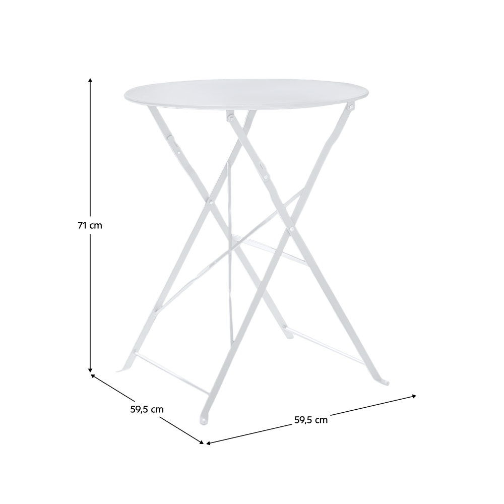 Materiál: oceľFarba: bielaRozmery stola (ŠxHxV): 59,5x59,5x71 cmRozmery stoličky (ŠxHxV): 42x51x81 cmVýška sedu: 45 cmHĺbka sedu: 30/38 cmŠírka sedu: 42 cmVýška chrbtovej opierky: 41 cmŠírka chrbtovej opierky: 42 cmNosnosť stola: 60 kgNosnosť stoličky: 100 kg3-dielna súprava1x stôl2x stoličkaSet je skladacíDodávané v monte