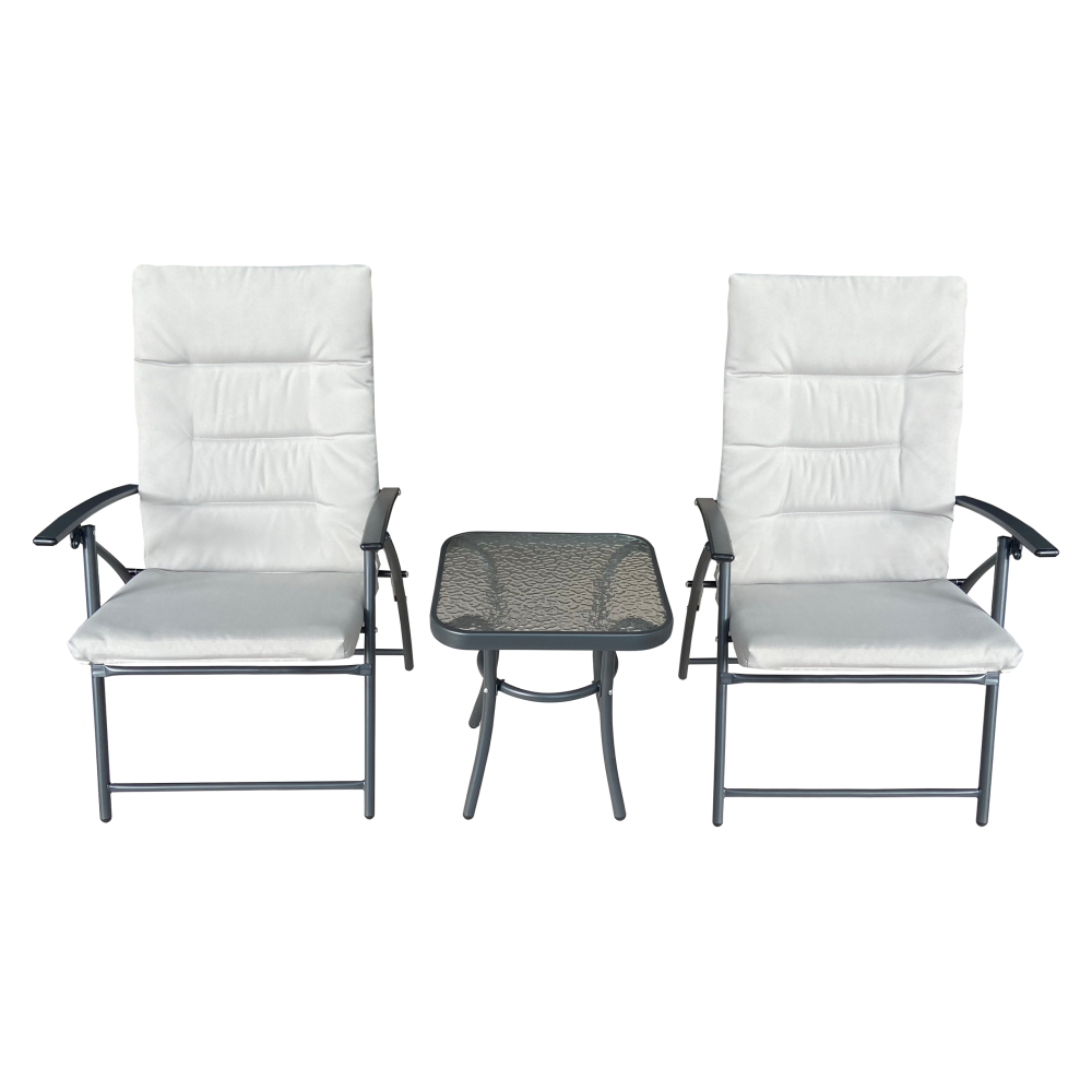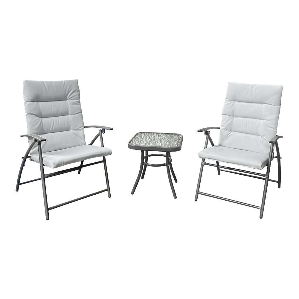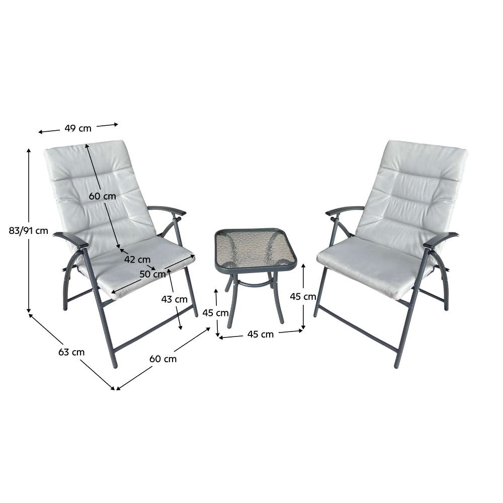 Materiál: látka/kovFarba: svetlosivá/tmavosiváOderuodolnosť textílie podľa testu Martindale: 95 000 oderovStôl (ŠxHxV): 45x45x45 cmKreslo (ŠxHxV): 60x63x83/91 cmVýška sedu: 43 cmHĺbka sedu: 42 cmŠírka sedu: 50 cmVýška chrbta: 60 cmŠírka chrbta: 49 cmNosnosť kresla: 90 kgNosnosť stola: 15 kgS vankúšmiPoťahy nie sú snímateľnéVodeodolnéHrúbka vankúša: 3 cm3-dielna súprava1x stôl2x stoličkaKreslá dodávané v monteStolík dodávaný v demonte