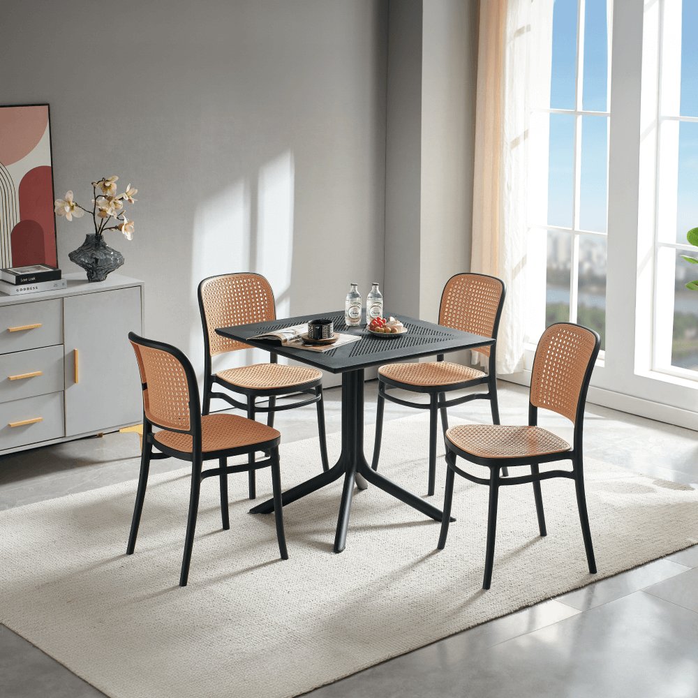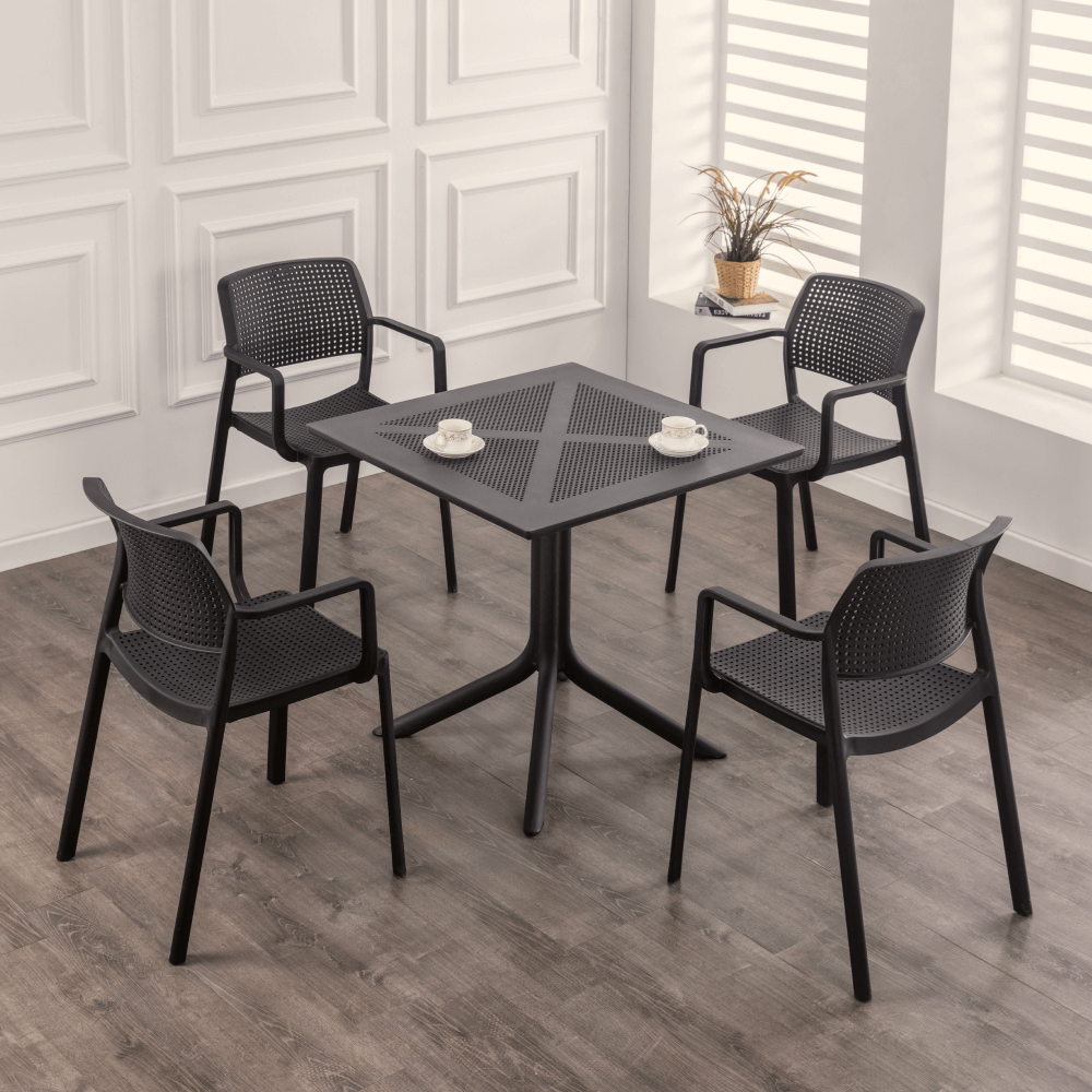Materiál: plastFarba: čiernaRozmery (ŠxHxV): 79,5x79,5x74,5 cmNosnosť: 50 kgHmotnosť: 10,5 kgJednoduchýPraktickýNa nožičkáchJedálenský/záhradný stôlVhodný do interiéru aj exteriéruStolovanie pre 4 ľudíDodávané v demonte