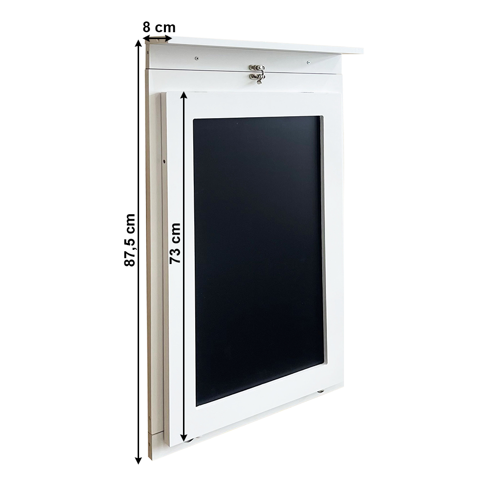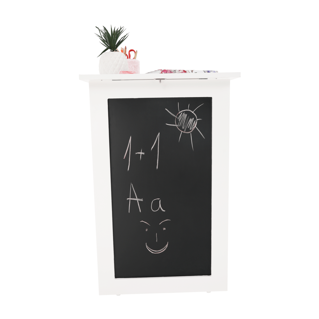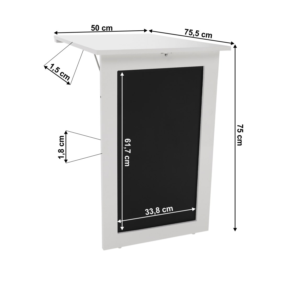 Materiál: MDF/kriedová tabuľaFarba: biela/čiernaRozmery zloženého stolíka (ŠxHxV): 50x8x87,5 cmRozmery rozloženého stolíka (ŠxHxV): 50x75,5x75 cmCelková šírka kriedovej tabule: 33,8 cmCelková dĺžka kriedovej tabule: 61,7 cmHrúbka dosky s tabuľou: 1,8 cmHrúbka vrchného plátu: 1,5 cmNosnosť: 18 kgSkladací stôl na stenuViacúčelový písací stôlMinimalistický dizajnTabuľa vhodná na písanie kriedouTabuľa nie je magnetickáVhodný do detskej izby aj pracovneVhodný aj do jedálne a obývačkyJednoduchý systém rozloženiaSo zaisťovacou západkouDodávaný v demonte