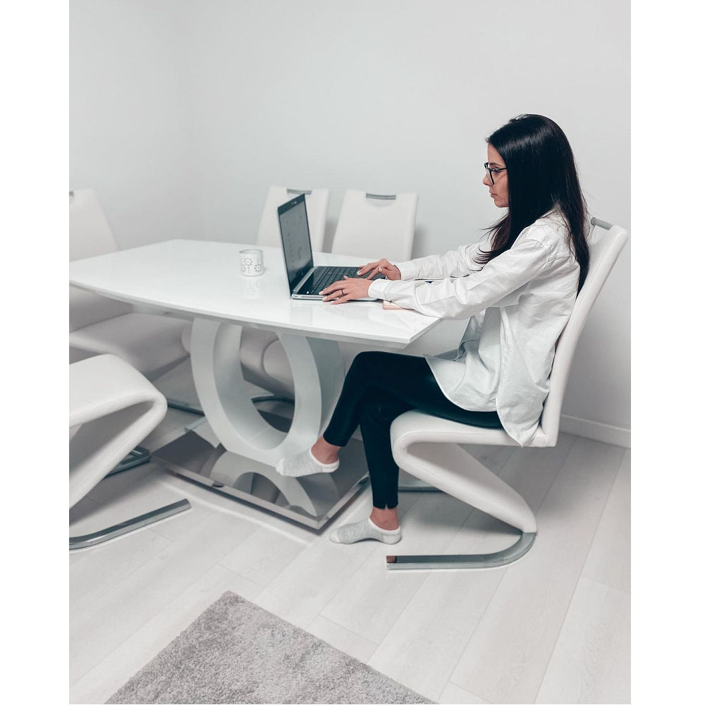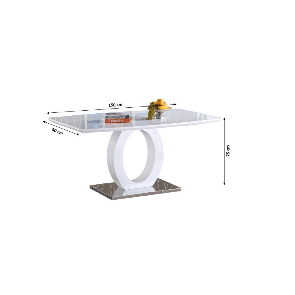 Jedálenský stôl, ZarniMateriál: MDF/nehrdzavejúca oceľFarba: biela vysoký leskRozmery (ŠxHxV): 150x80x75 cmVrchná časť: 40 mmSpodná časť: 30 mmDodávané v demonte